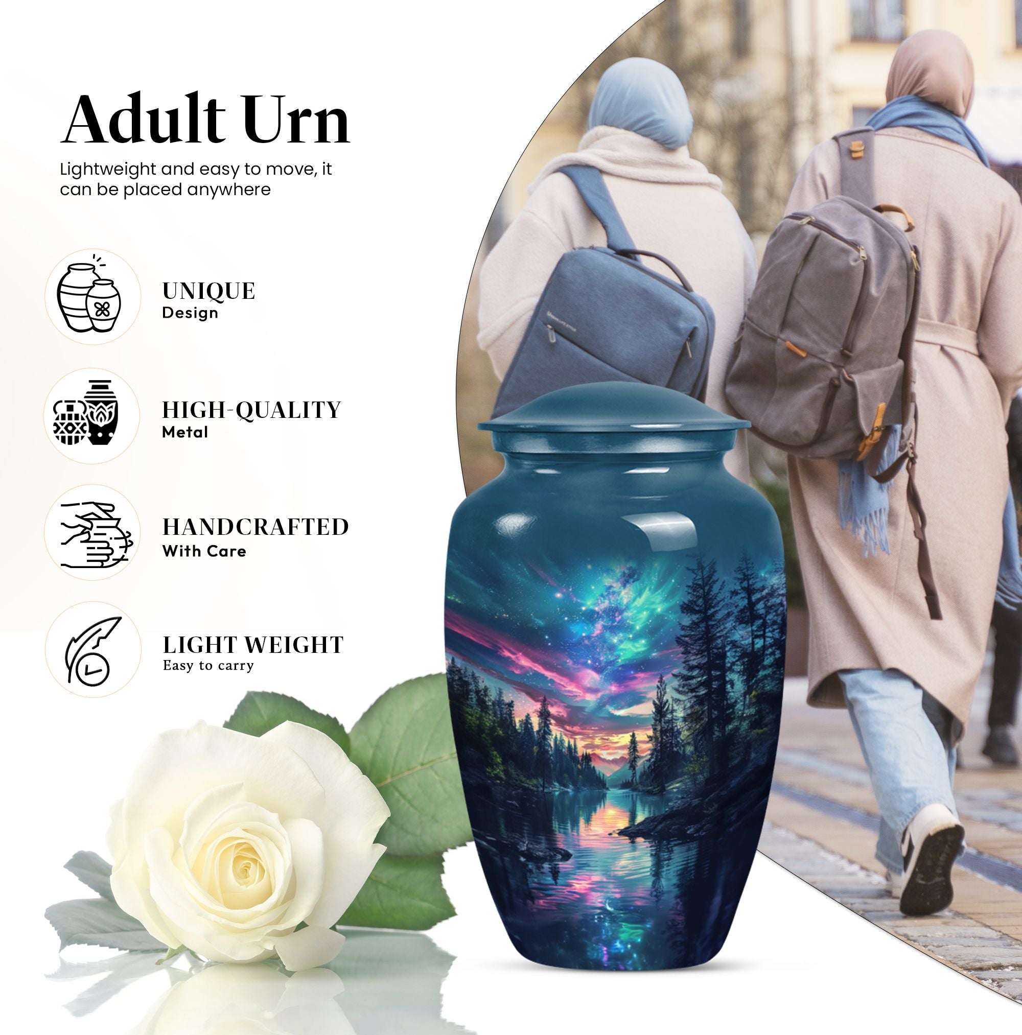 Crafted with care, this forest urn is available in both large and small sizes, suitable as an urn for ashes adult male, urn for ashes adult female, or as a funeral ashes urn for ceremonies and memorials. Its detailed design captures the spiritual beauty of the aurora lights over a forest landscape, offering comfort and reflection.