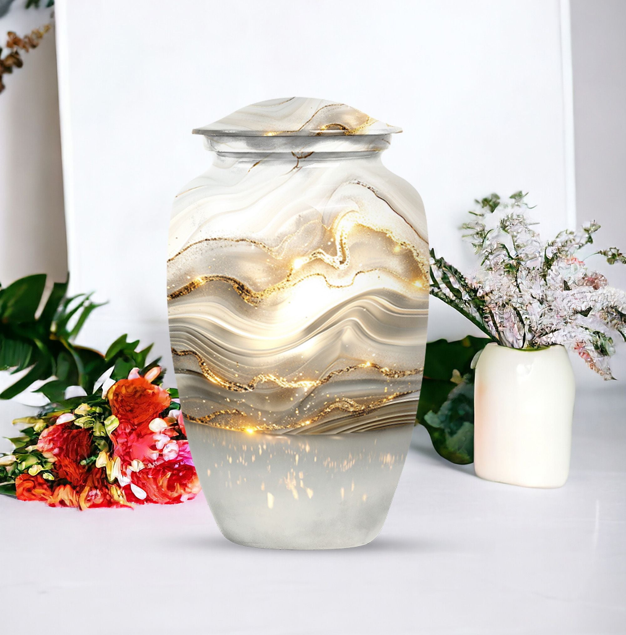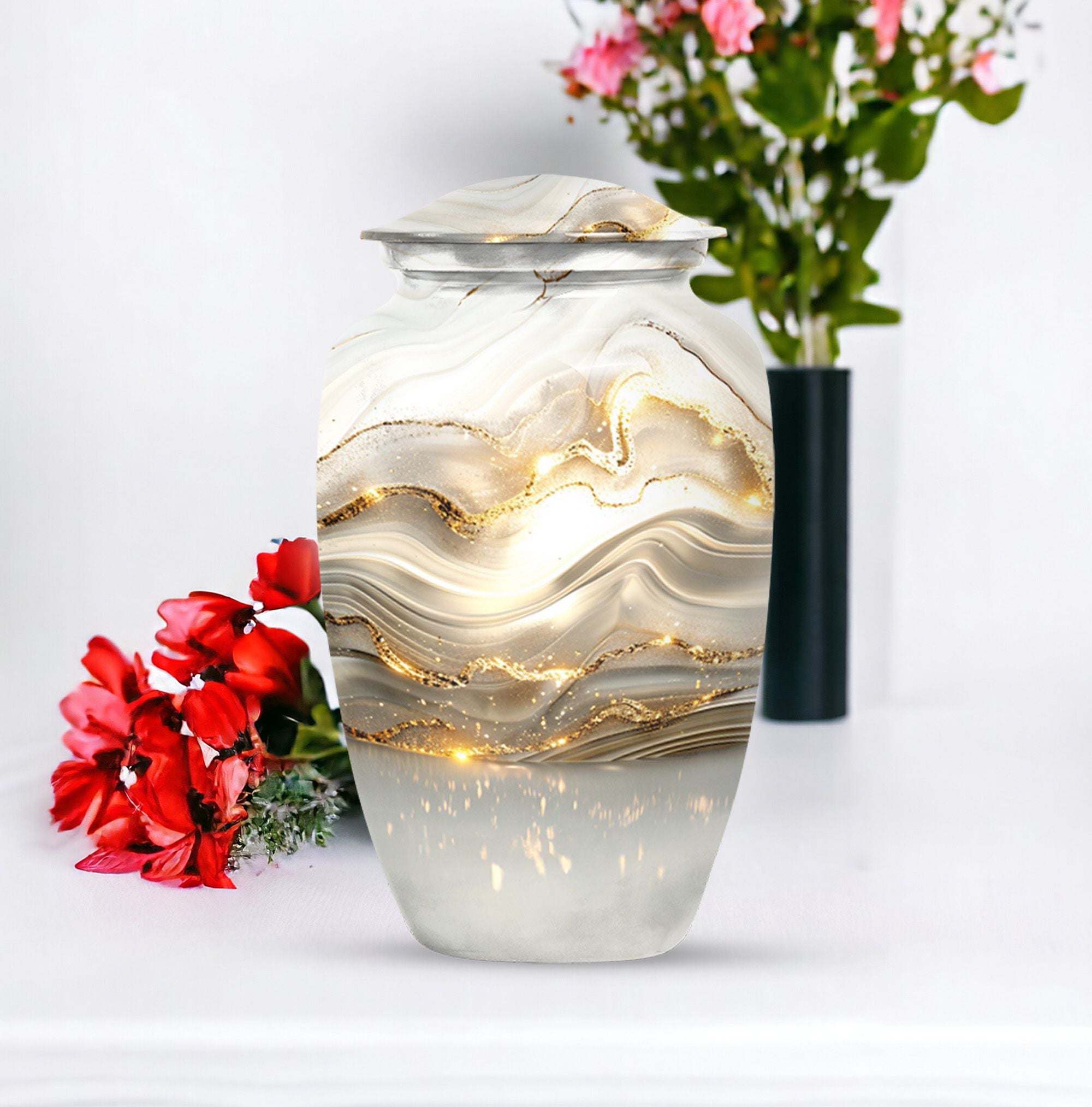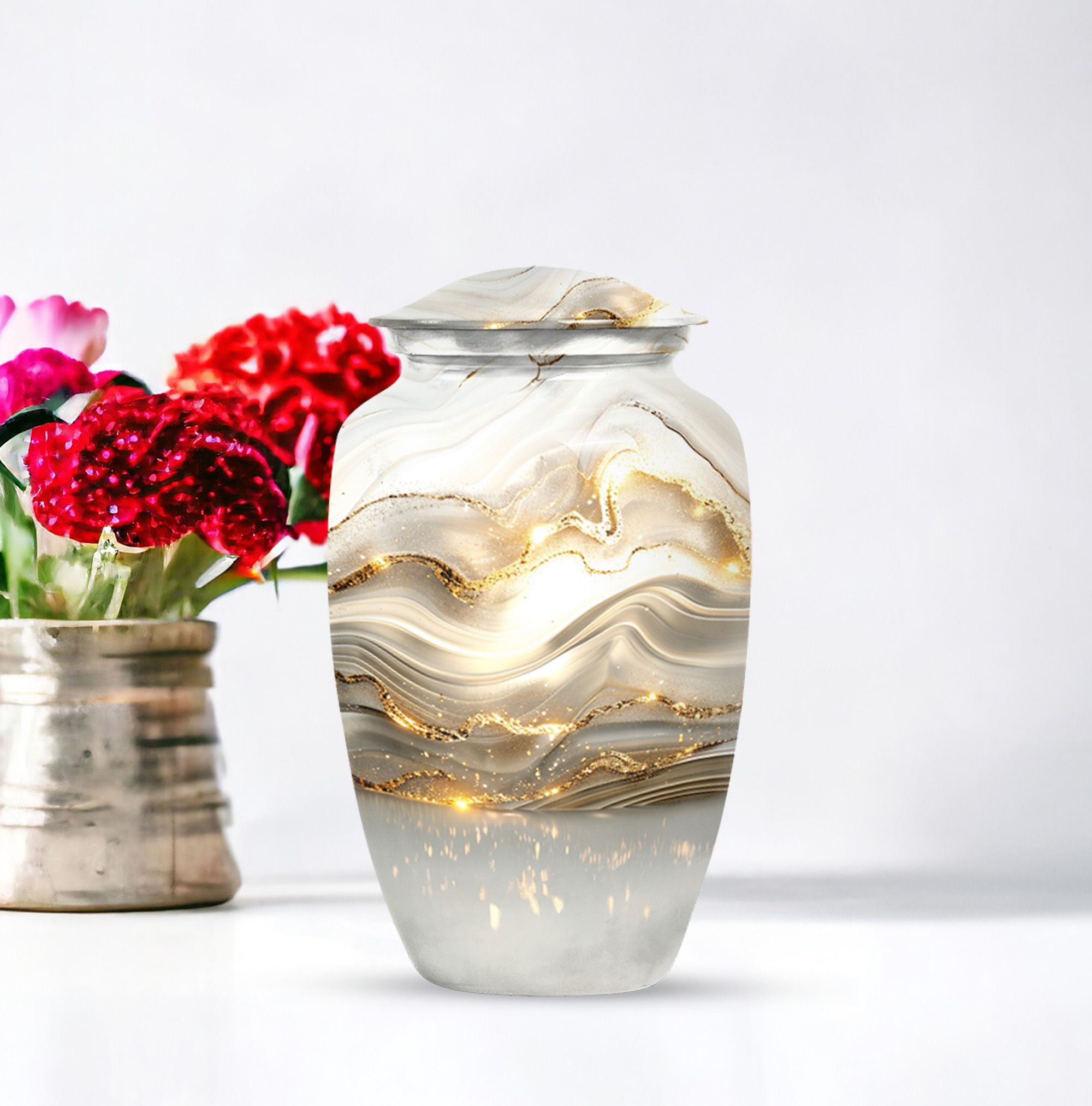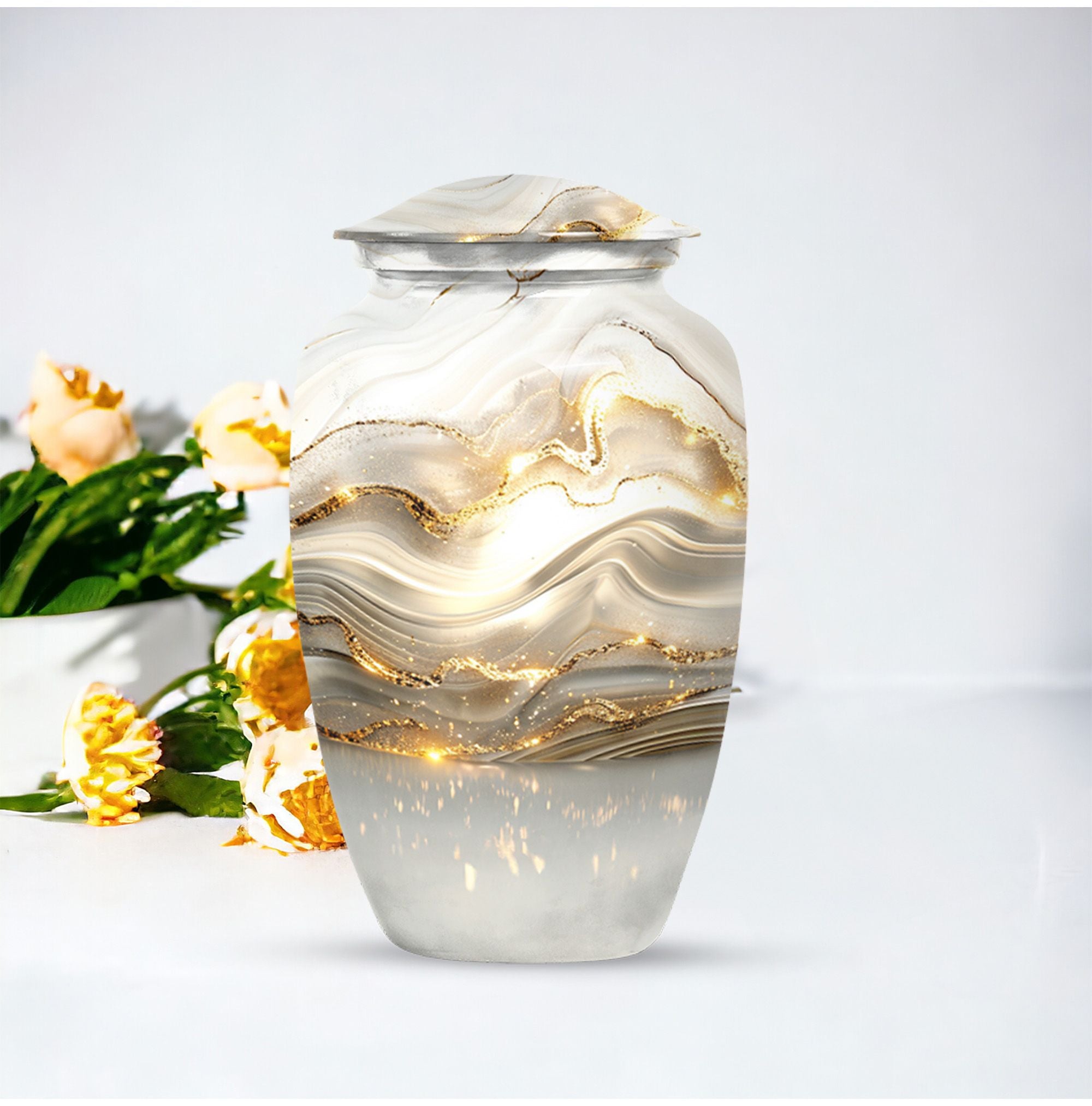 Discover the peace that comes with a beautifully curated resting place for your loved ones, with the 'Colourful Swirl Urn.' Crafted with exquisite care, this large aluminium 'cremation urn' is not just a vessel, but an expression of enduring love and respect. It stands at 10 inches, a substantial size demonstrating its purpose to house adult human ashes, with a capacity of up to 200 cubic inches. With an abstract theme that sets a tranquil tone, it weighs a solid 3.3 pounds, a testament to its robust build. The package includes a soft velvet pouch, perfect for storing the precious contents. Personalize it further by engraving names onto the body of the urn, a meaningful touch that enhances its sentimental value. Ideal for a 'funeral urn' or as a memorial tribute, this 'Colourful Swirl Urn' brings comfort during times of sorrow and pays homage to the departed. Its uniqueness lies not in its design, but in its ability to intertwine the practical needs of a 'cremation urn' with the emotional need for a tangible memory. Perfect for a mother, with specific keywords such as 'urns for mom, funeral urns for ashes'.