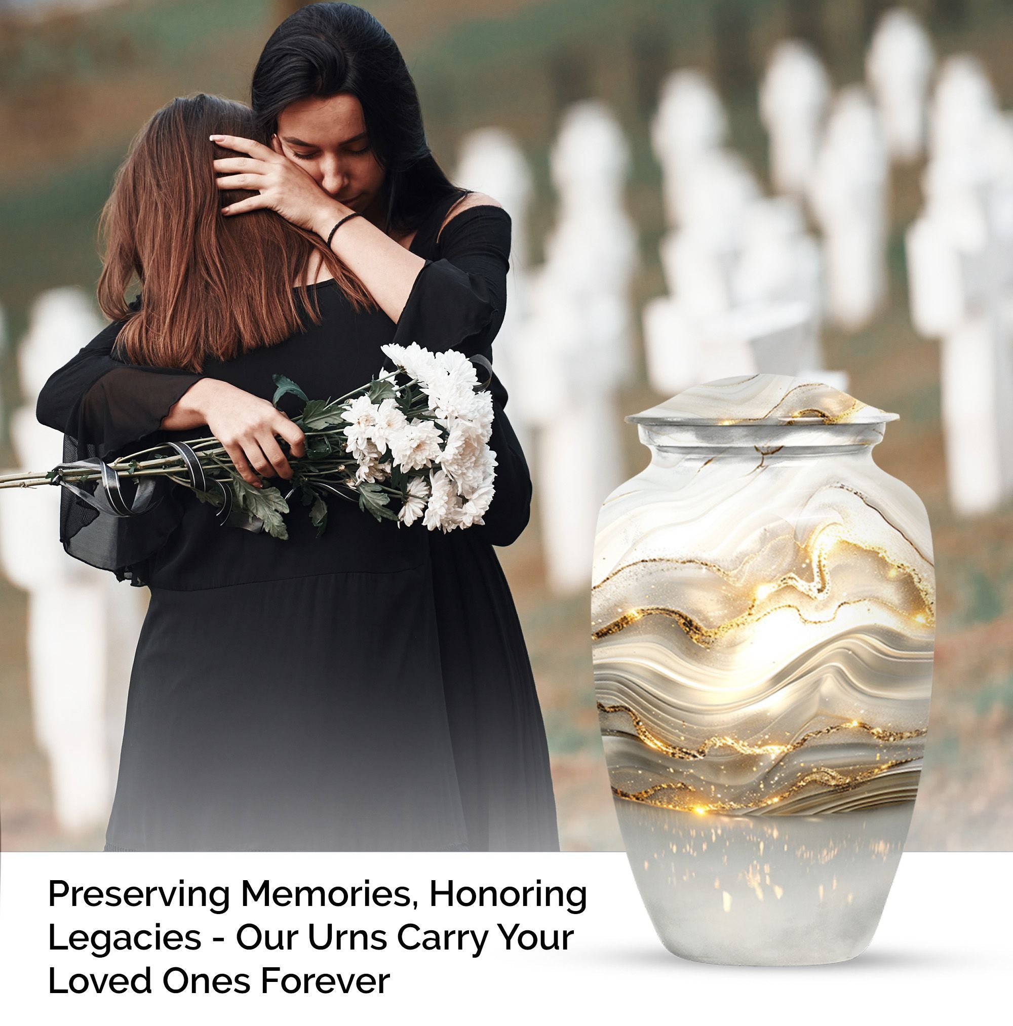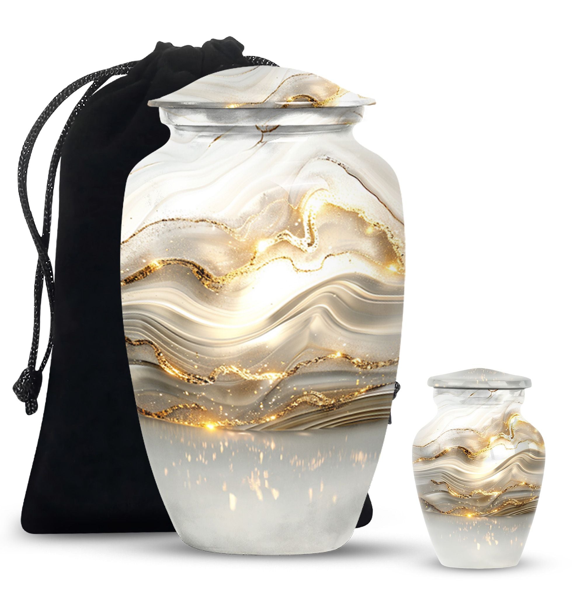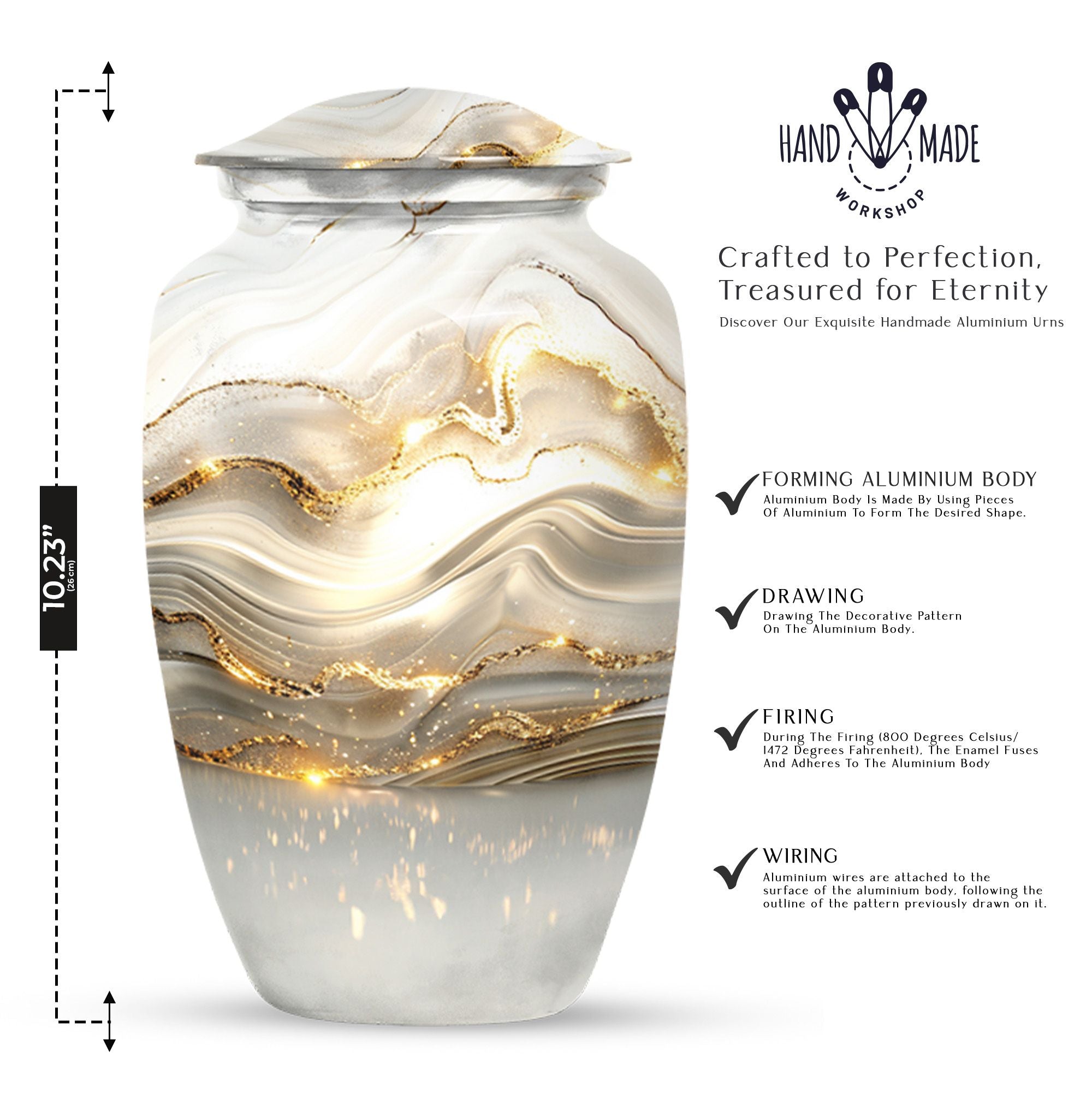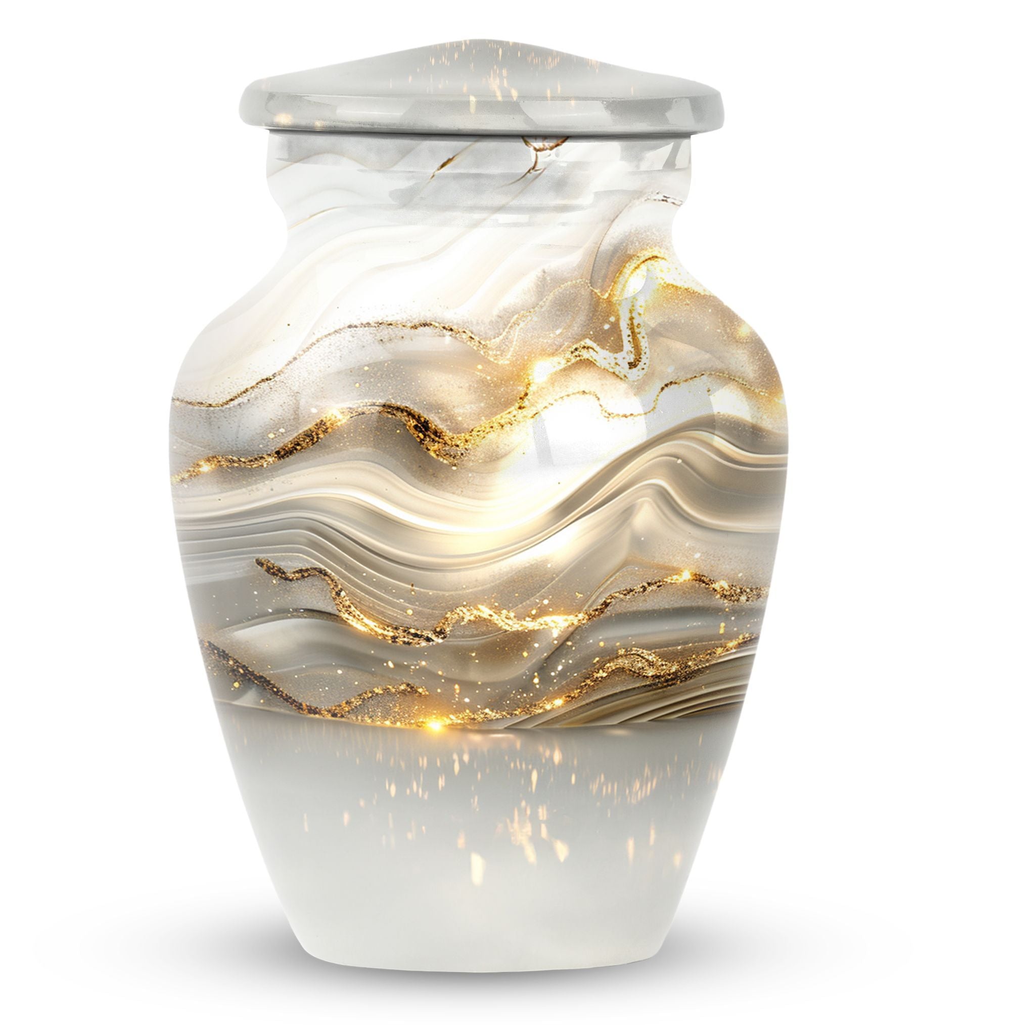 Discover the peace that comes with a beautifully curated resting place for your loved ones, with the 'Colourful Swirl Urn.' Crafted with exquisite care, this large aluminium 'cremation urn' is not just a vessel, but an expression of enduring love and respect. It stands at 10 inches, a substantial size demonstrating its purpose to house adult human ashes, with a capacity of up to 200 cubic inches. With an abstract theme that sets a tranquil tone, it weighs a solid 3.3 pounds, a testament to its robust build. The package includes a soft velvet pouch, perfect for storing the precious contents. Personalize it further by engraving names onto the body of the urn, a meaningful touch that enhances its sentimental value. Ideal for a 'funeral urn' or as a memorial tribute, this 'Colourful Swirl Urn' brings comfort during times of sorrow and pays homage to the departed. Its uniqueness lies not in its design, but in its ability to intertwine the practical needs of a 'cremation urn' with the emotional need for a tangible memory. Perfect for a mother, with specific keywords such as 'urns for mom, funeral urns for ashes'.