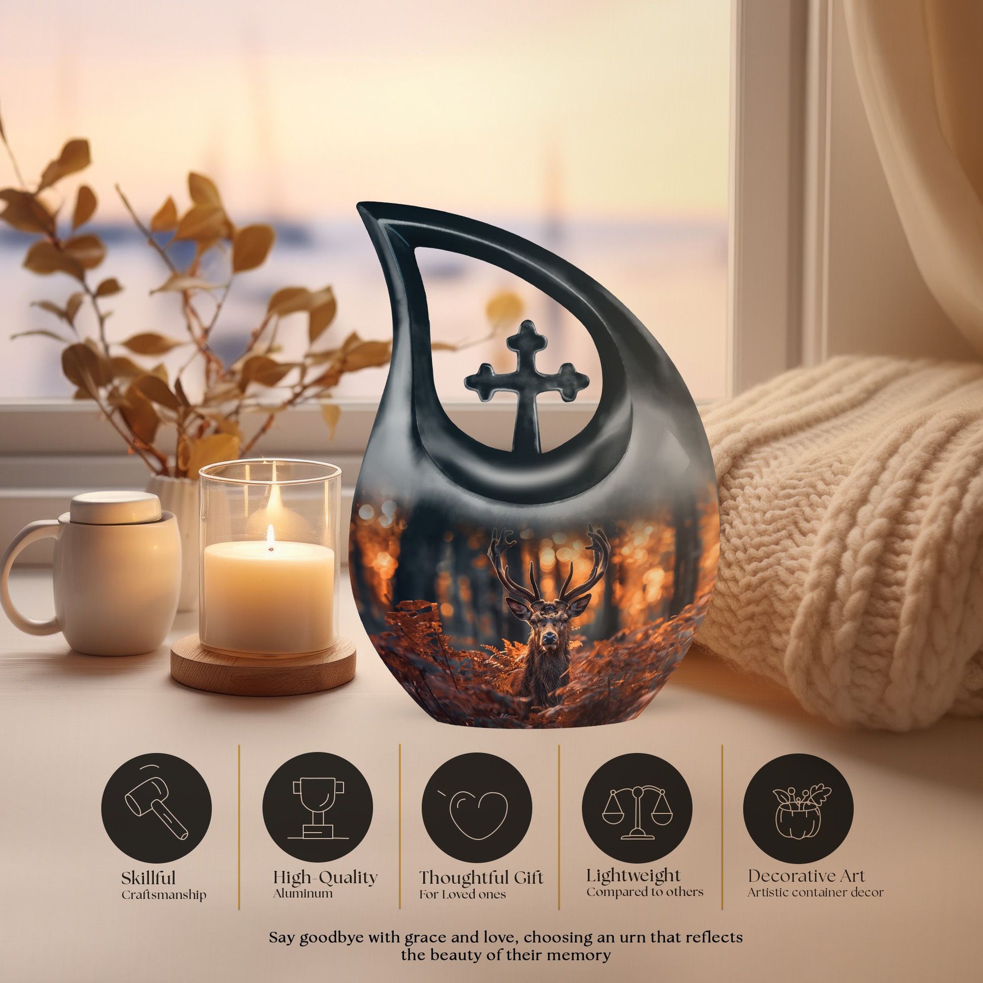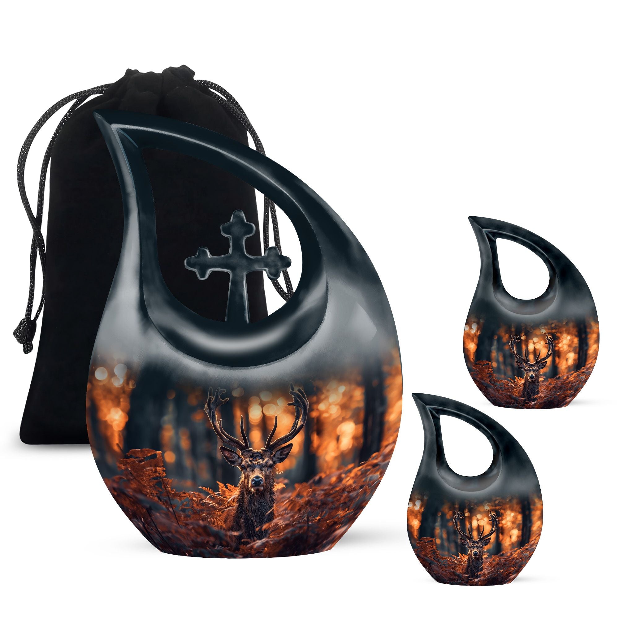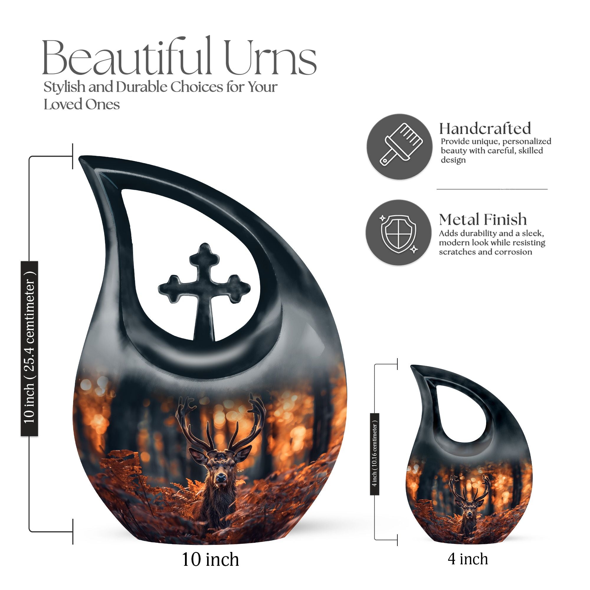 Cherish your dear ones with our unique and meaningful Deer Urn. This affordable memorial urn is constructively built from sturdy aluminium, promising longevity and enduring appeal. Standing tall at 10 inches, with a weight of 3.3 pounds, the urn boasts a capacity to securely hold up to 200 cubic inches of ashes. The kindred spirit of the Urn resonates through the gently falling 'Cross Drop' theme, silently echoing a peaceful journey towards the heavenly beyond. Your purchase includes a velvet pouch to safely hold the ashes. Add your personal touch by customizing the urn with engraved names, the testimony of a life gloriously lived. Ideal for both adults and seniors, this large urn serves as a beautiful yet cheap funeral urn. It reflects devotion and is perfect for those seeking low cost cremation urns or affordable funeral supplies. Perfectly captures the essence of your dear departed and helps keep their spirit close.