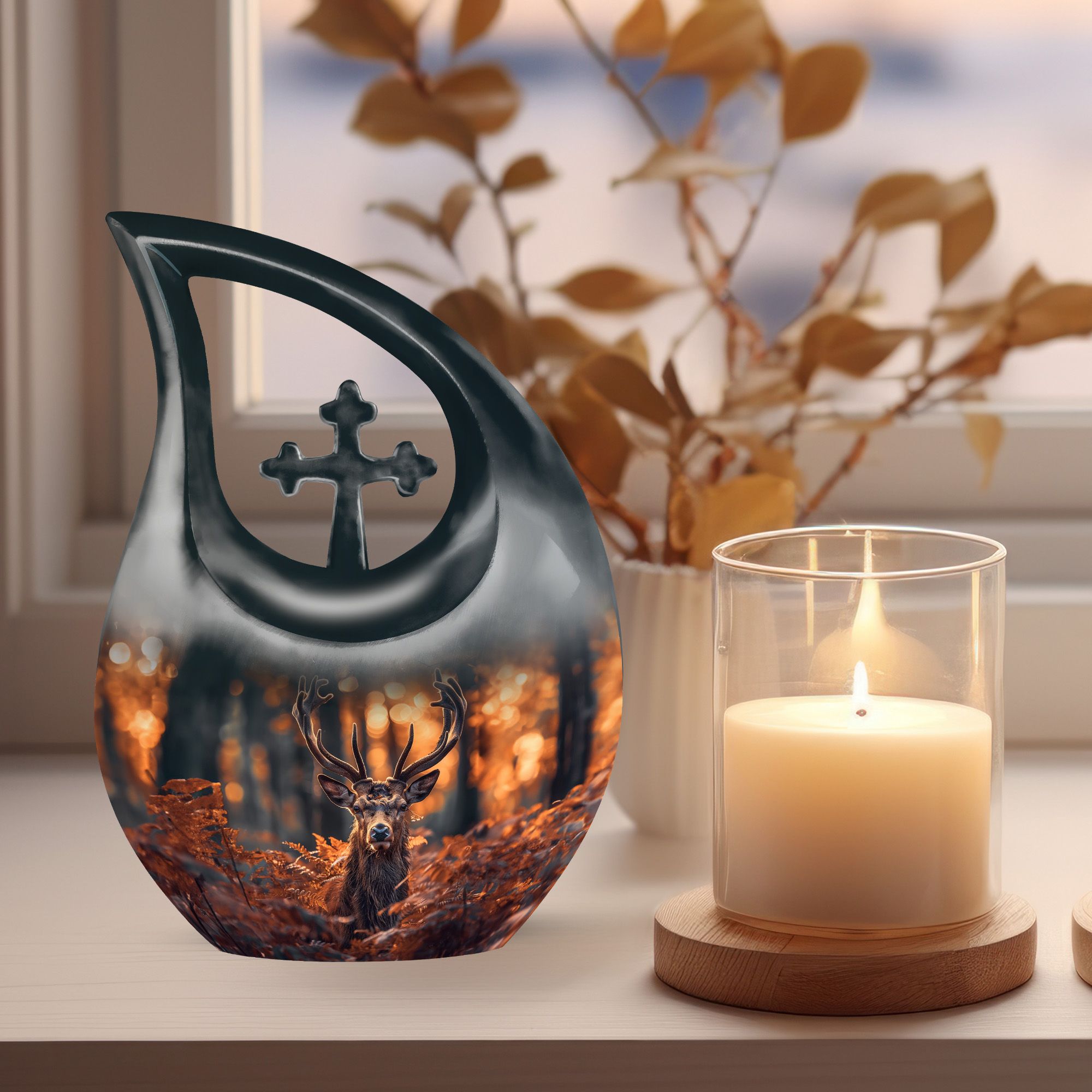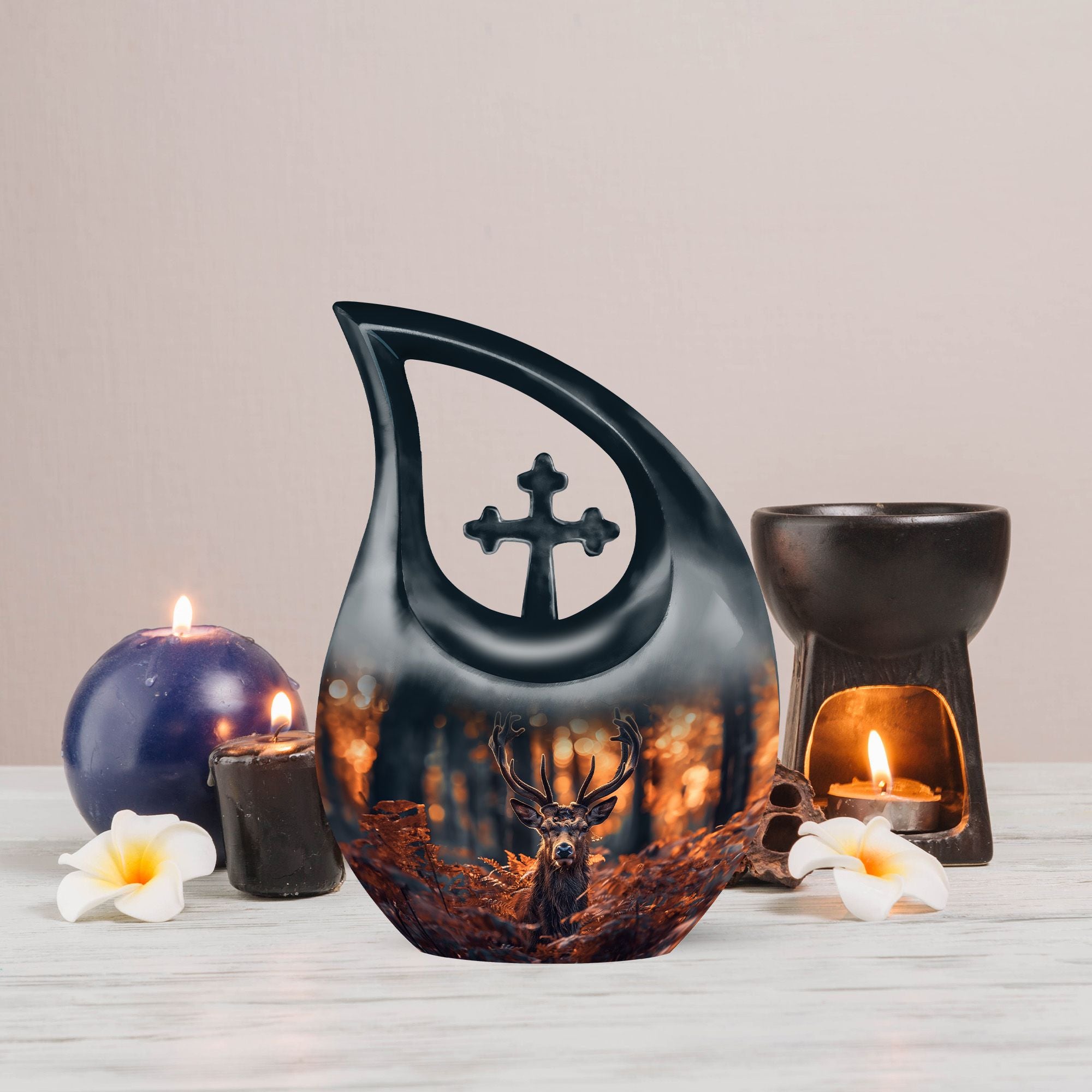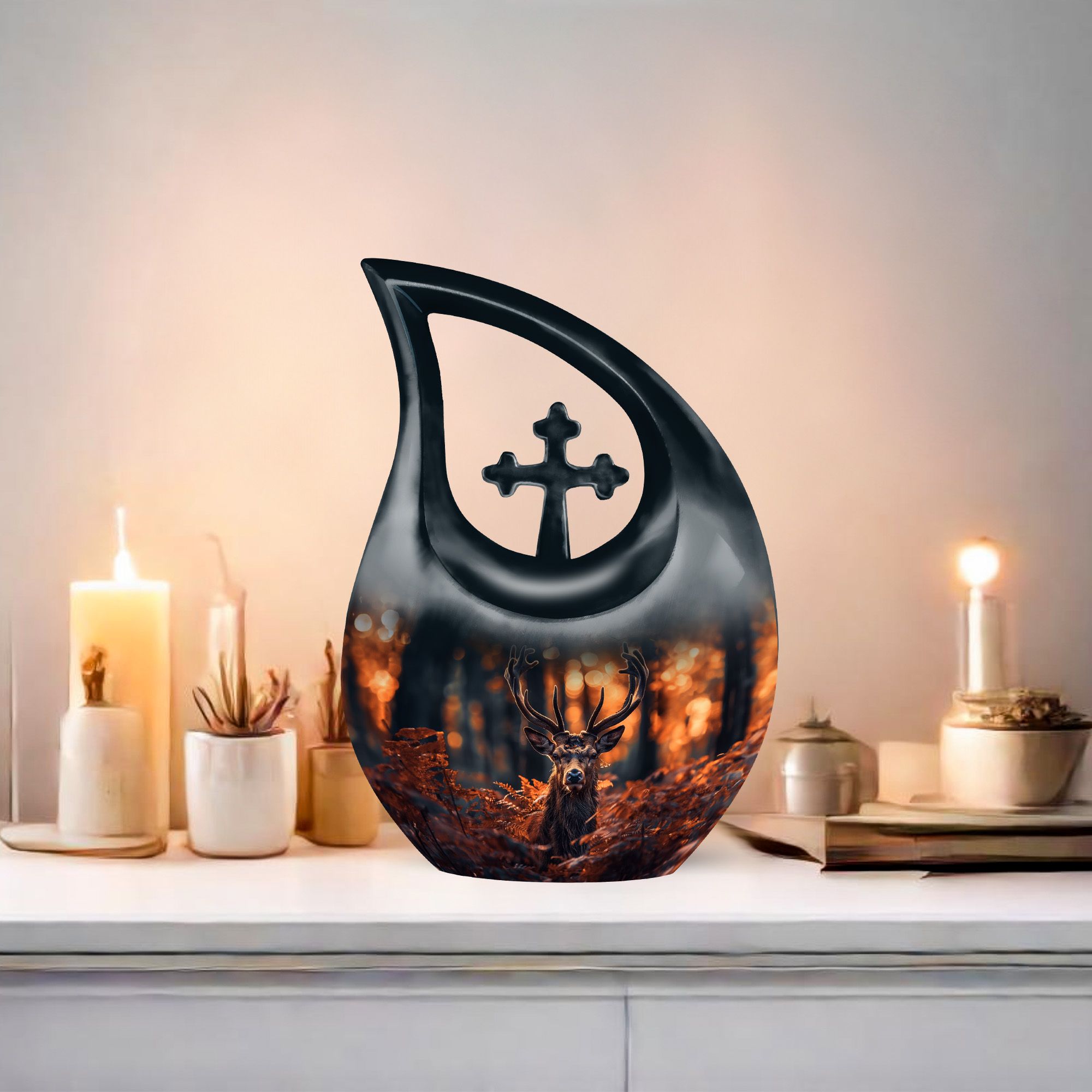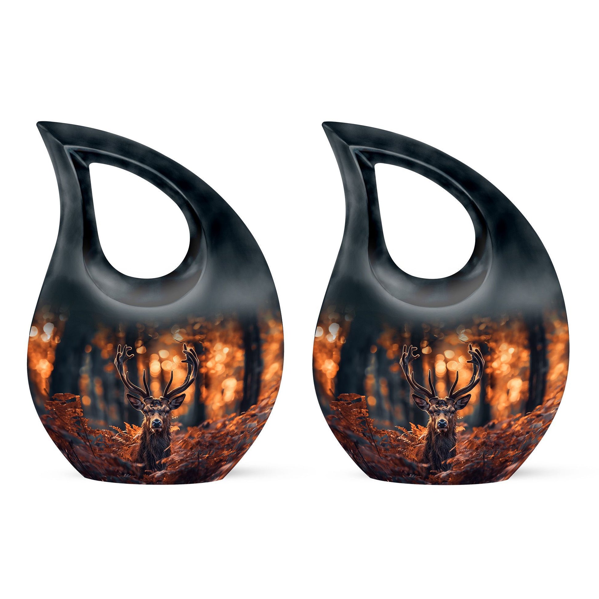 Cherish your dear ones with our unique and meaningful Deer Urn. This affordable memorial urn is constructively built from sturdy aluminium, promising longevity and enduring appeal. Standing tall at 10 inches, with a weight of 3.3 pounds, the urn boasts a capacity to securely hold up to 200 cubic inches of ashes. The kindred spirit of the Urn resonates through the gently falling 'Cross Drop' theme, silently echoing a peaceful journey towards the heavenly beyond. Your purchase includes a velvet pouch to safely hold the ashes. Add your personal touch by customizing the urn with engraved names, the testimony of a life gloriously lived. Ideal for both adults and seniors, this large urn serves as a beautiful yet cheap funeral urn. It reflects devotion and is perfect for those seeking low cost cremation urns or affordable funeral supplies. Perfectly captures the essence of your dear departed and helps keep their spirit close.