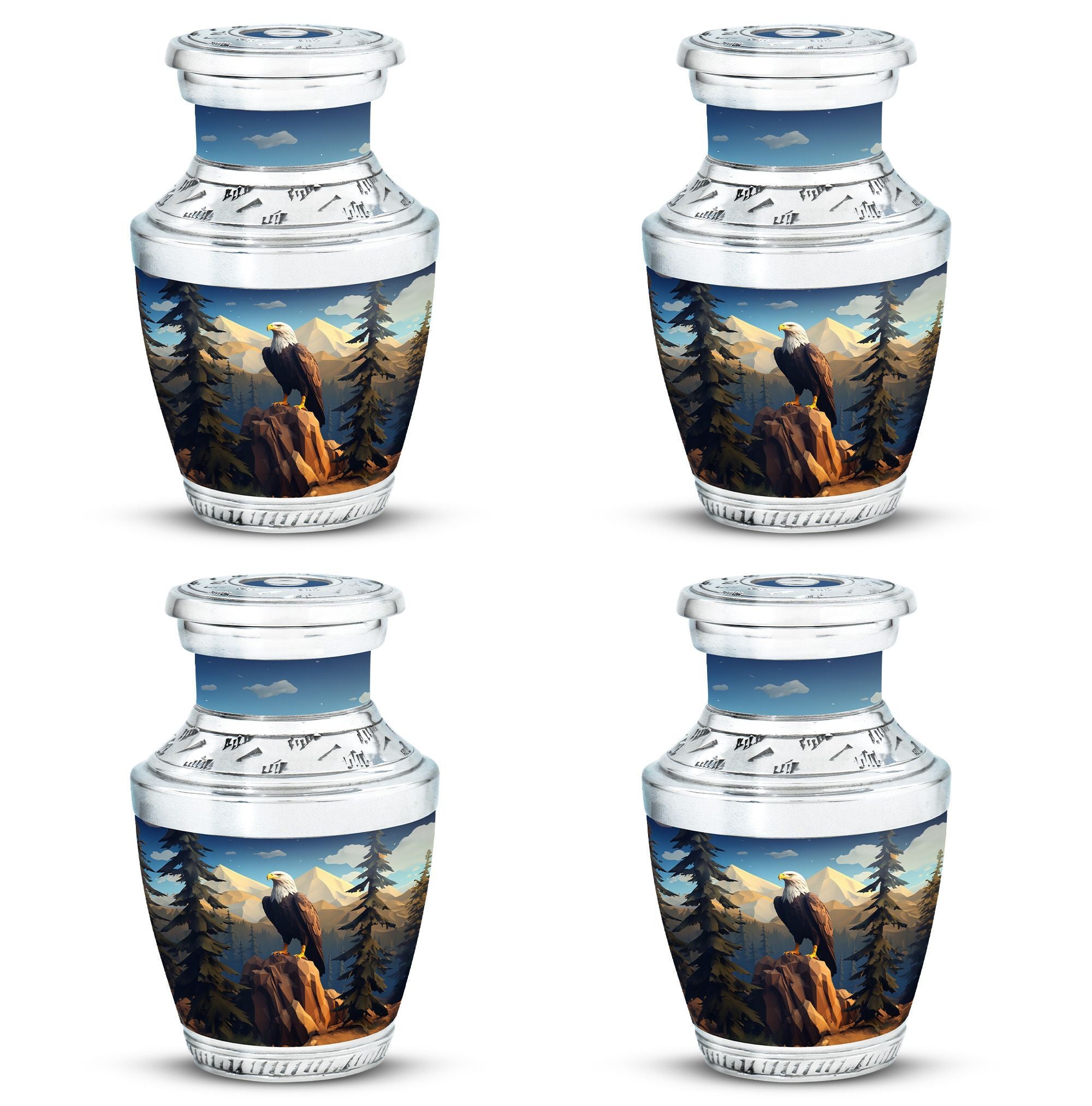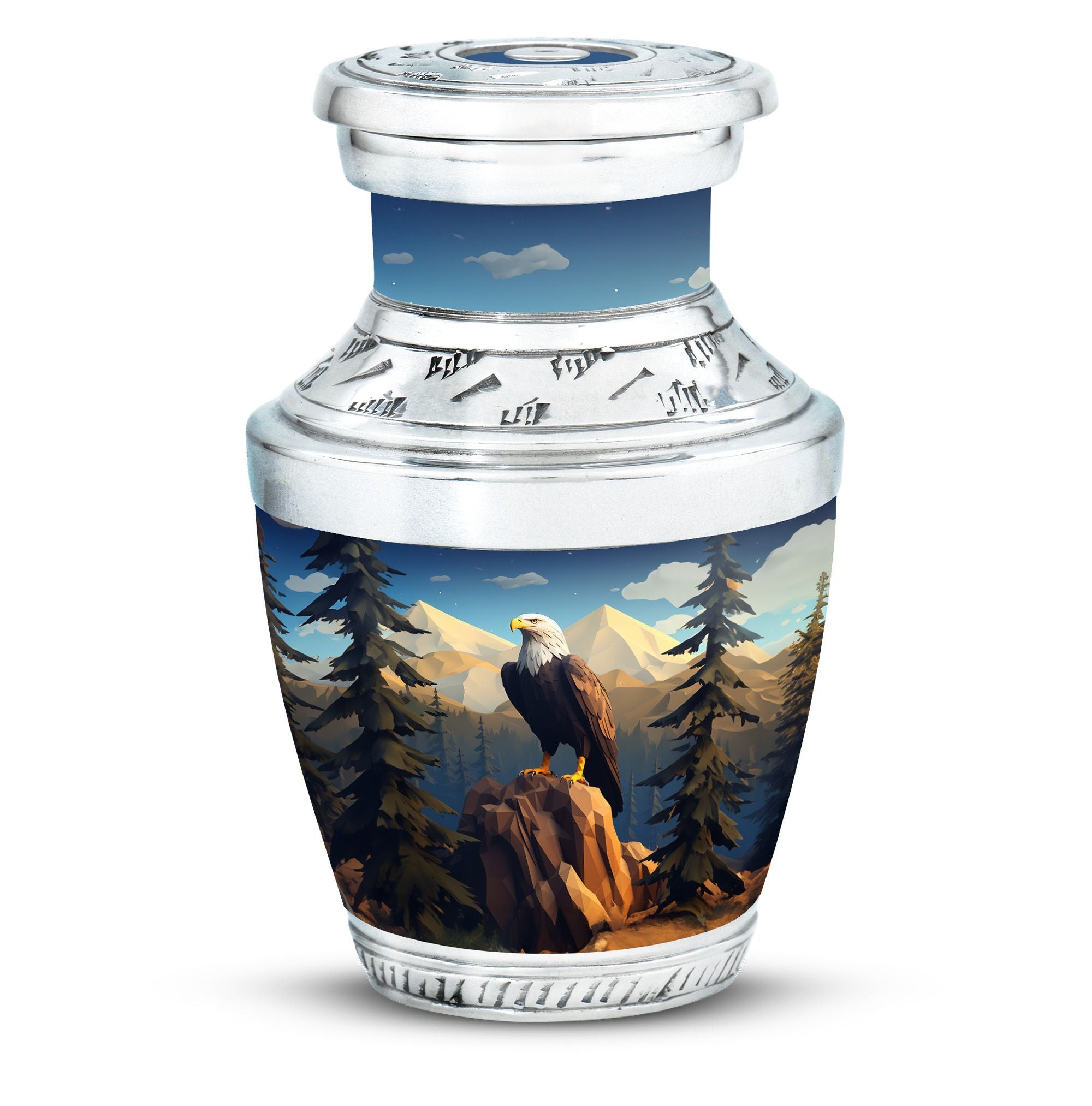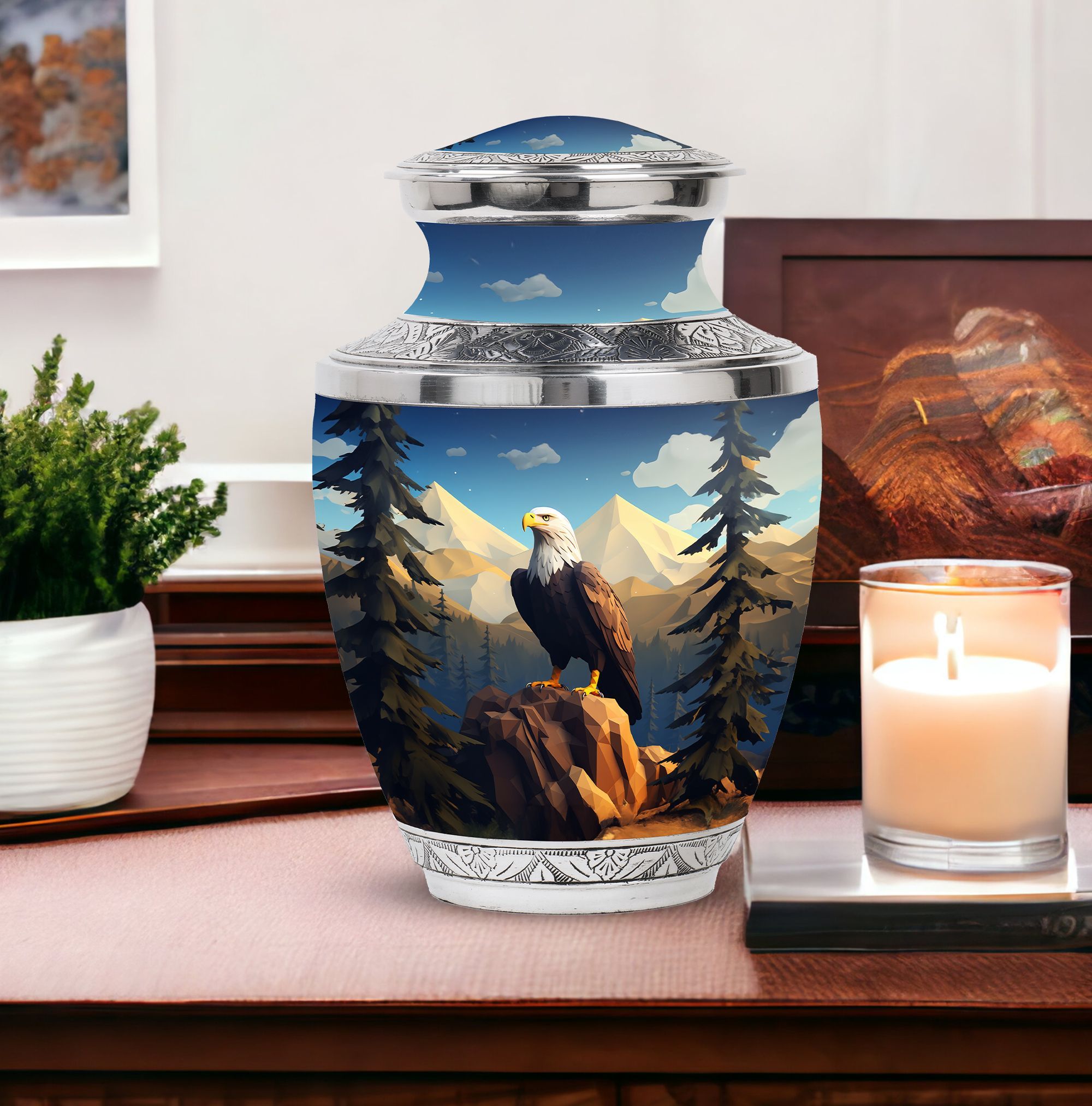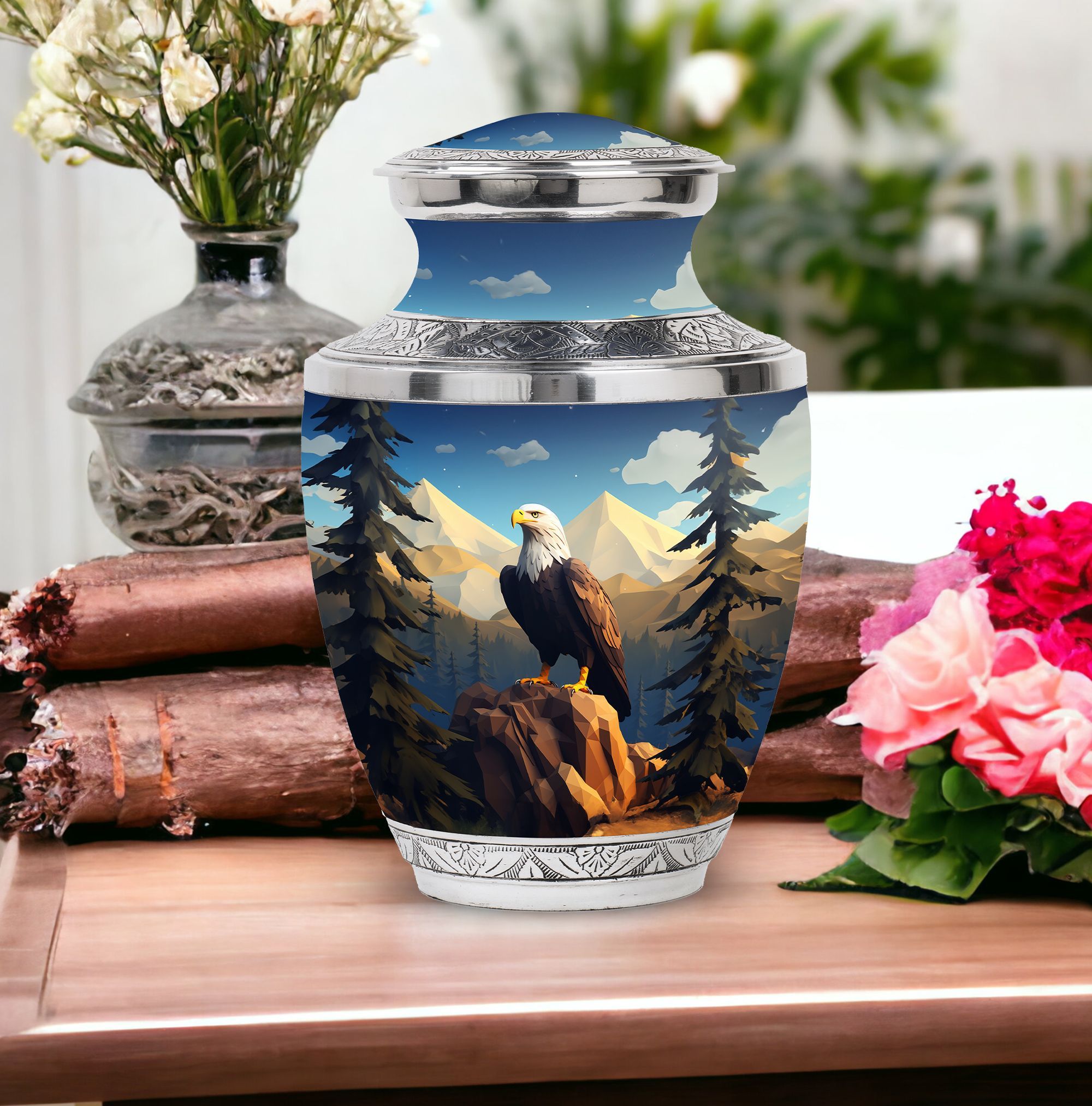 Discover the perfect final resting place that brings beauty, peace, and honor to your loved one with this large Eagle in mountains Cremation Urn. Crafted meticulously from high-quality lightweight Aluminium, this urn weighs just 3.3 pounds and stands with a height of 10 inches. Able to hold up to 200 cubic inches of remains, it will accommodate as a significantly meaningful memorial. The urn for ashes comes with a velvet pouch for containment to add more value to your spiritual needs. Tailored personalization allows you to engrave your loved one's names, adding an emotional connection to your memorial urn. Appropriate for various circumstances such as human cremation ashes or urns for Mom's ashes, this large urn is a tasteful addition to your memorial ceremony supplies. Trade ordinary for extraordinary with richly crafted urns for cremated remains that bring solace and respect to those we hold dear.