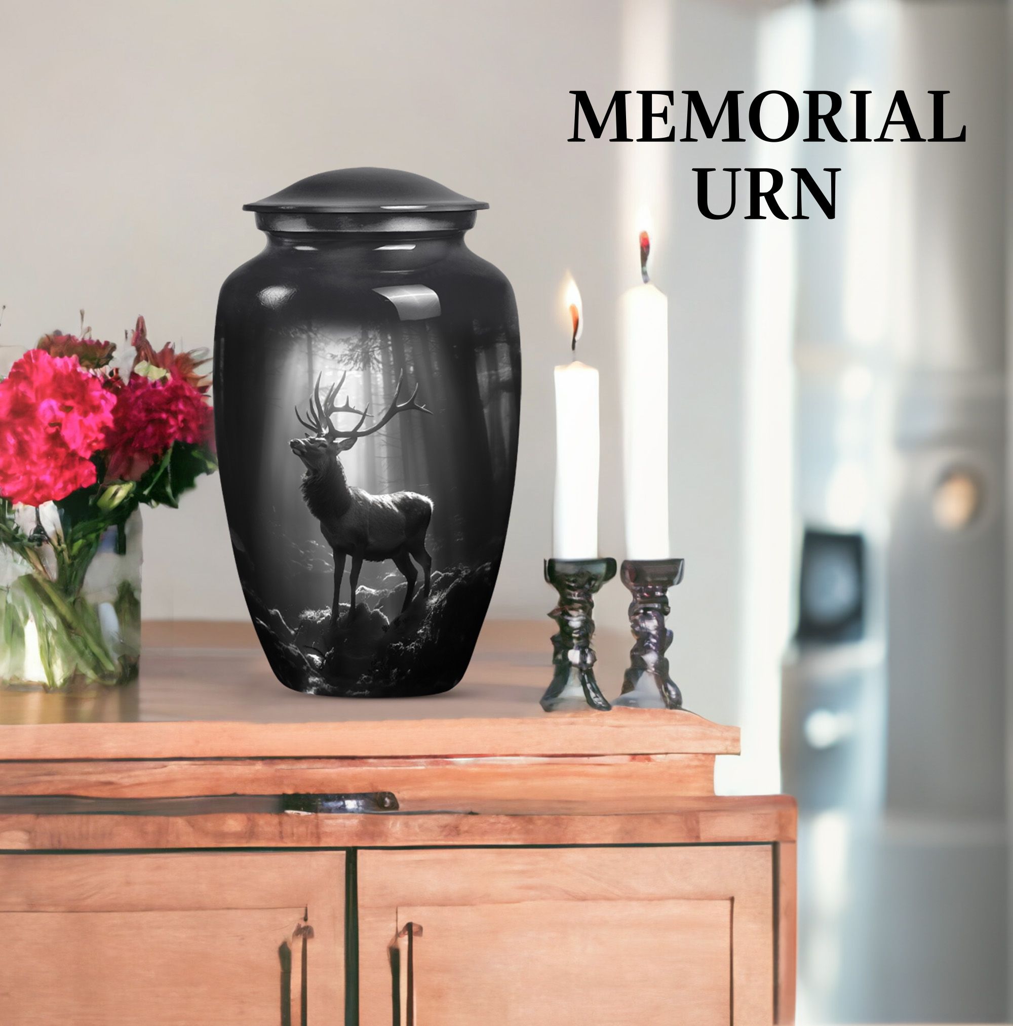 This 10-inch, grand Deer Urn is a reverential option for commemorating a loved one's journey to the next beyond. Crafted from lightweight yet durable aluminium material, it embodies the noble deer and the timeless beauty of a gramophone theme. With the substantial capacity of 200 cubic inches, it serves as a large urn suitable for adult human ashes, making it a meaningful choice for funeral burial needs. Weighing in at 3.3 pounds with 10 inches in height, it's designed to comfortably rest on your cherished 'shaped shelf.' It also ships with a velvet pouch to securely contain the ashes and maintain utmost respect. A distinguishing feature of this cremation urn is the customization option - allowing you to personalize it further by engraving names showing a heartfelt tribute. Our Deer Urn is a worthy testament to a memorable life lived and loved while peacefully serving as an elegant artefact in your home.
