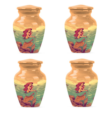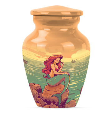 This timeless 10 Inch Mermaid Urn, a Classic large urn crafted from durable Aluminium, serves as the ideal memorial funeral urn for ashes. Blooming with the grace and transformation symbolized by its exquisite 'Butterfly' theme, this cremation urn has a generous capacity of 200 cubic inches. It weighs an appreciable 3.3 pounds signifying its quality and substantial craftsmanship. Add a unique touch by personalizing this cremation urn with engraved names to honor your loved one's memory. Carefully contained in a velvet pouch, the design ensures the secure placement of the ashes. Slightly more unique than typical decorative urns, this large urn serves as an intimate tribute to both mother and father, or any loved ones. This urn is more than a vessel, it symbolizes the transformation of life, a cherished remembrance that blends sentiment with style.