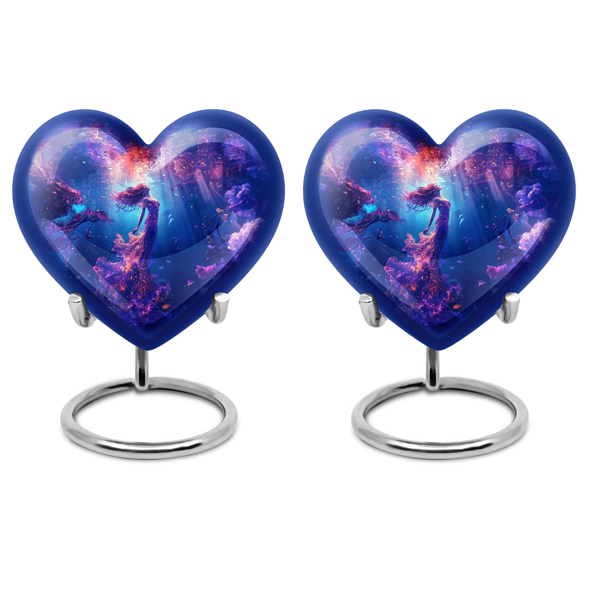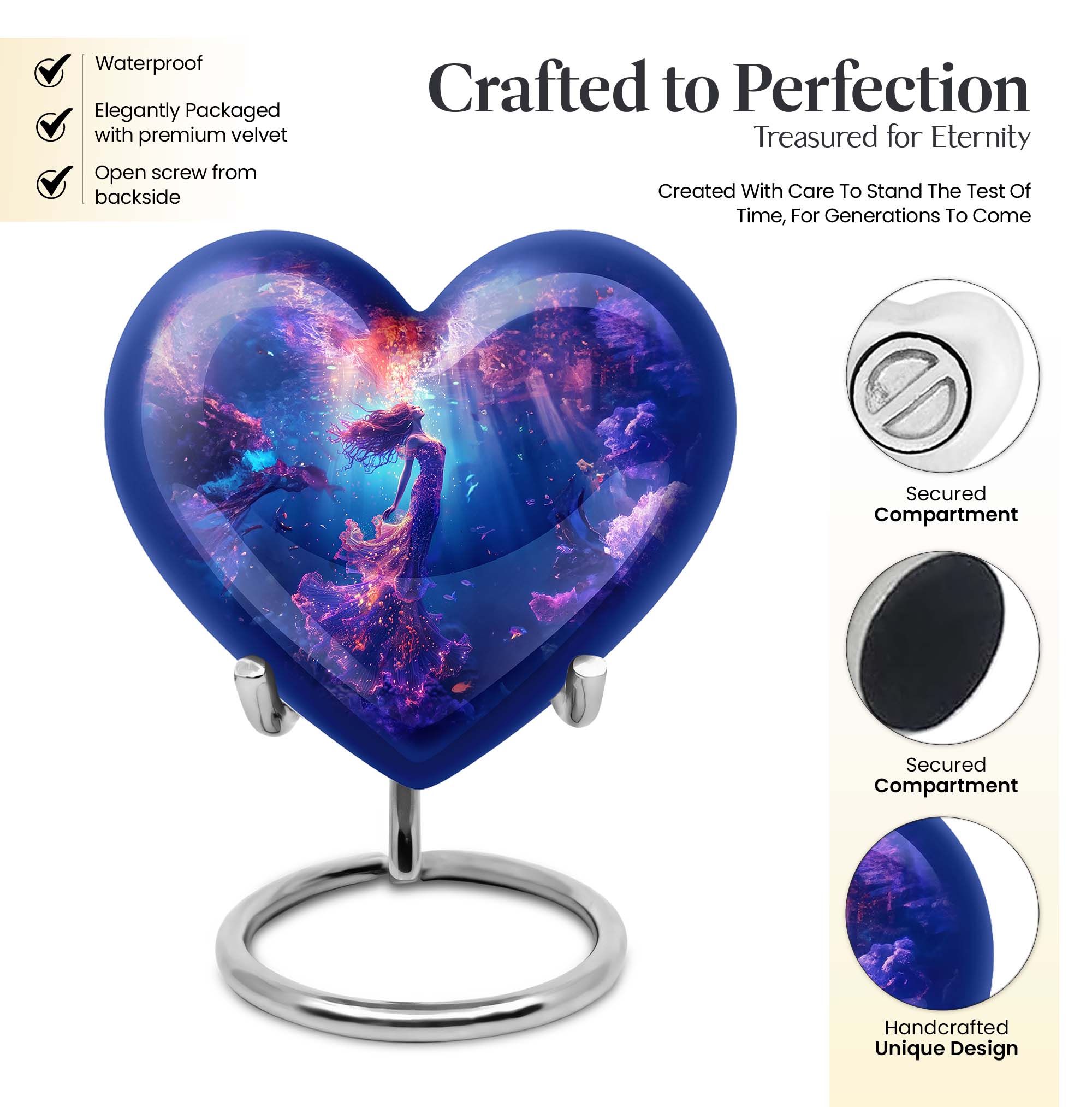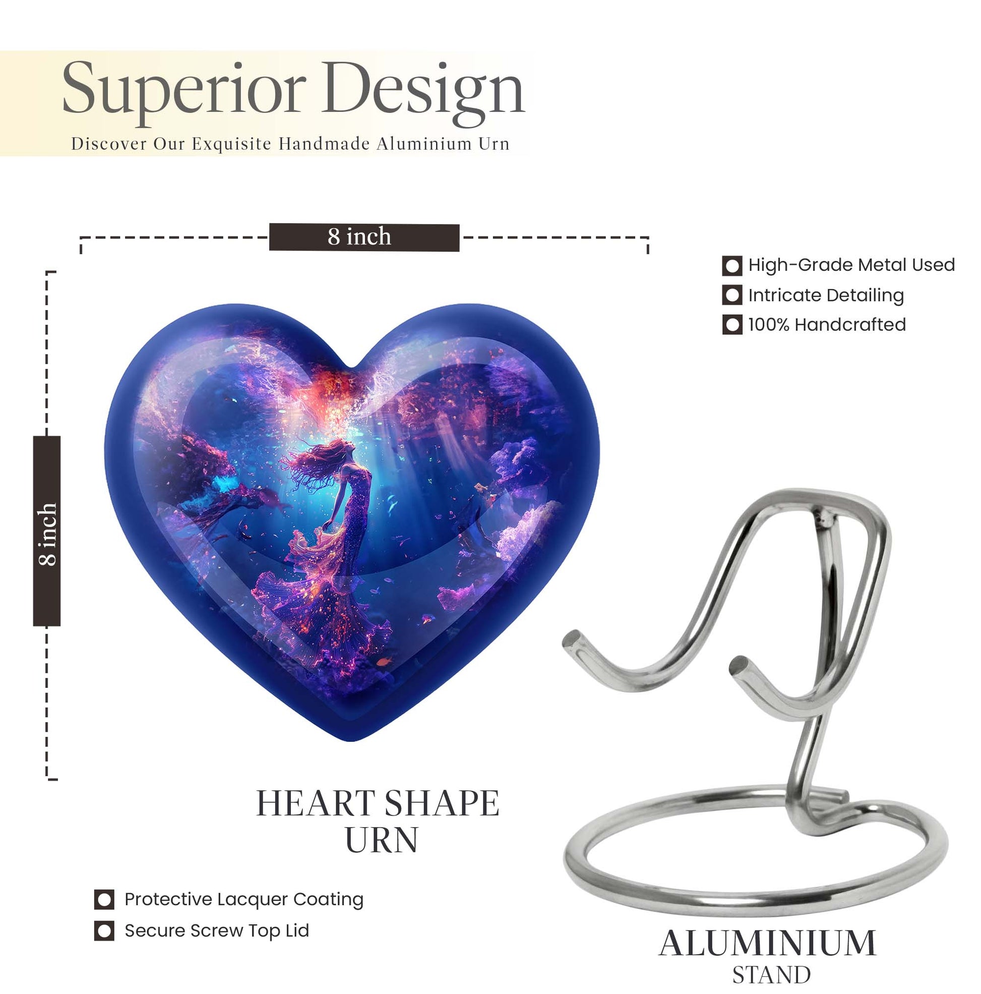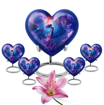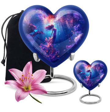 Carry the spirit of your loved one close to your heart with our custom 10-inch Mermaid Urn, an essential part of modern burial large urn for ashes for women. Each crafted Heart Urn stands 10 inches tall and weighs 3.3 pounds, offering a generous capacity of 200 cubic inches, ideal for memorial ceremonies. Our burial cremation urns for adult women pristinely cast in Aluminium are shaped to perfection. This stunning Large Urn, part of an exclusive collection of Large Urns, is graced by a butterfly-theme that adds a touch of elegance and remembrance. To make it even more special, personalize with engraved names. Included with this cremation urn is a handy velvet pouch, perfect for secure containment of ashes. Browsing for memorial gifts, cremation urn men, or large double cremation urn for two adults? Look no further. Embrace the beauty and symbolism of our Heart Urn, a poignant choice for preserving cherished memories.