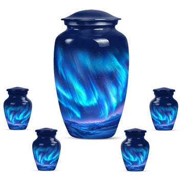 Introducing our Northern Lights Urn, a significant part of memorial ceremony supplies, designed for those seeking a tasteful and memorable way to cherish their loved ones. This large urn is known for its capacity, provides ample space for 200 cubic inches of ashes. Crafted delicately from resistant aluminium, it combines durability with heartwarming elegance. This 10-inch tall memorial urn showcases an enchanting butterfly theme, subtly conveying a soul's liberation and eternal transformation. Its weight of 3.3 pounds ensures a solid base, offering a sturdy presence. We understand the sanctity and individuality of memories, hence, every urn comes with an option of customization. Personalize the urn with the engraved names of your departed loved ones to create a unique memorial tribute. Not to forget, we include a plush velvet pouch for containment and safekeeping of ashes. Explore the realm of memorial urns, go beyond the ordinary funeral burial with our Northern Lights Urn, ensuring your memorial tributes resonate as eternal as the love you hold.