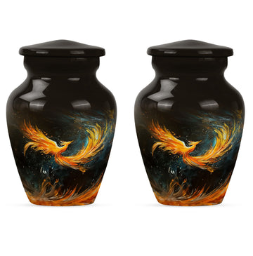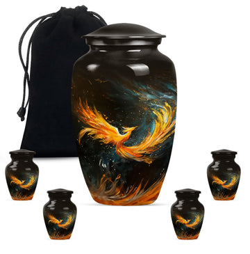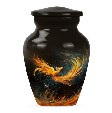 Celebrate the memory of your loved ones with our meticulously crafted Phoenix Urn, a perfect addition to your memorial adult urns collection. Introducing an abstract theme with an ageless Aluminium-made classic urn design, this cremation urn stands tall at 10 inches. Weighing a substantial 3.3 pounds, its quality is undeniable and it's capable of holding up to 200 cubic inches of remains. It's more than an urn - it's a tangible memory of your cherished one. Not only does it shine in aesthetic appeal, but the practicality is also unmatched. The Phoenix urn comes with a velvet pouch, expressly designed for safe containment of ashes, adding a sophisticated touch to an already exquisite piece. Personalize your purchase by engraving names on it, making this urn truly unique and intimate. The Phoenix urn is rated highly among large urns and is perfect for adults. It's indeed the ideal cremation urn for burial in the ground or for those seeking memorial adult urns for human ashes for women and men alike. Own this sensational expression of devotion today!