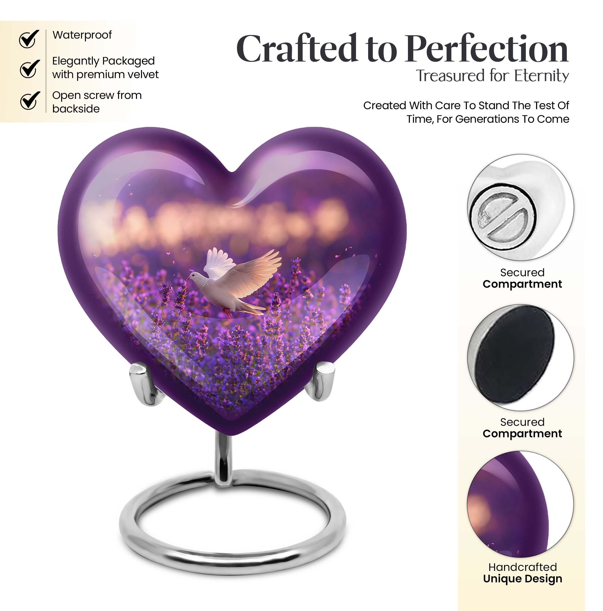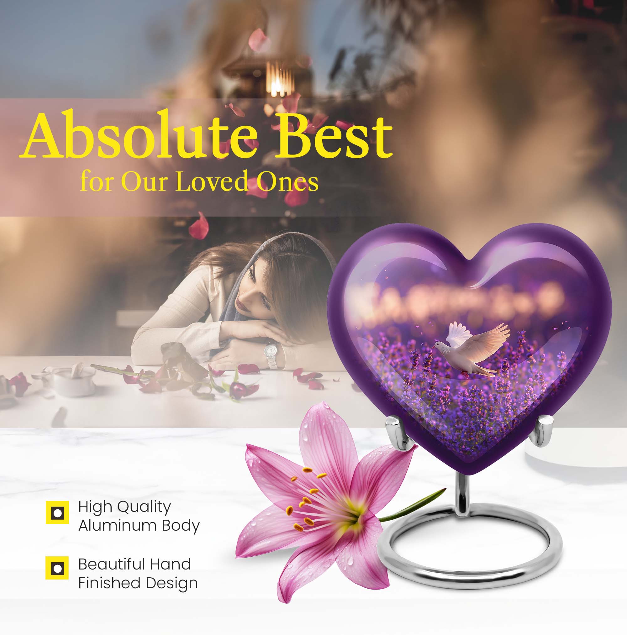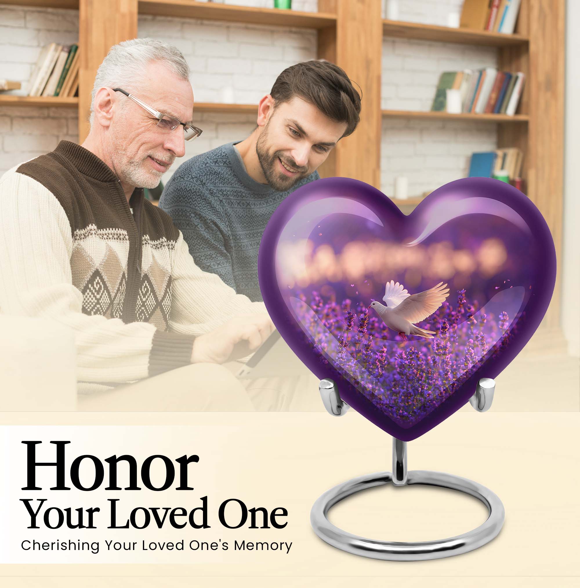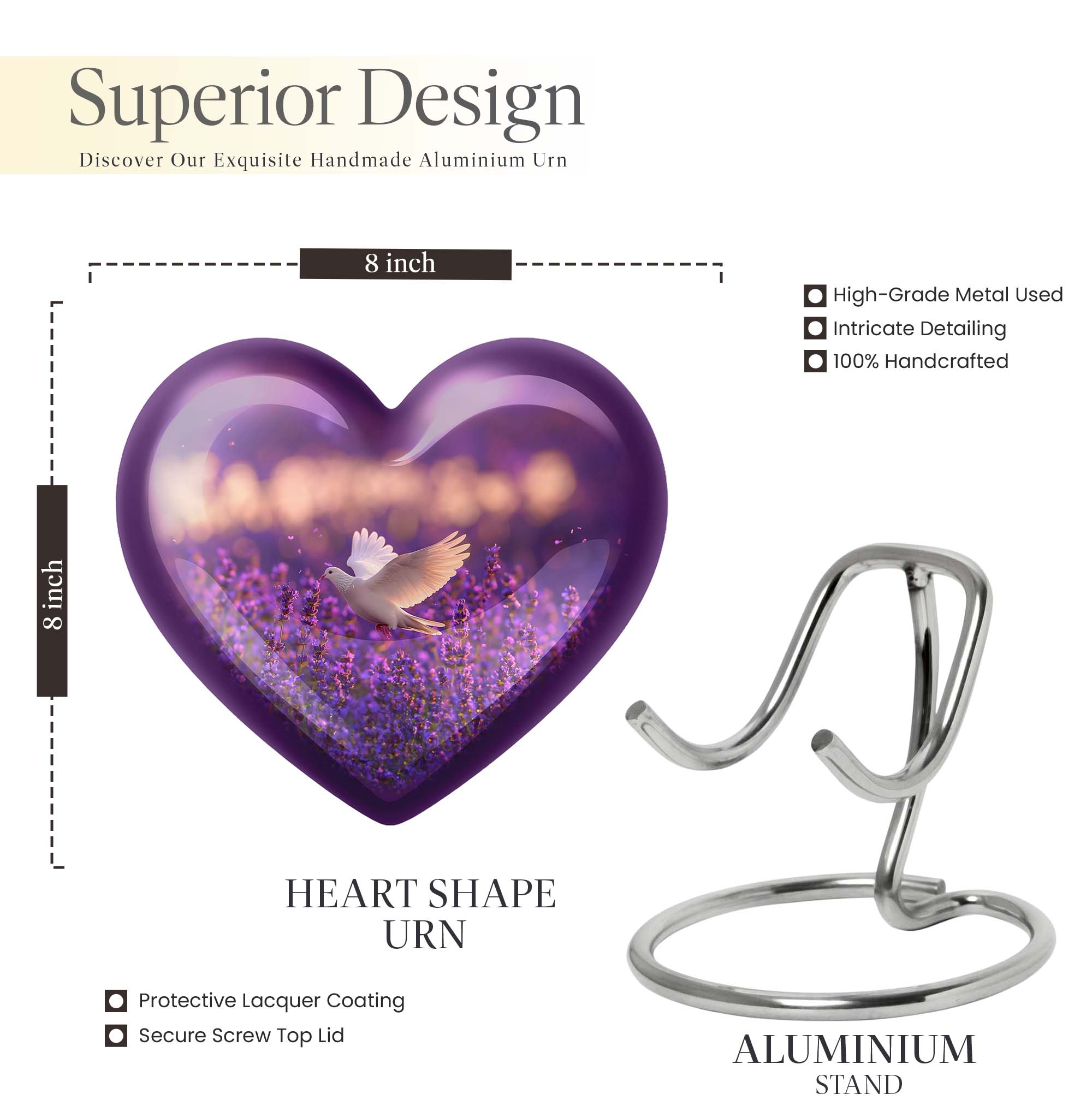 Honor your departed loved one with this immaculate 'Heart Urn' featuring an exquisite white dove on a deep purple surface. Made from high-quality aluminum, the 10-inch large urn has the capacity to hold around 200 cubic inches of ashes, making it perfectly suitable for an adult memorial burial. The urn, weighing 3.3 pounds, is designed keeping Adults, Seniors in mind and the butterfly theme adds a spiritual touch to it. Packaging includes a soft velvet pouch for secure containment of ashes. What sets this urn apart is the option for personalization, where names can be specifically engraved, adding a unique, personal touch to it. A predominant choice in the memorial ceremony supplies category, this memoria urn serves as an elegant and respectful resting place for your loved one. With sensibly incorporated keywords such as 'memorial funeral urn', 'adult ash urn', and 'large urn for adults', this product stands out in search queries by targeted audience. Remember your loved one in a dignified manner with this carefully crafted urn.