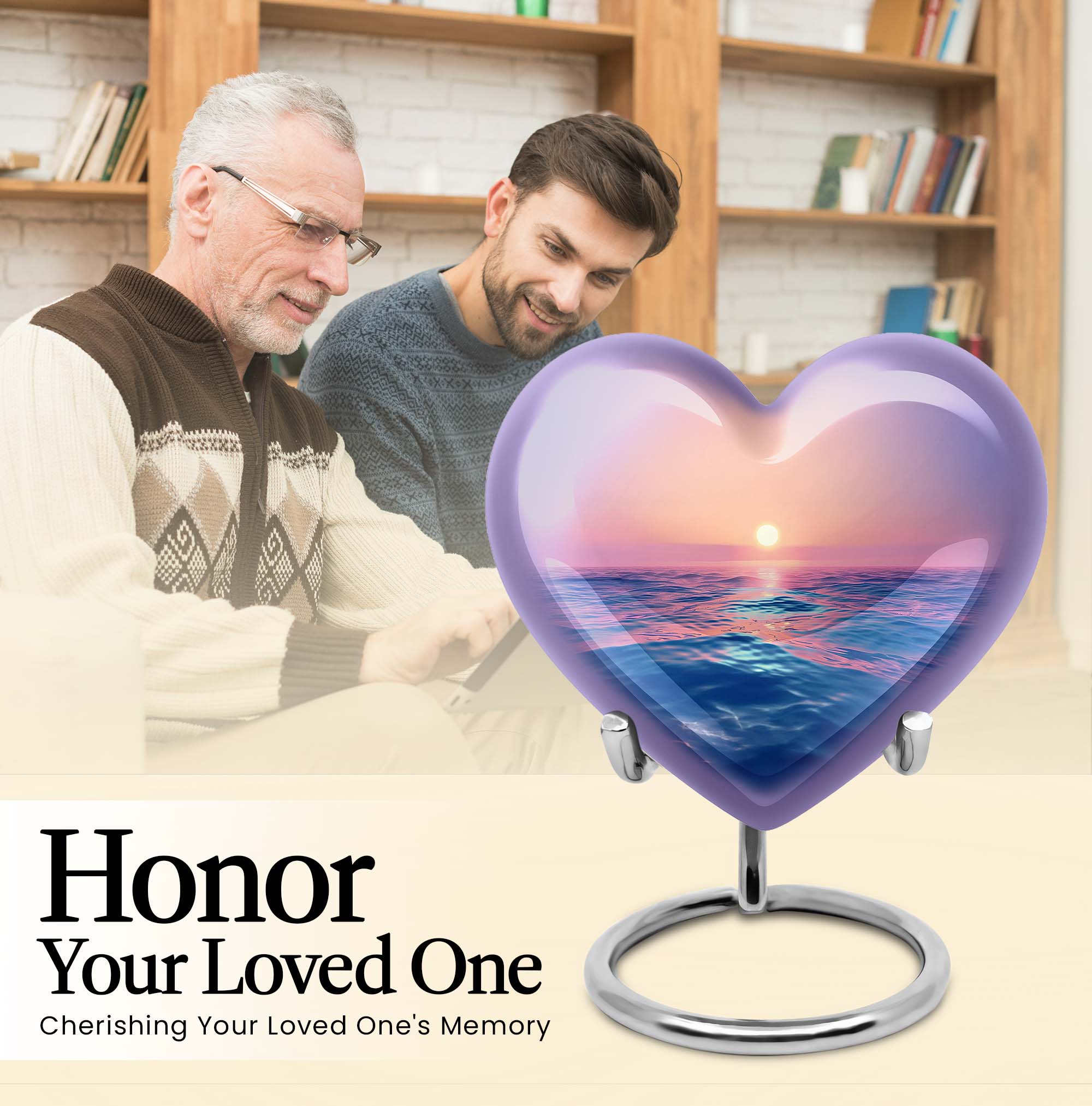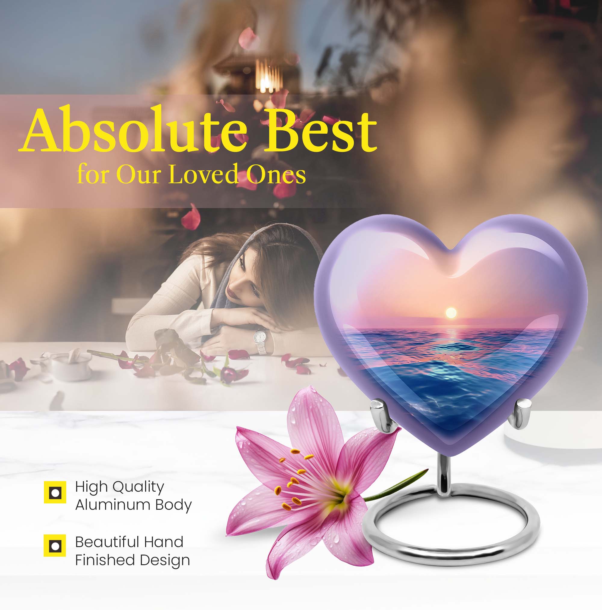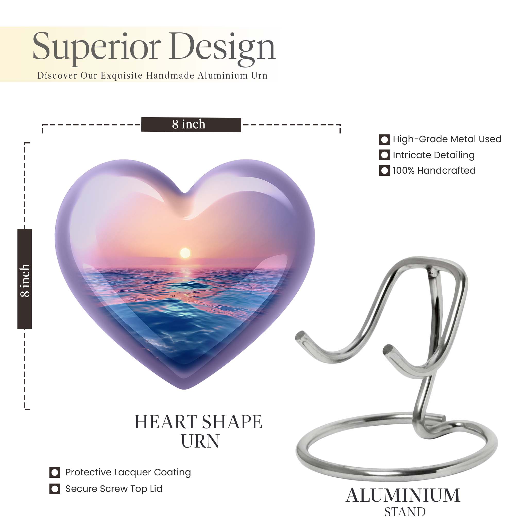 Presenting a heartfelt tribute to your dearly departed with our exquisitely designed Ocean Waves Urn. A perfect 10-inch 'Heart Urn' inspired by the serene rhythm of the ocean waves, symbolizing peace and tranquility. Beautifully engraved with names of the purchaser's choice, this custom urn adds a personal and unique touch to your memorial ceremony. Constituted from durable Aluminium that gives it a weight of 3.3 pounds, the urn is sure to withstand the test of time. Packaged with a velvet pouch perfectly sized for containment of ashes, this offers a respectful way to remember your loved ones. Accommodating up to 200 cubic inches of ashes, this large urn is an ideal option for adult burial. Adorned with a delightful butterfly theme, it blends the aspects of love, transformation, and freedom. Primarily recognized as 'ocean waves urn' or 'burial urns for human ashes adult', it also resonates with phrases like 'cremation urns for human ashes men', and 'funeral large'. Let your memories of your loved ones be as perpetual as our Ocean Waves Urn.