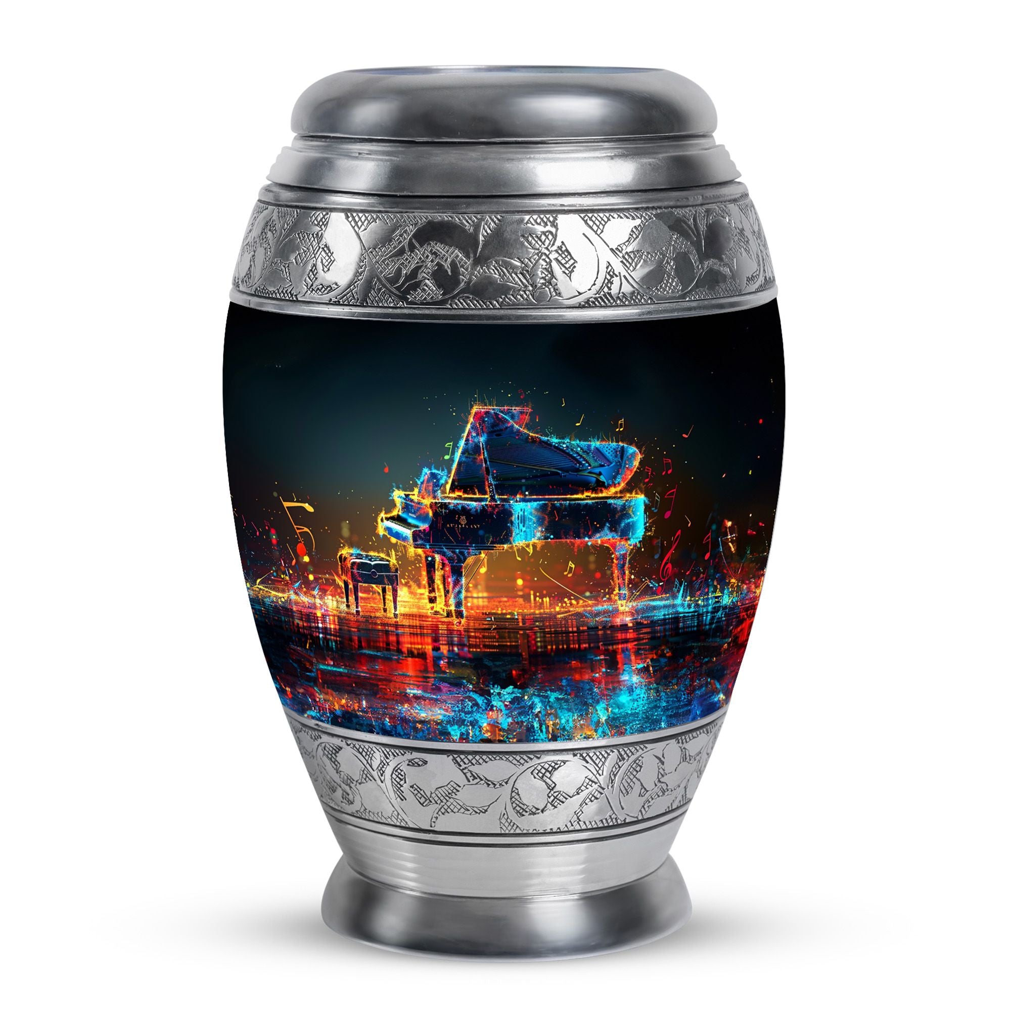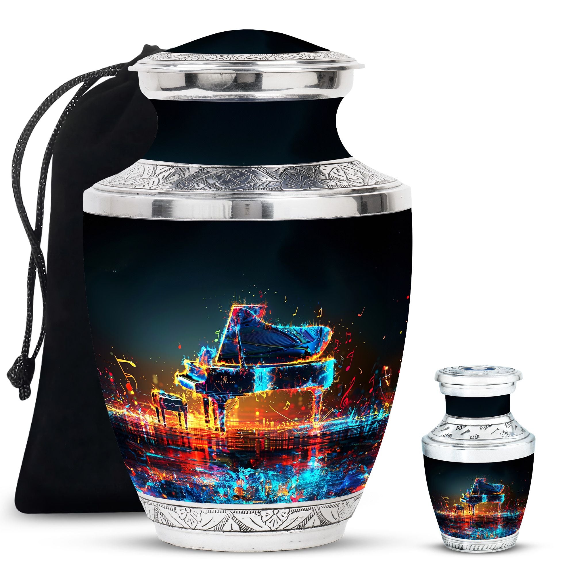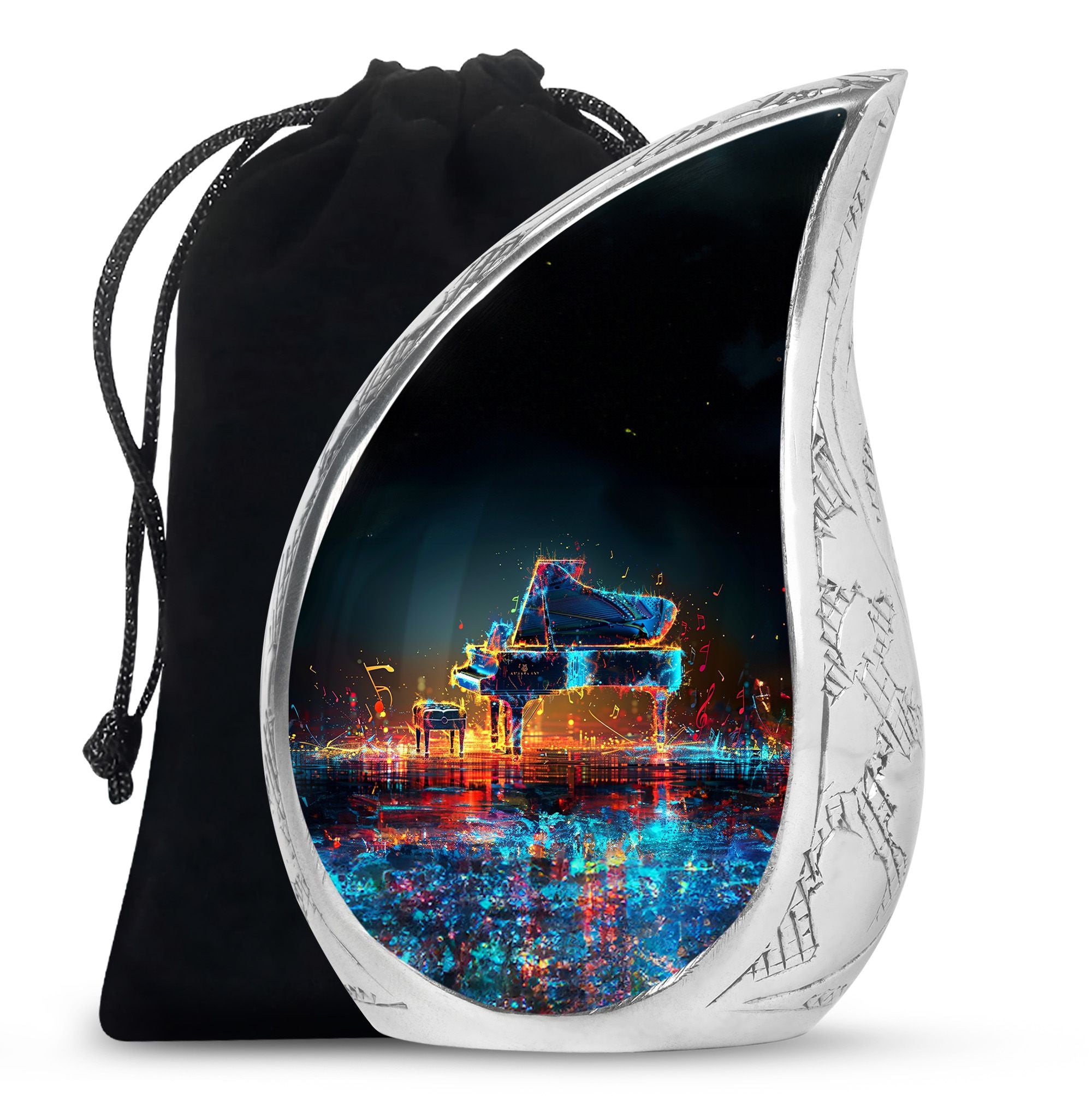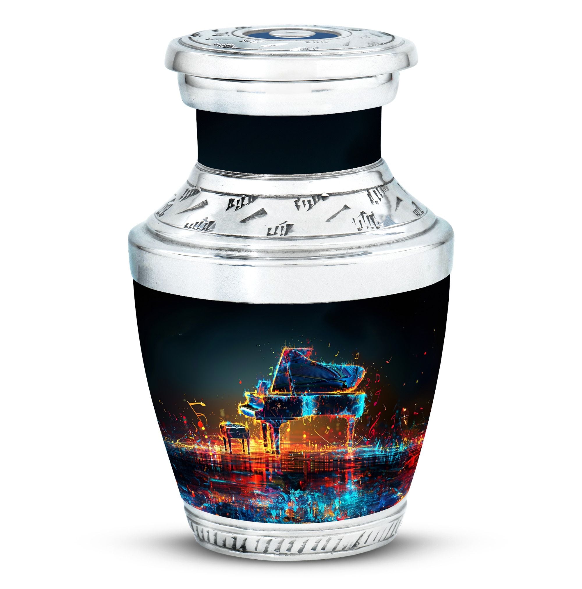 Crafted from high-quality aluminum, the urn features a vibrant, colorful piano-inspired design and a secure screw-top lid for safe storage. Its elegant artistry and durable construction make it suitable as cremation urns for human ashes adult female, urn for human ashes for men, or urns for cremation ashes female. Mini options are available as mini urn for ashes adult male or small urns for adult male, ensuring keepsake versatility.