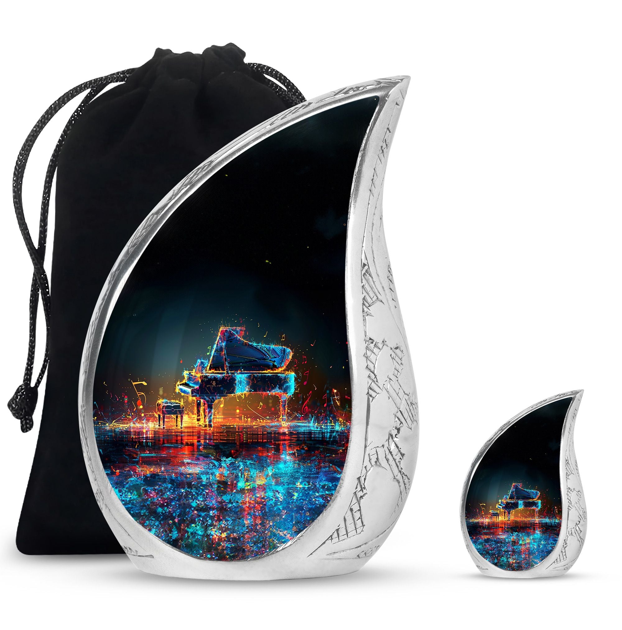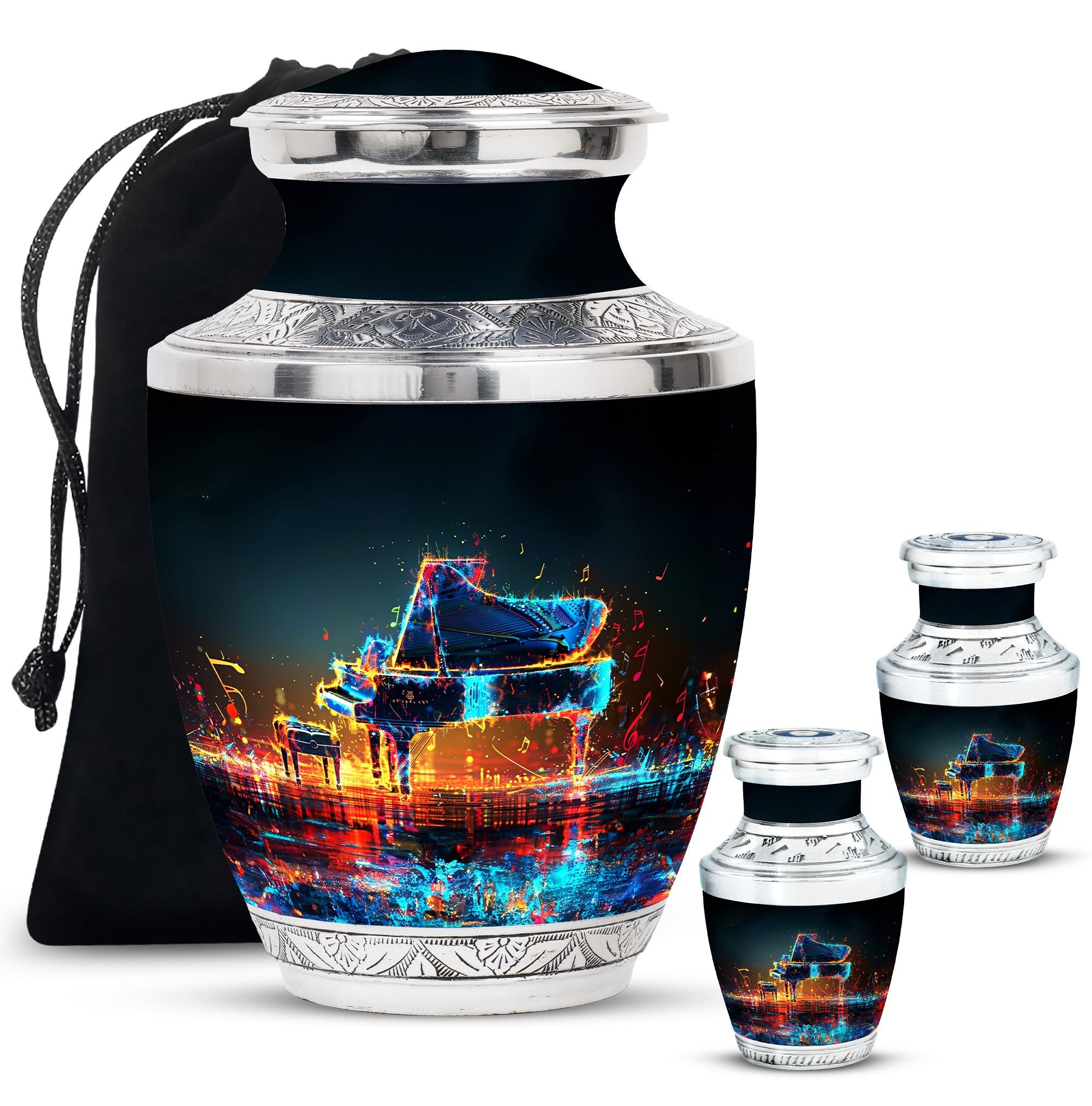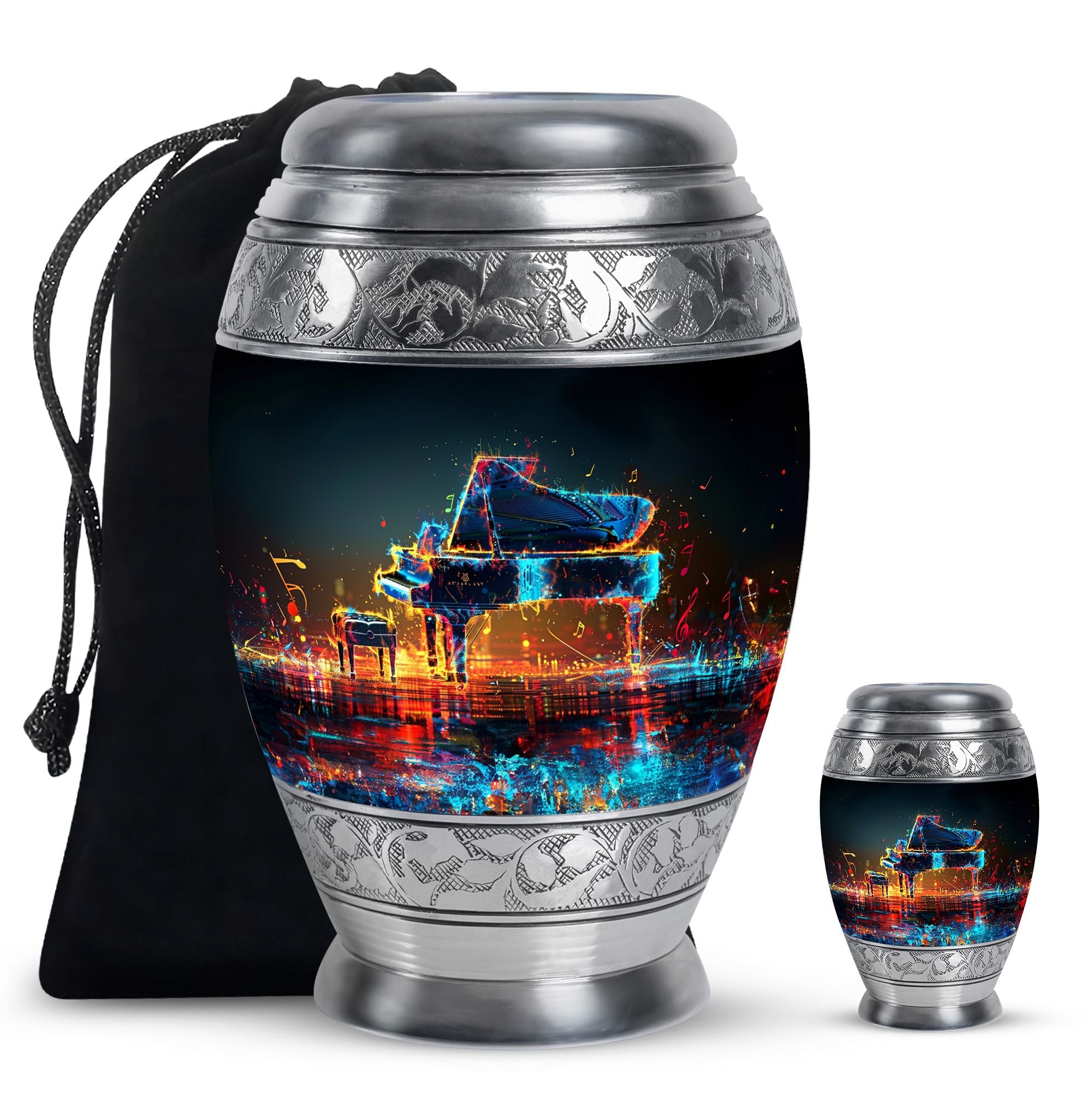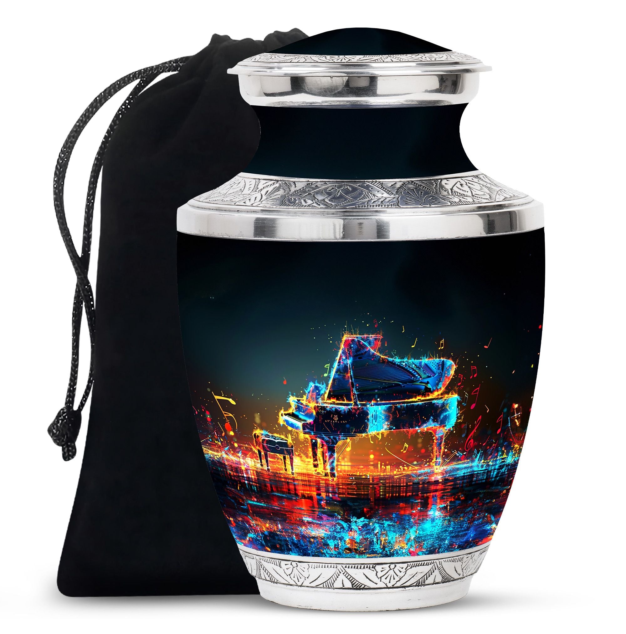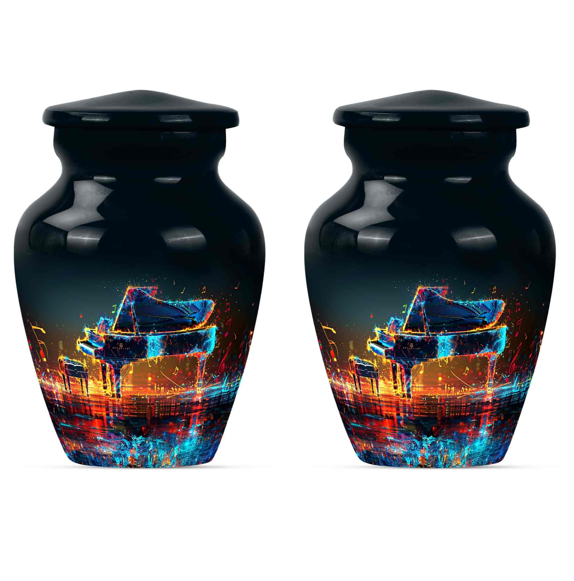 Crafted from high-quality aluminum, the urn features a vibrant, colorful piano-inspired design and a secure screw-top lid for safe storage. Its elegant artistry and durable construction make it suitable as cremation urns for human ashes adult female, urn for human ashes for men, or urns for cremation ashes female. Mini options are available as mini urn for ashes adult male or small urns for adult male, ensuring keepsake versatility.