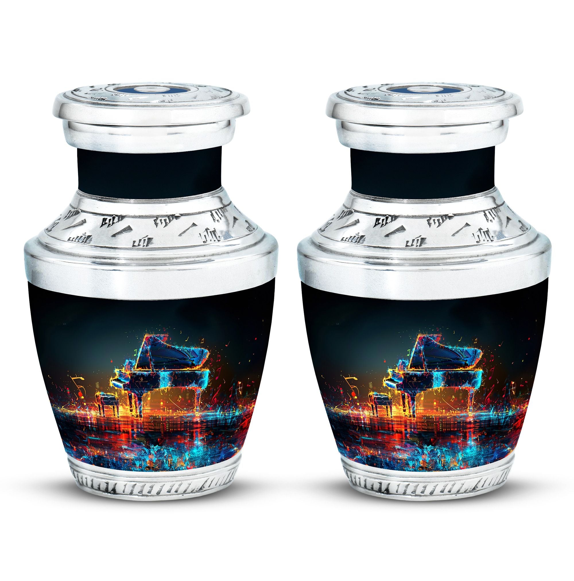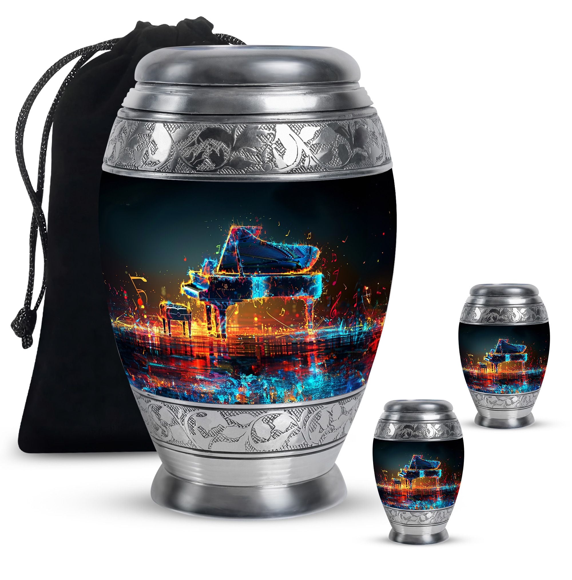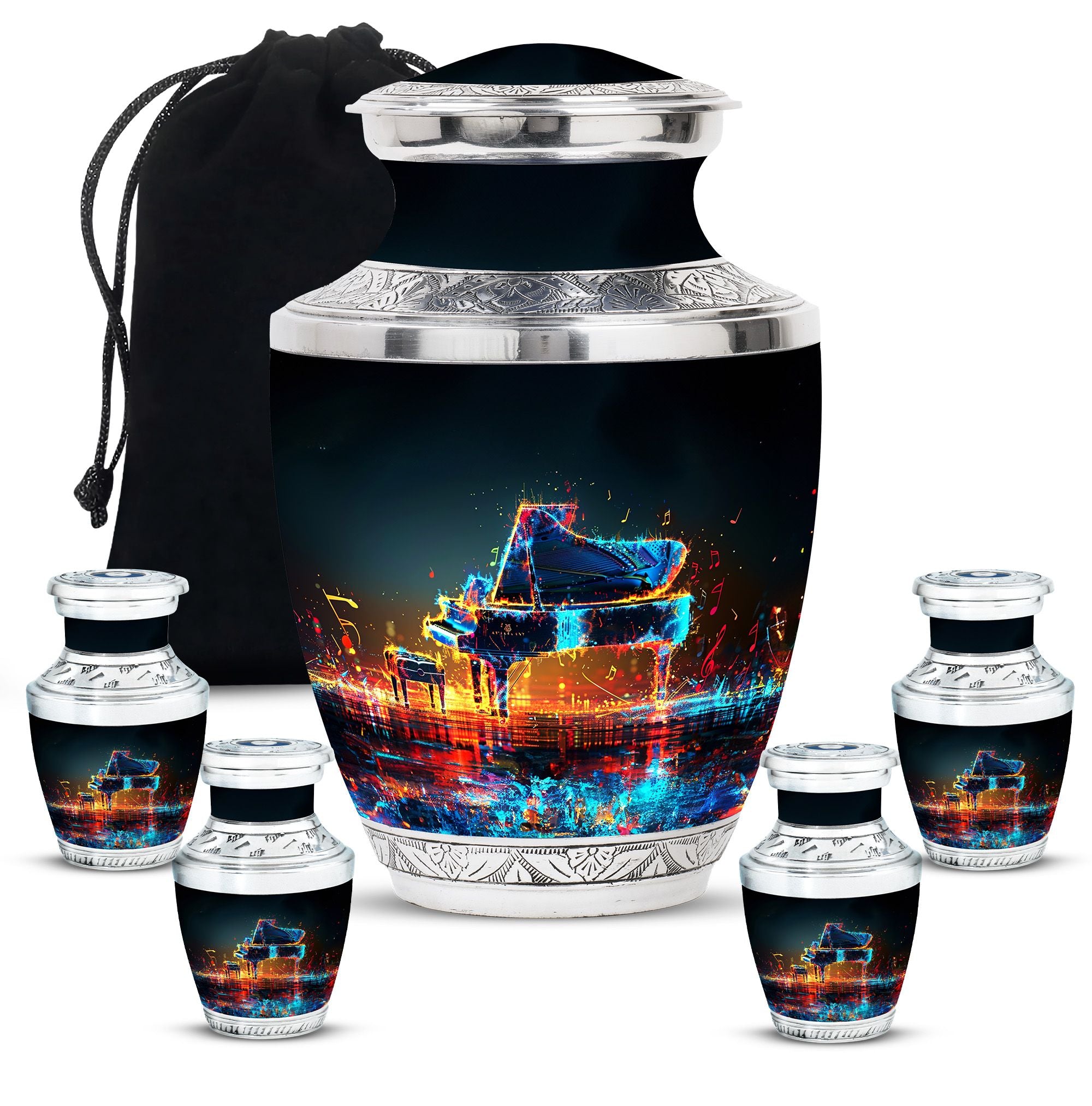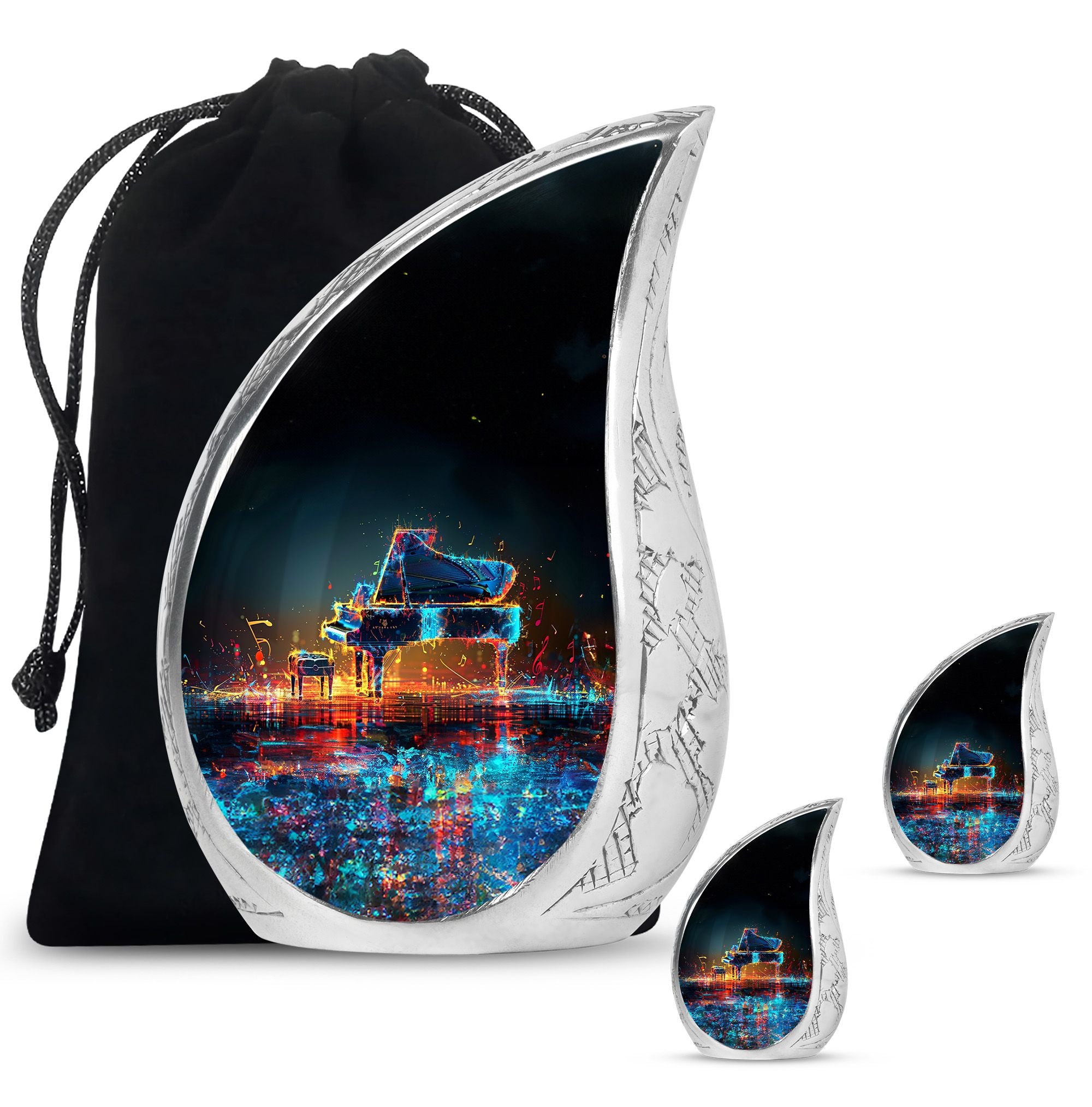 Crafted from high-quality aluminum, the urn features a vibrant, colorful piano-inspired design and a secure screw-top lid for safe storage. Its elegant artistry and durable construction make it suitable as cremation urns for human ashes adult female, urn for human ashes for men, or urns for cremation ashes female. Mini options are available as mini urn for ashes adult male or small urns for adult male, ensuring keepsake versatility.