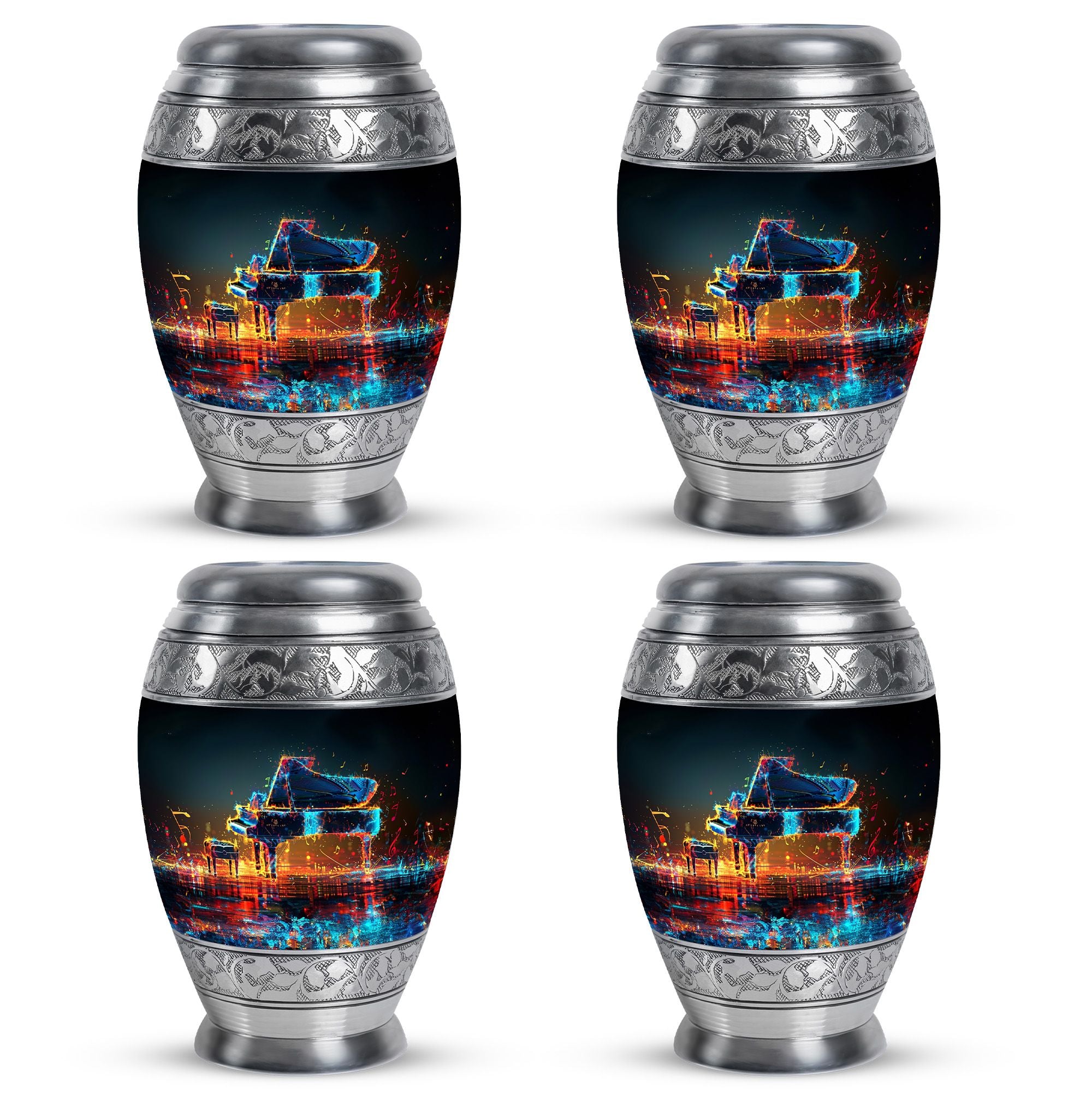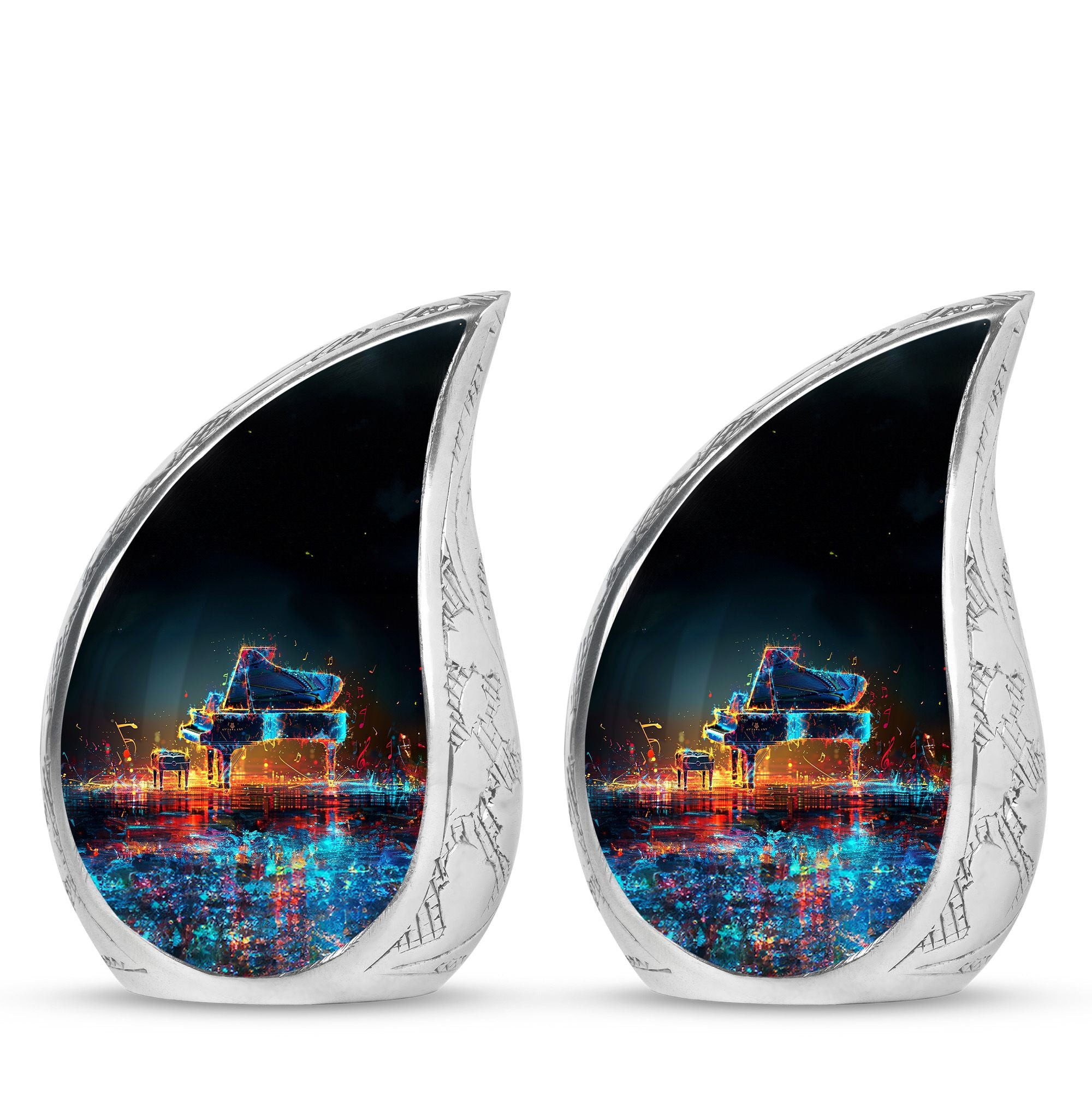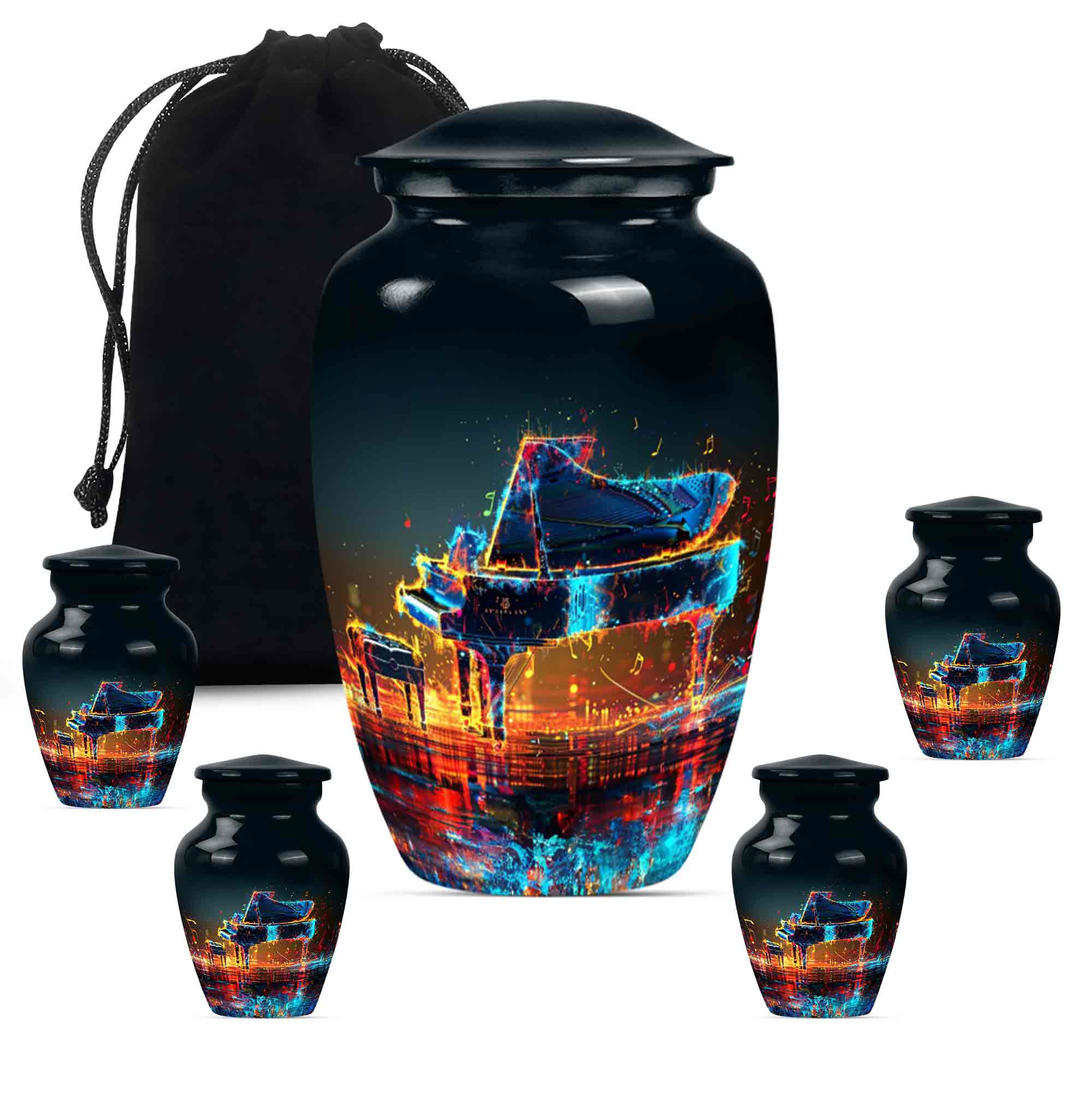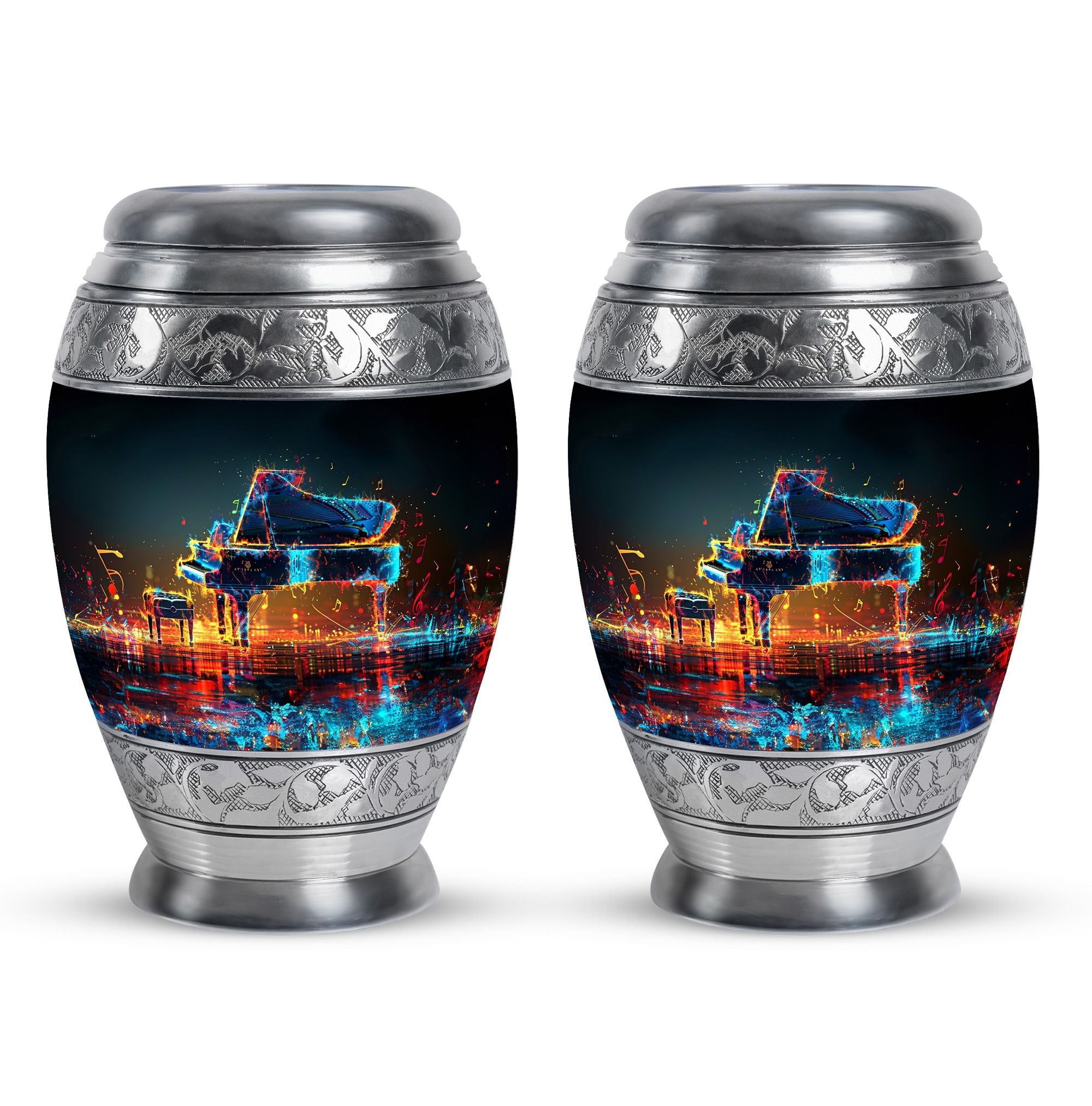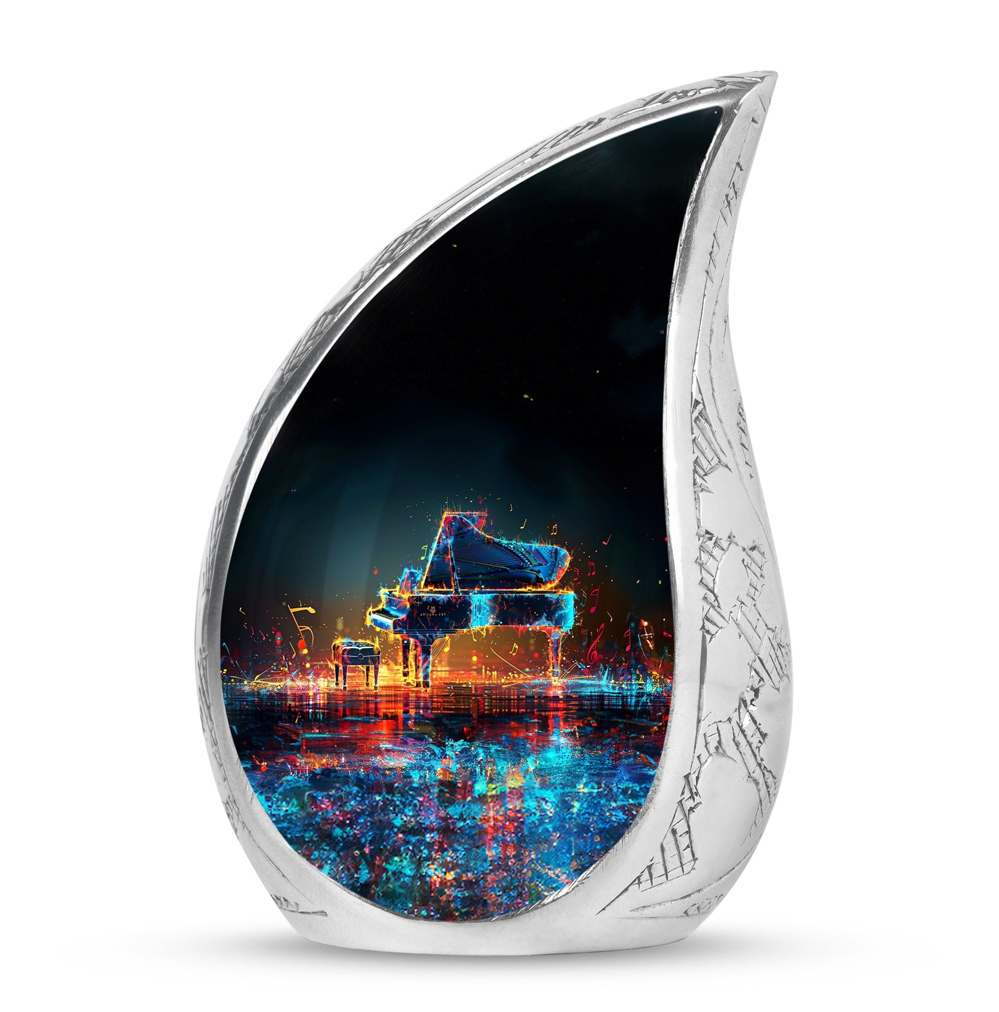 Crafted from high-quality aluminum, the urn features a vibrant, colorful piano-inspired design and a secure screw-top lid for safe storage. Its elegant artistry and durable construction make it suitable as cremation urns for human ashes adult female, urn for human ashes for men, or urns for cremation ashes female. Mini options are available as mini urn for ashes adult male or small urns for adult male, ensuring keepsake versatility.