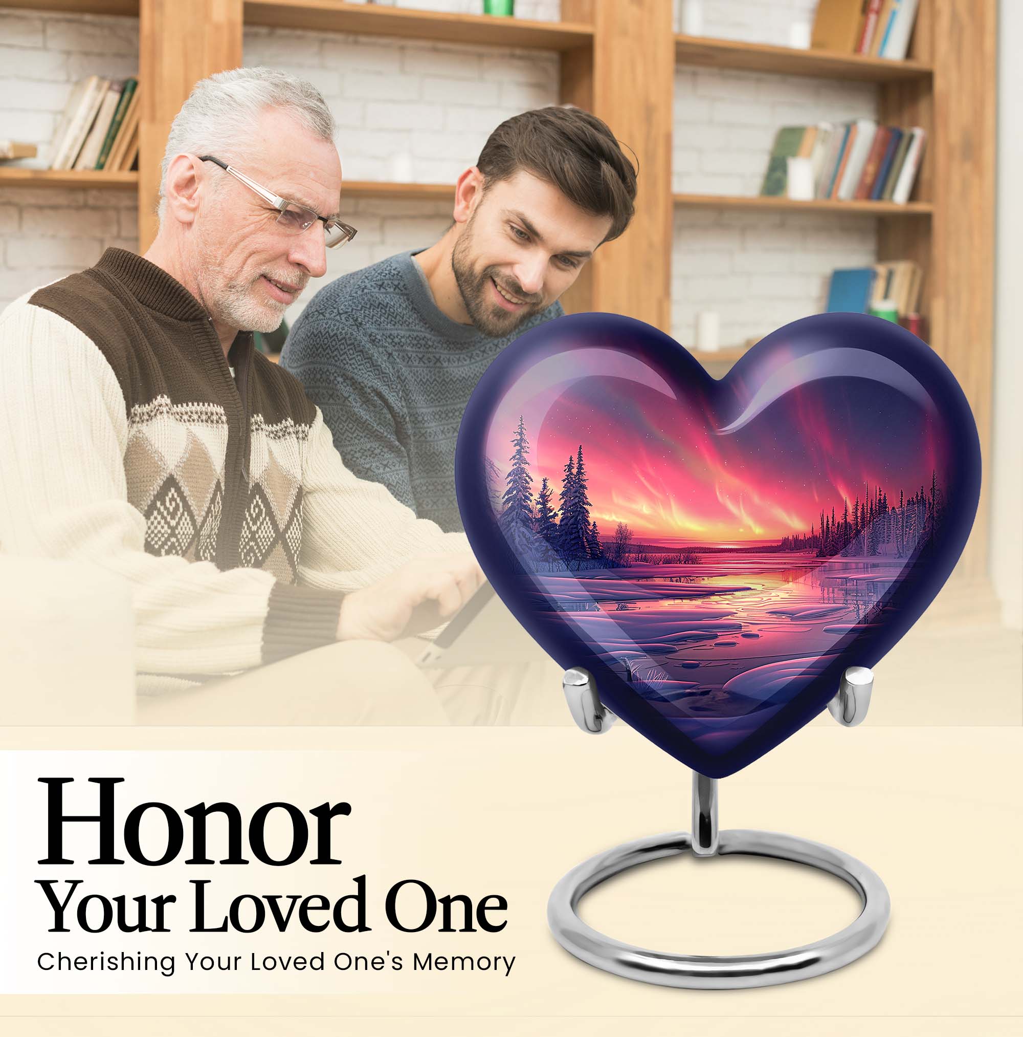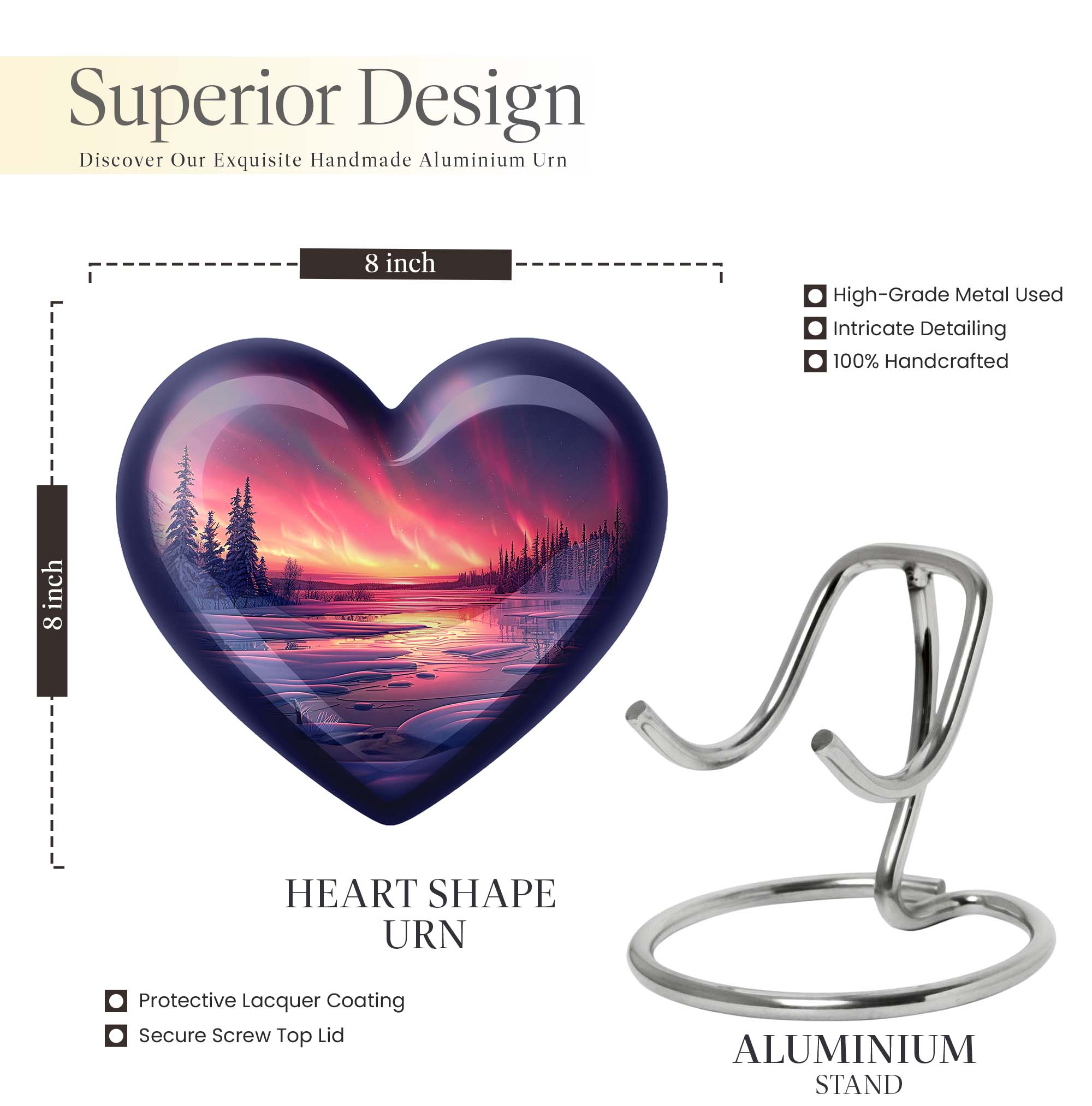 Preserve the memory of your loved ones with the large AURORA Urn, an abstractly themed, heart-shaped memorial urn beautifully created for an adult male. Standing at 10 inches in height and weighing a sturdy 3.3 pounds, it comes in a medium size and can contain up to 200 cubic inches of ashes. Constructed from durable aluminium material, it’s not just an urn, but a lifelong companion—symbolizing love and remembrance. Make it even more personal by adding engraved names, making it a unique touchstone that mirrors your sentiment. Every AURORA Urn comes impeccably packed in a velvet pouch, ensuring thoughtful containment of cremation remains. Thanks to its size, it's also an ideal choice as one of the companion cremation urns for 2 adults. Our AURORA Urns are also search-friendly for those seeking 'funeral medium size urns for human ashes' or 'urns for human ashes adult'.