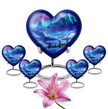 Unveiling the AURORA Urn, an exquisitely crafted medium-sized, memorial urn for human ashes, embodying an abstract theme. Compounded from high-quality aluminum, this large cremation urn is a testament of durability with a solid weight of 3.3 pounds. Its thoughtful size of 10 inches establishes a considerate capacity of 200 cubic inches, ample room for the containment of ashes. This unique heart urn celebrates the bond of love and the energy of life. The package also includes a velvet pouch for a dignified enclosure of your loved one's remains. Adding the final touch, the AURORA urn allows you to personalize with engraved names, ensuring a custom commemoration of your dearly departed. This product wonderfully encapsulates the essence of 'funeral medium size urns for human ashes' and is your answer to 'urns for cremation.' Reflect on the memories of your loved one with the AURORA Urn, where every detail is crafted with reverence.
