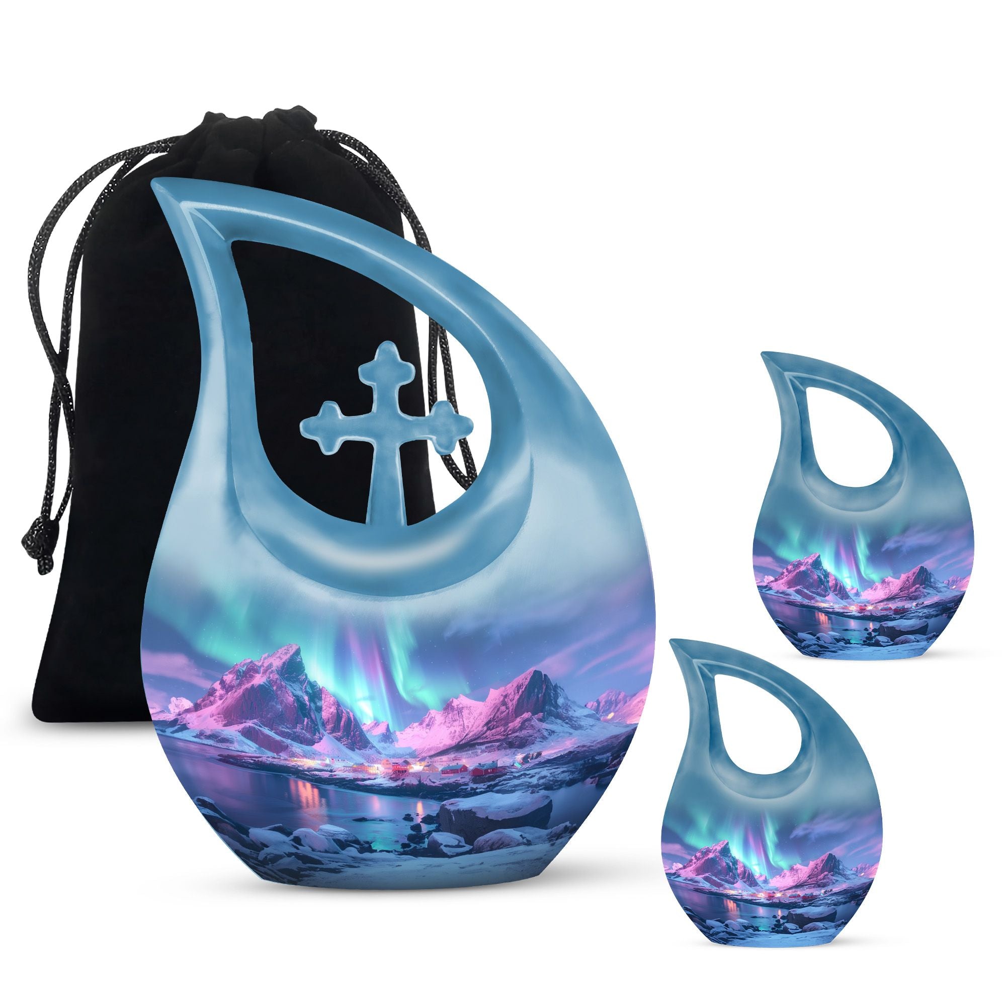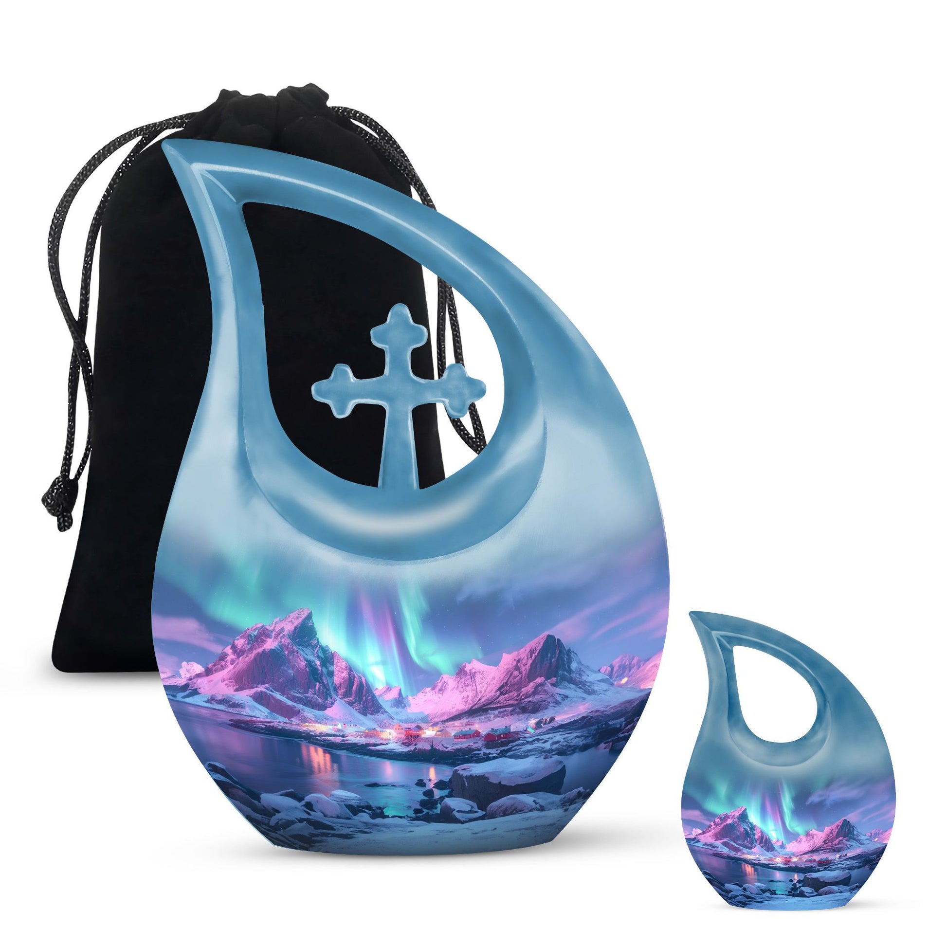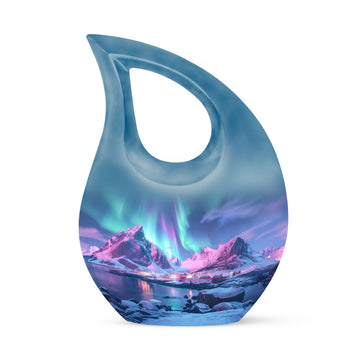 Handcrafted from durable aluminium, this urn showcases a serene pink and blue mountain scene beneath the glowing Northern Lights—symbolizing hope, peace, and eternal connection. Its compact size makes it perfect for families needing small cremation urns for ashes, small urn for cremation human ashes, or cremation urns for ashes for men. The secure screw-top lid ensures ashes remain protected, while the artistic design provides a comforting presence in any memorial setting.