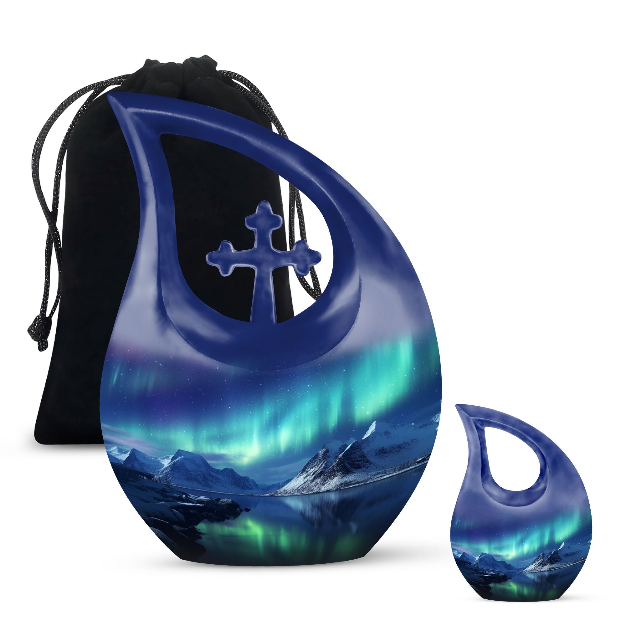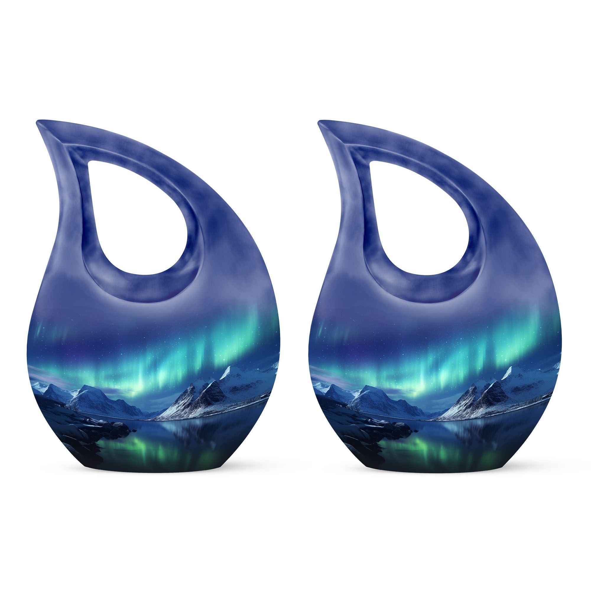 This urn combo set for funeral includes funeral urns for human ashes small, mini keepsake funeral urns, and funeral keepsake urns so family members can share ashes in personal keepsakes. As part of our unique urns for human ashes collection, this piece unites artistry and emotion — a unique urn for ashes that honors a life of beauty, strength, and light. Whether kept close or laid to rest as a burial urn for ground, the Northern Lights Memorial Urn offers a heartfelt reminder that love shines forever.