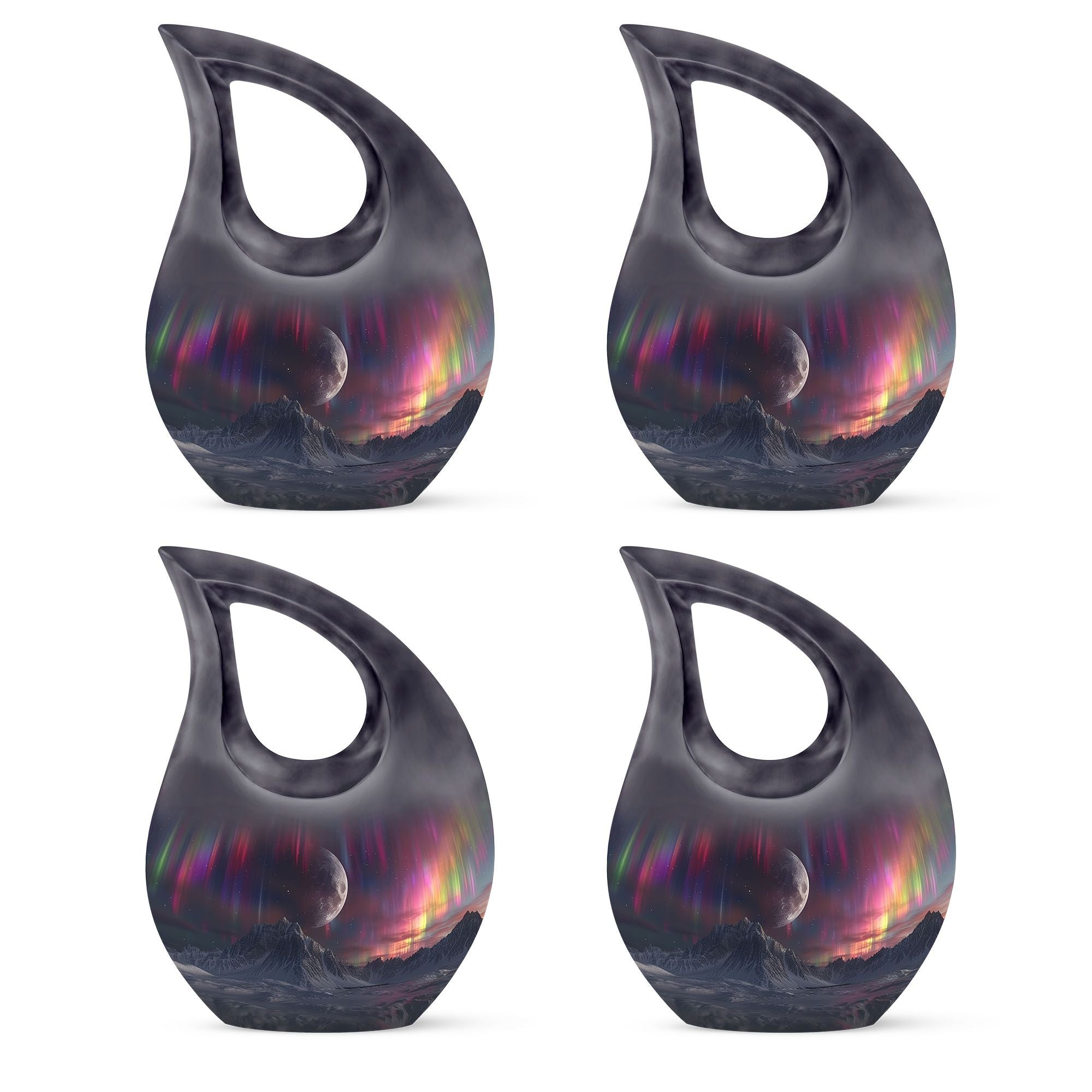 Expertly handcrafted from high-quality aluminum, this funeral adult urn reflects exceptional artistry and durability. The lustrous Northern Lights pattern swirls across a deep celestial background, representing the cosmic journey of the soul. Both the large and small funeral urns in this set feature a secure screw-top lid, ensuring your loved one’s ashes are protected with care. Ideal for home display, burial, or sharing ashes among family members, these keepsake funeral urns combine elegance and functionality.