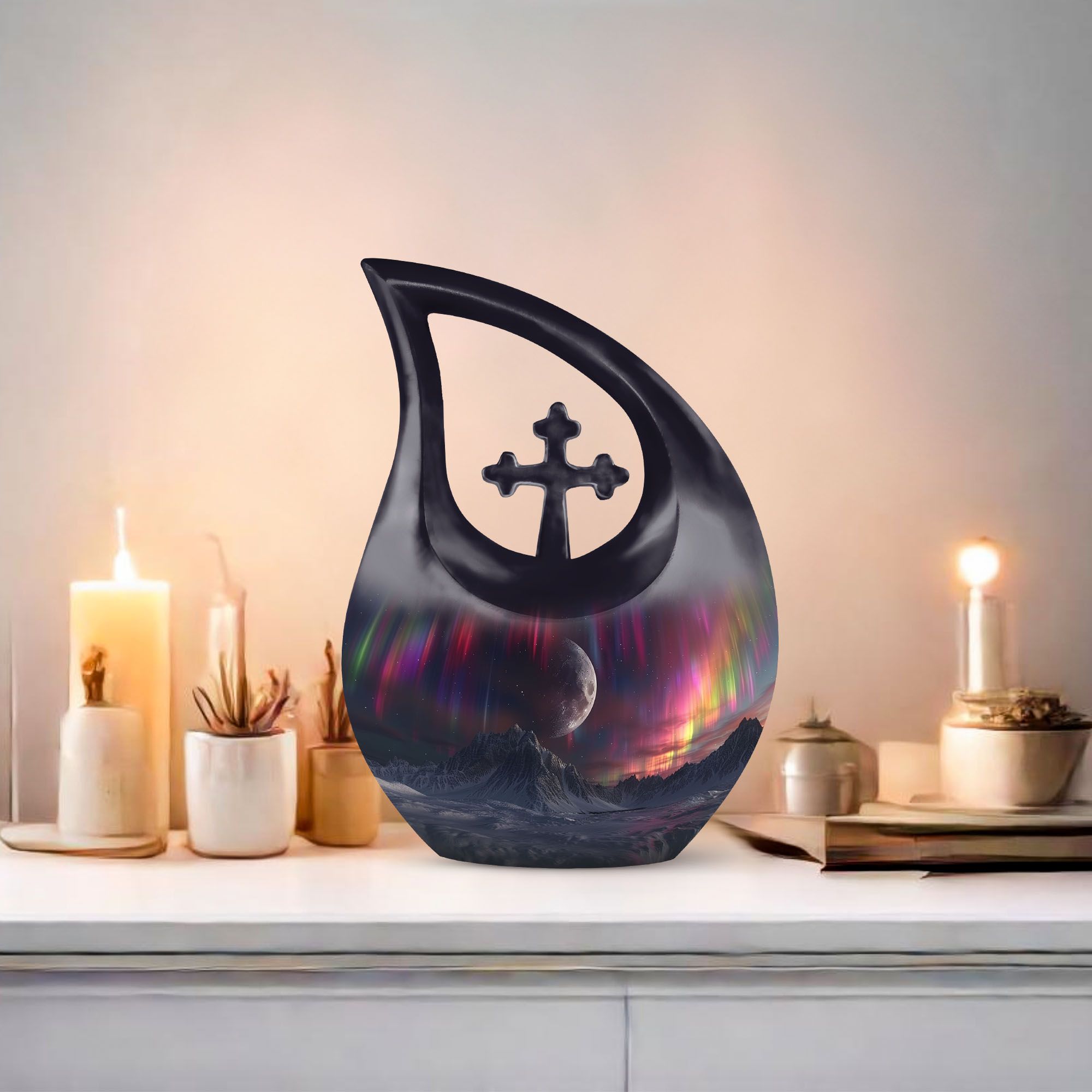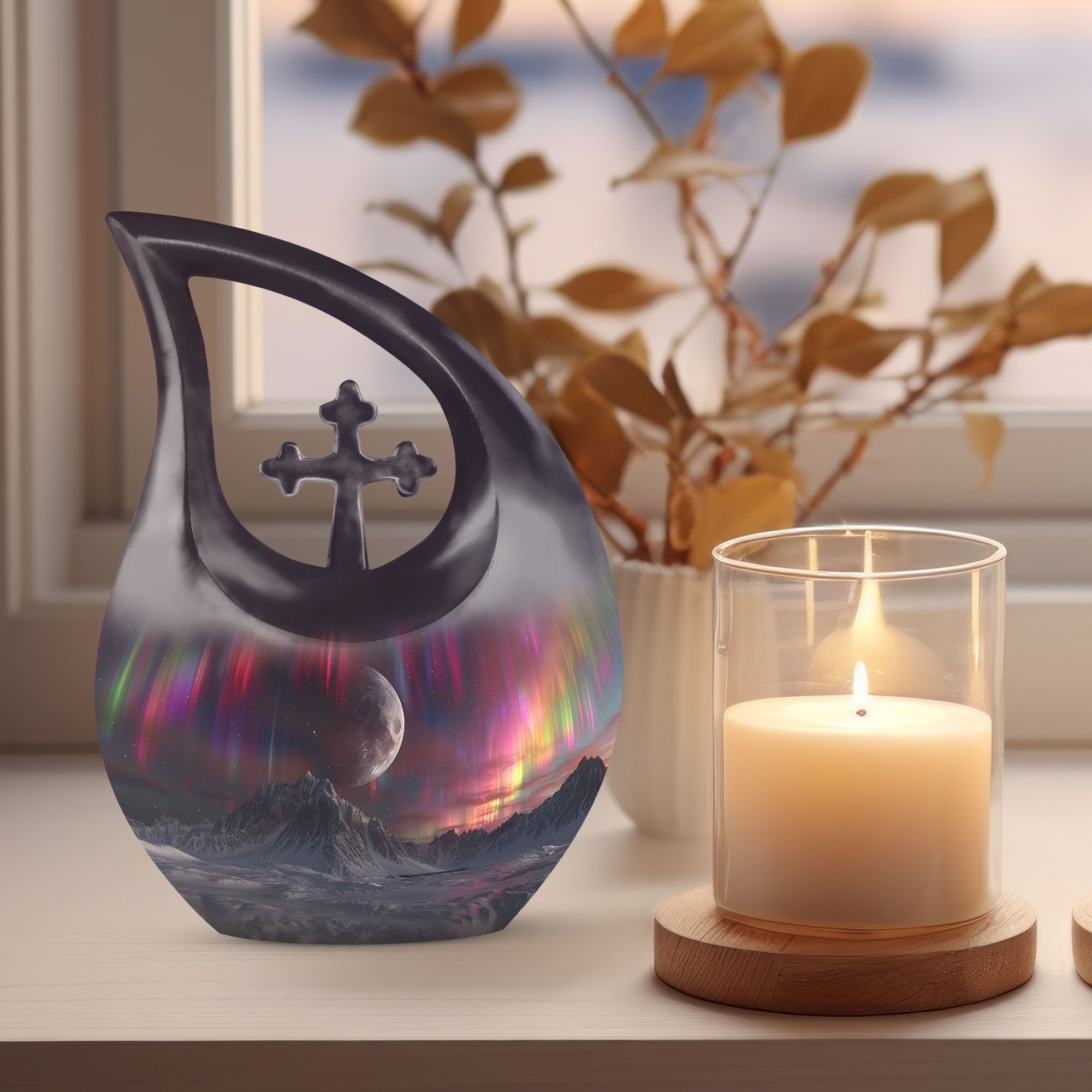 The Northern Lights Half Moon Urn is a radiant tribute that captures the breathtaking beauty of the aurora night sky. Designed to symbolize eternal peace and everlasting love, this exquisite piece provides a dignified resting place for your loved one. Whether chosen as funeral urns for ashes adult or as a cherished funeral urn ashes keepsake, it embodies compassion, serenity, and remembrance.