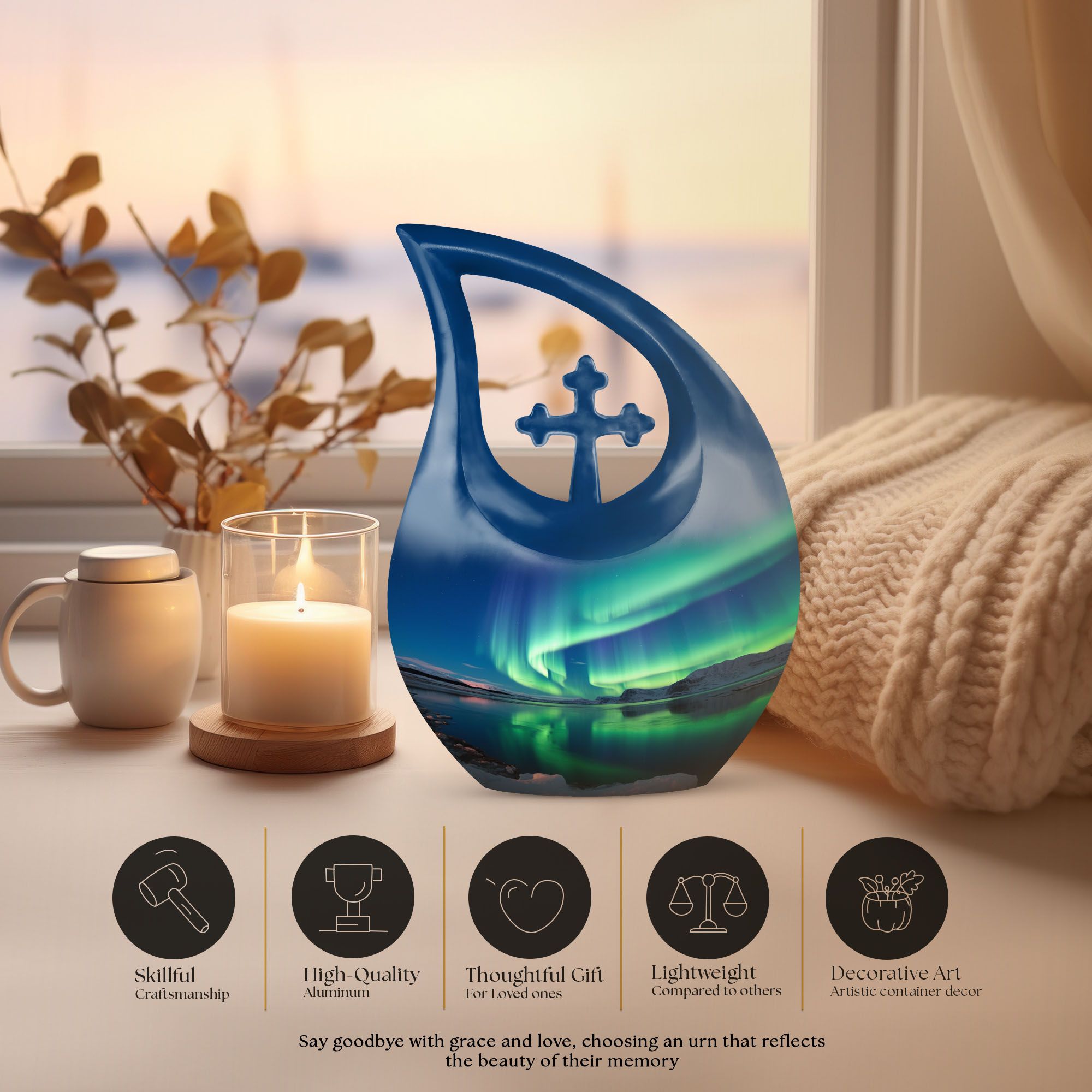 A gentle glow reflects from its surface, symbolizing everlasting connection. The Northern Lights Cremation Urn is more than a container—it’s a masterpiece of remembrance for anyone seeking meaningful funeral urns for human ashes.