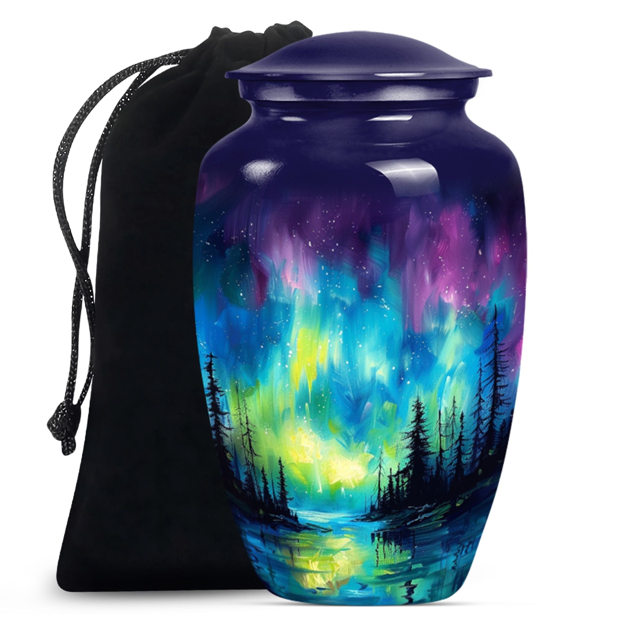 Discover the profound serenity of the northern lights Urn, a unique cremation urn engineered for graceful commemoration. Evoking the calming tones of a 'Purple Meadow', this large 10-inch urn stands as a spiritual sanctuary for your loved ones. Elegantly handcrafted from robust aluminium, it bears the weight of remembrance with a solace-filled capacity of 200 cubic inches. The urn package entails a velvet pouch, purposed for the respectful containment of ashes, manifesting an intimate touch. With the added feature of personal customization - engrave names to hold onto the cherished sentiments. Specific in its weight, this funeral urn for an adult male dad or any loved one weighs at 3.3 pounds, signifying the durable nature of the urn. Avoid the common, choose this elegant northern lights Urn - a dignified approach to memorial ceremonies.
