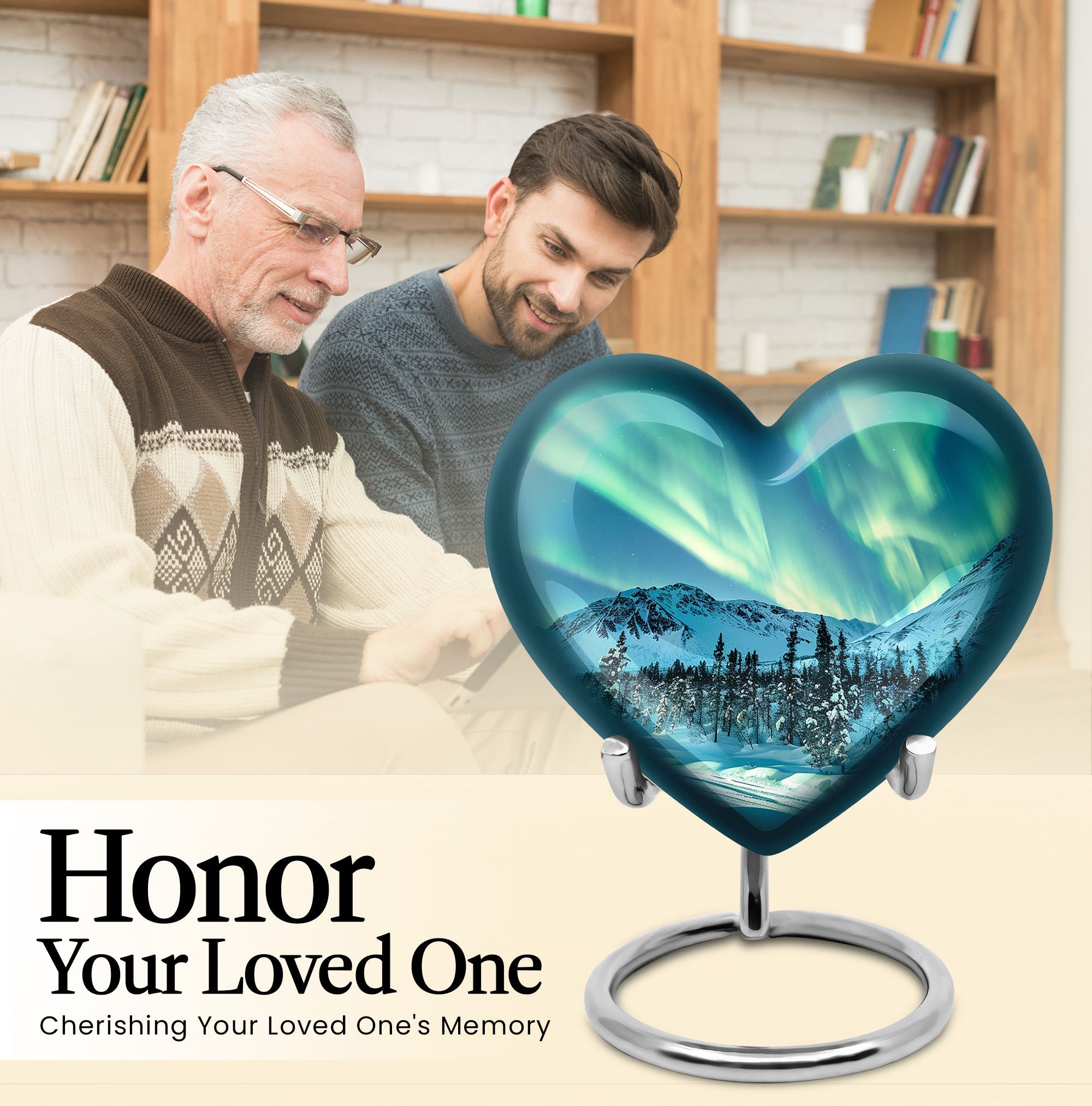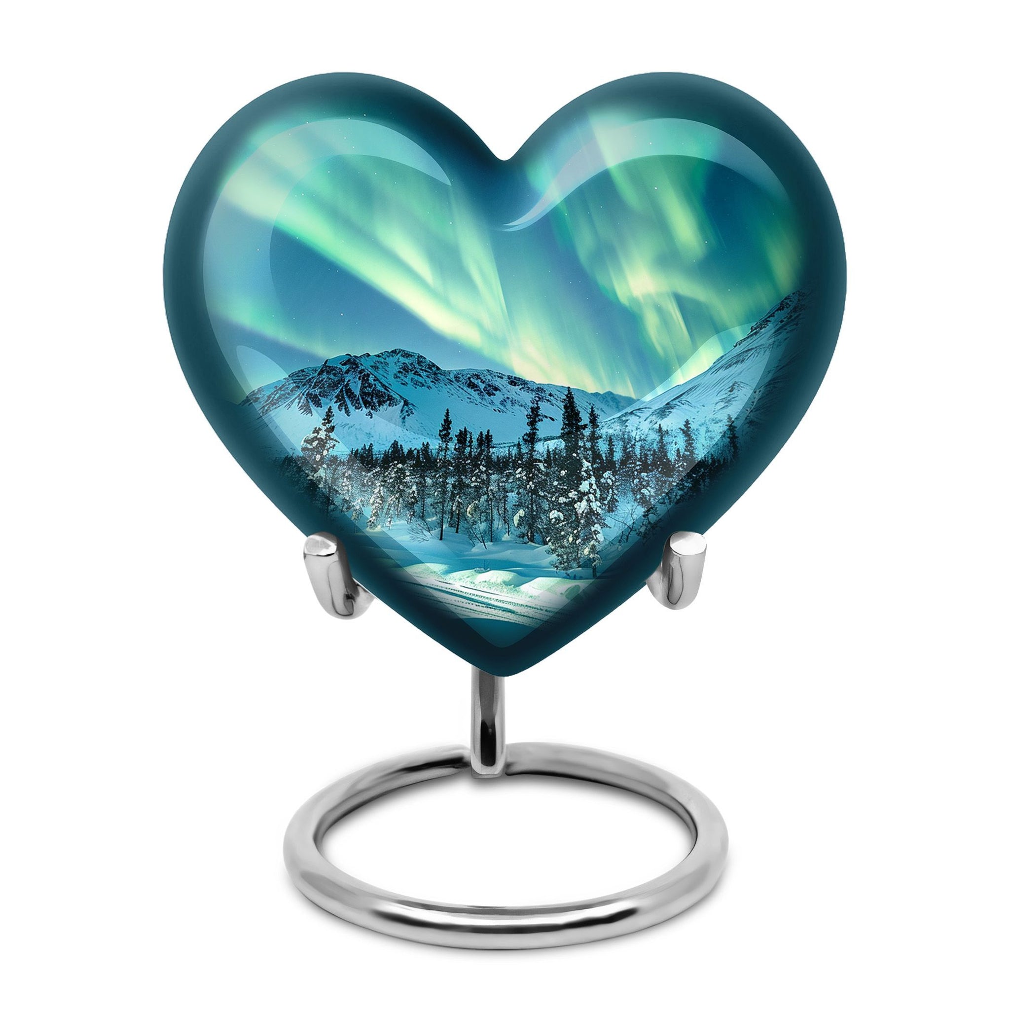 Commemorate your cherished ones with our Northern Lights Heart Urn, a unique and sophisticated choice for memorial ceremony supplies. This cremation urn, crafted from robust aluminium, offers a tasteful abstraction theme that suits any decor. With a generous capacity of 200 cubic inches, the urn can accommodate human ashes discreetly and respectfully. It boasts a size of 10 inches in both dimensions and weight of 3.3 pounds, signifying its sturdy build. A velvet pouch is provided with your purchase to safely contain the ashes, adding an extra layer of consideration and respect. Adding to its distinctiveness, avail the option to personalize the urn with engraved names, offering a bespoke touch to your treasured memory. Both respectful and elegant, this large cremation urn merges both sentimental value and striking design. Ideal for those seeking memorial medium urns for ashes, this product signifies a memorable and respectable tribute.