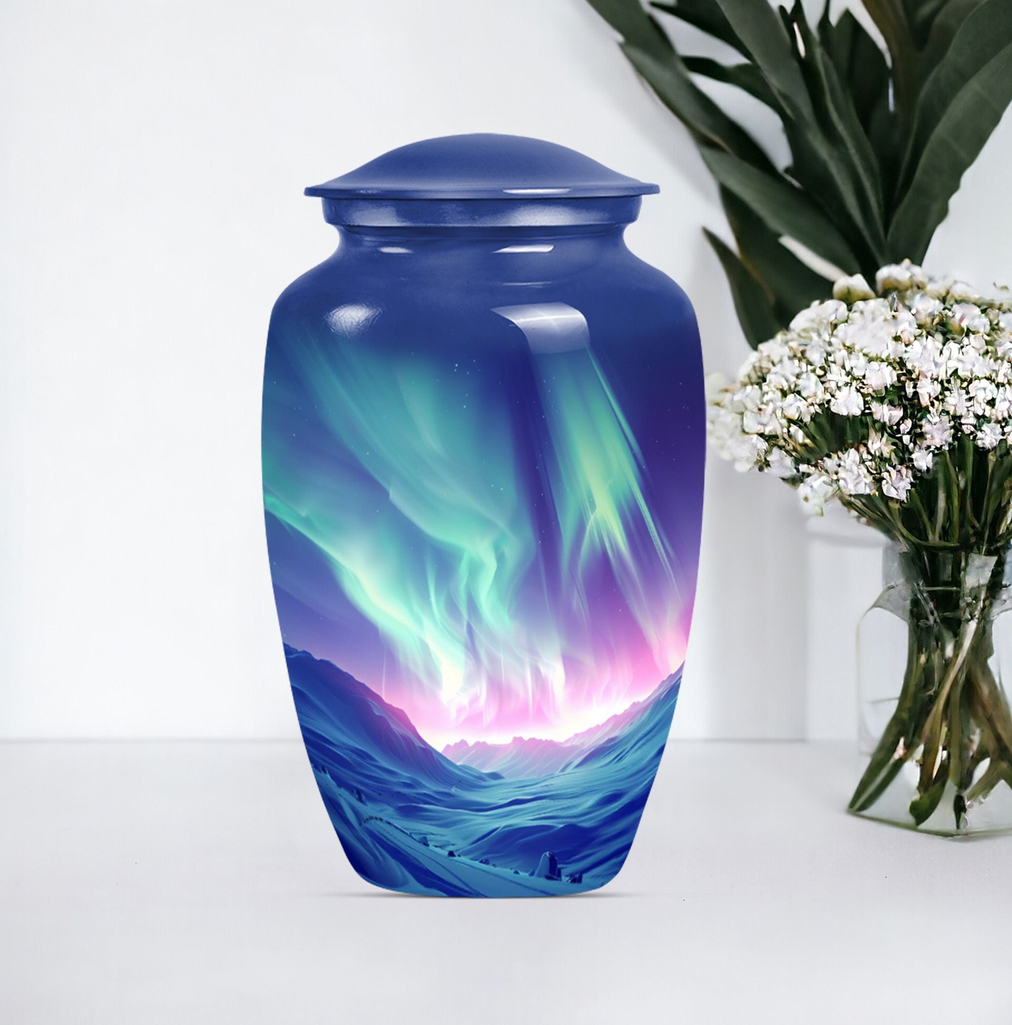 Honor the memory of your loved ones with our Northern Lights Urn, an embodiment of dignity and respect, love and remembrance. This 10-inch high urn, characterized by its abstract theme, is meticulously crafted from durable aluminium, ideal for seniors desiring an enduring and significant memorial for their loved ones. Weighing a modest 3.3 pounds, this large urn for ashes showcases an impressive capacity of 200 cubic inches, effortlessly holding up the ashes of the departed. The urn comes with a velvet pouch, ensuring a secure and discreet containment of your loved ones’ ashes. Moreover, our unique and rare northern lights urn offers customization options, allowing you to personalize this timeless keepsake with engraved names, adding a one-of-a-kind touch. Appreciated as a thoughtful memorial gift or as a purposeful addition to a personal collection, this classic urn resonates with sentiments of respect and remembrance. Keywords: Northern lights urn, burial large urn for ashes for women, memorial urns, burial cremation urns for adult women, cremation urn urn man, memorial gifts, large double cremation urn for two adults.