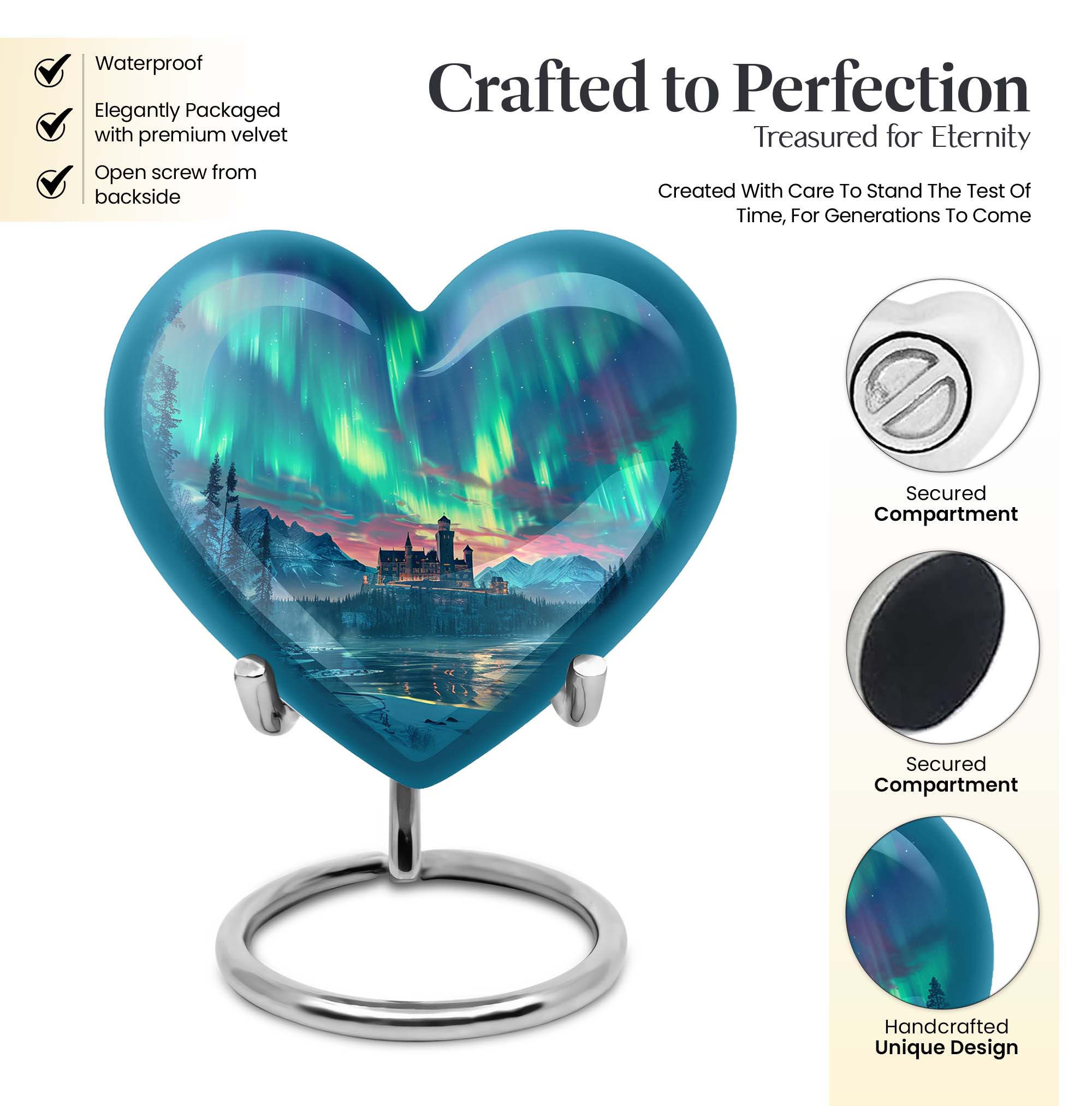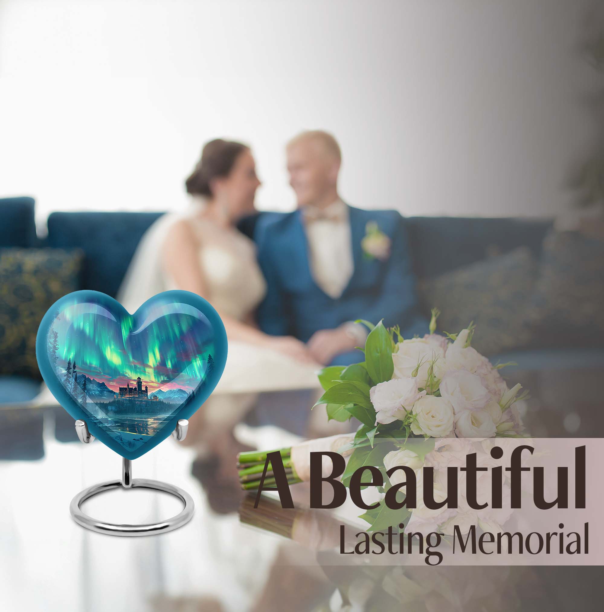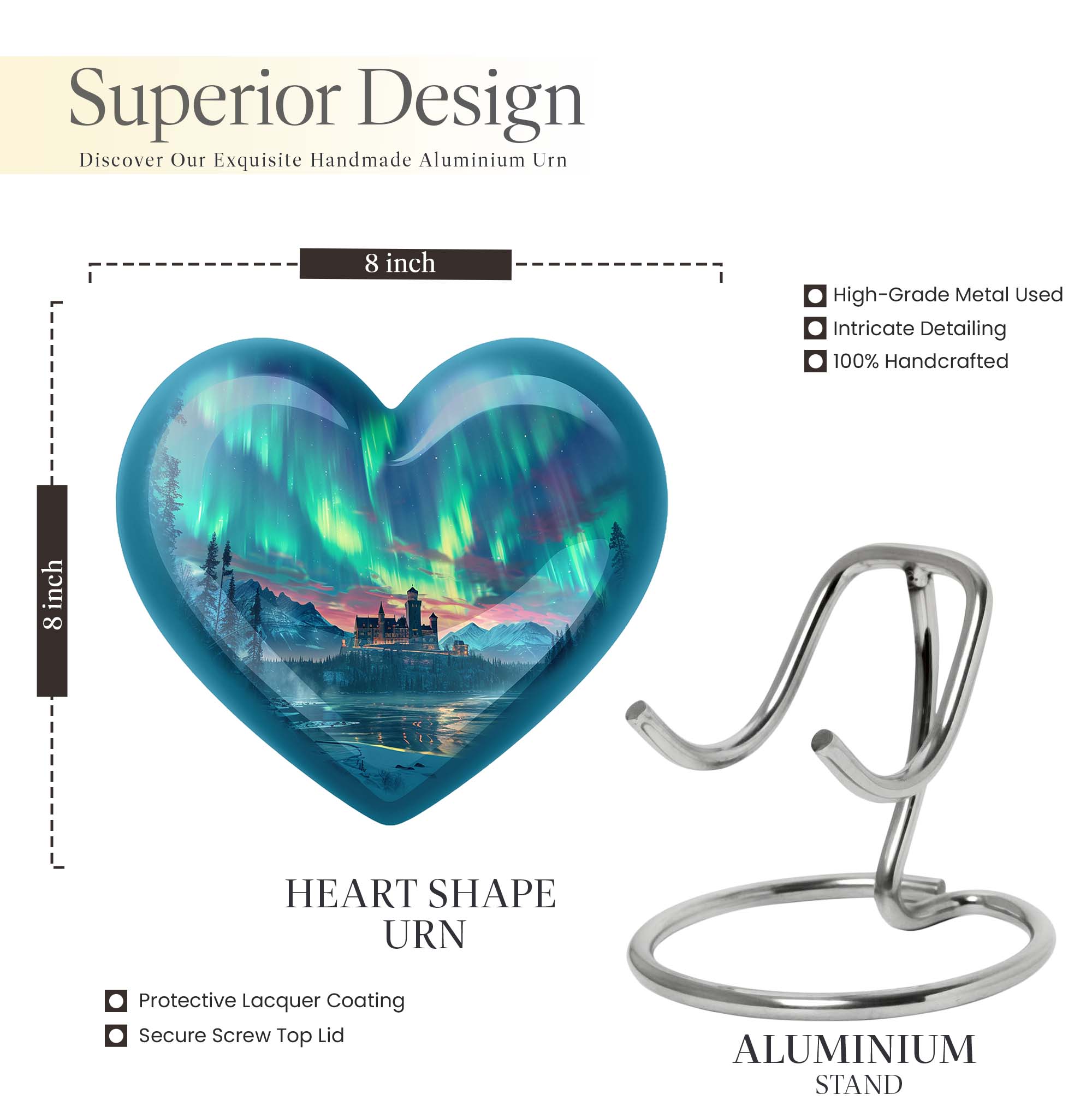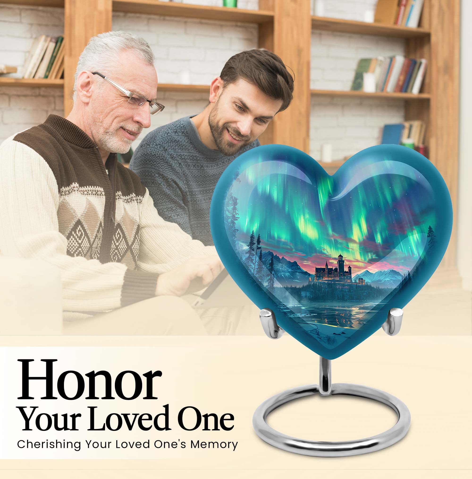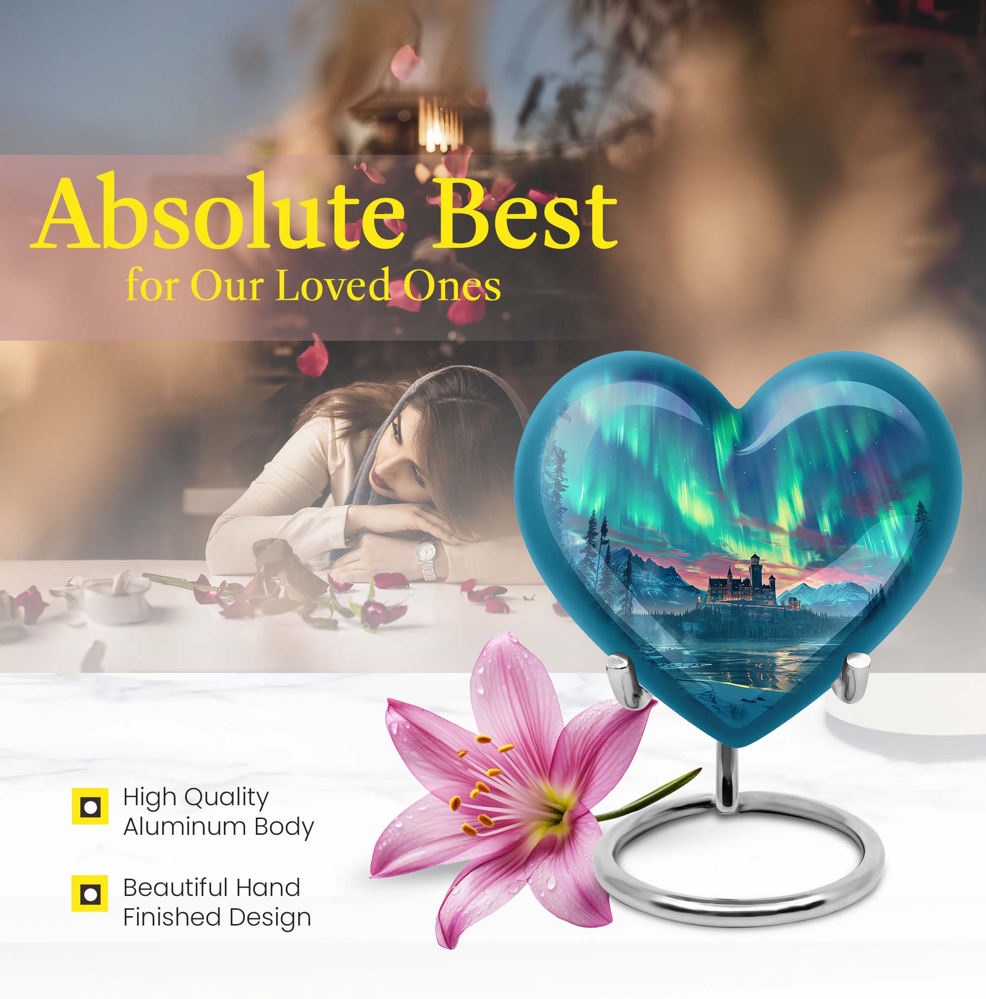 Featuring a heartwarming theme of 'Purple Meadow', this 'Northern Lights Urn' truly captures the essence of fond remembrances. As a large urn designed specifically to honor your loved one, this 10-inch funeral ash urn has a capacity of 200 cubic inches- ample space to gently secure remains. The urn weighs 3.3 pounds , and, made from robust aluminum, it embodies lasting tribute. This keepsake includes an elegant velvet pouch, ensuring dignified shelter for the ashes. Adding a unique personalized touch, we offer engraved names as part of the customization features. This alignment towards bespoke reverence sets our memorial urns apart. Ideal for adults and seniors seeking 'unique urns' or 'metal urns for adult human ashes', our urn serves as a heartfelt tribute. 'Memorial urn for mom ashes' or 'human ash urns', no matter your search, our product embodies a compassionate memorial.
