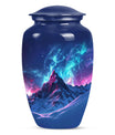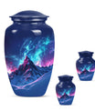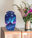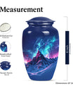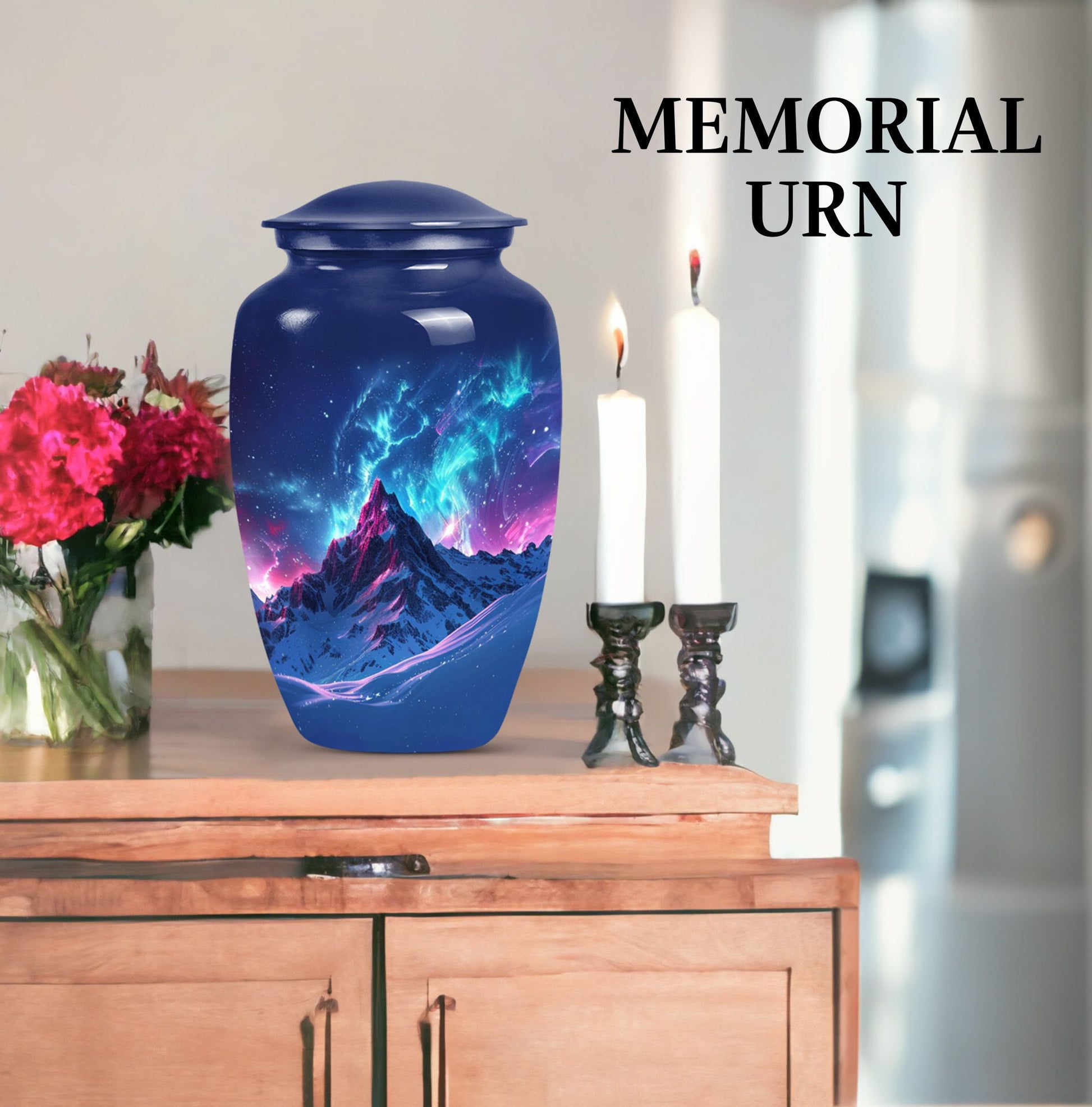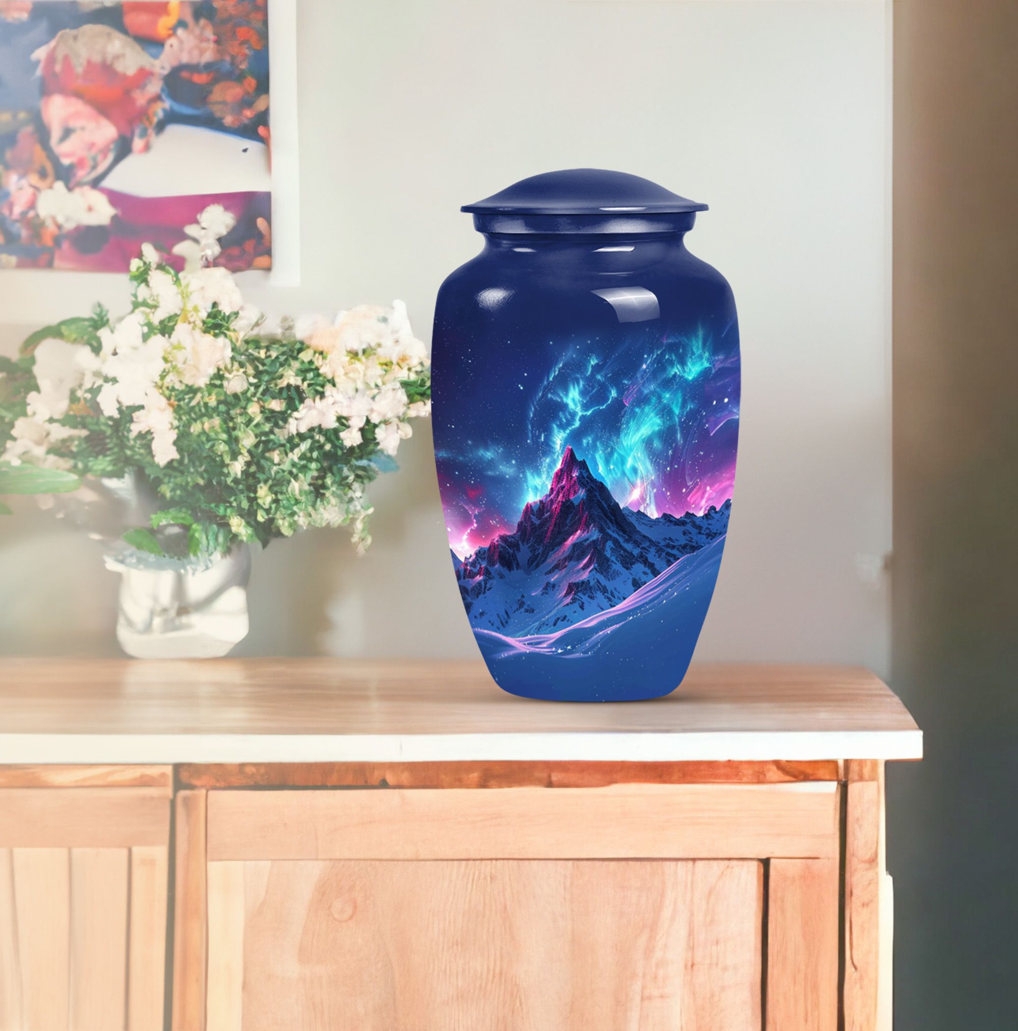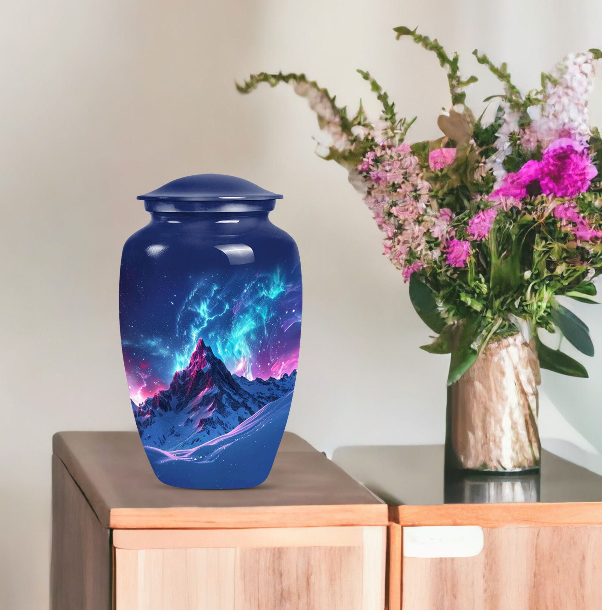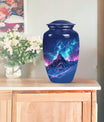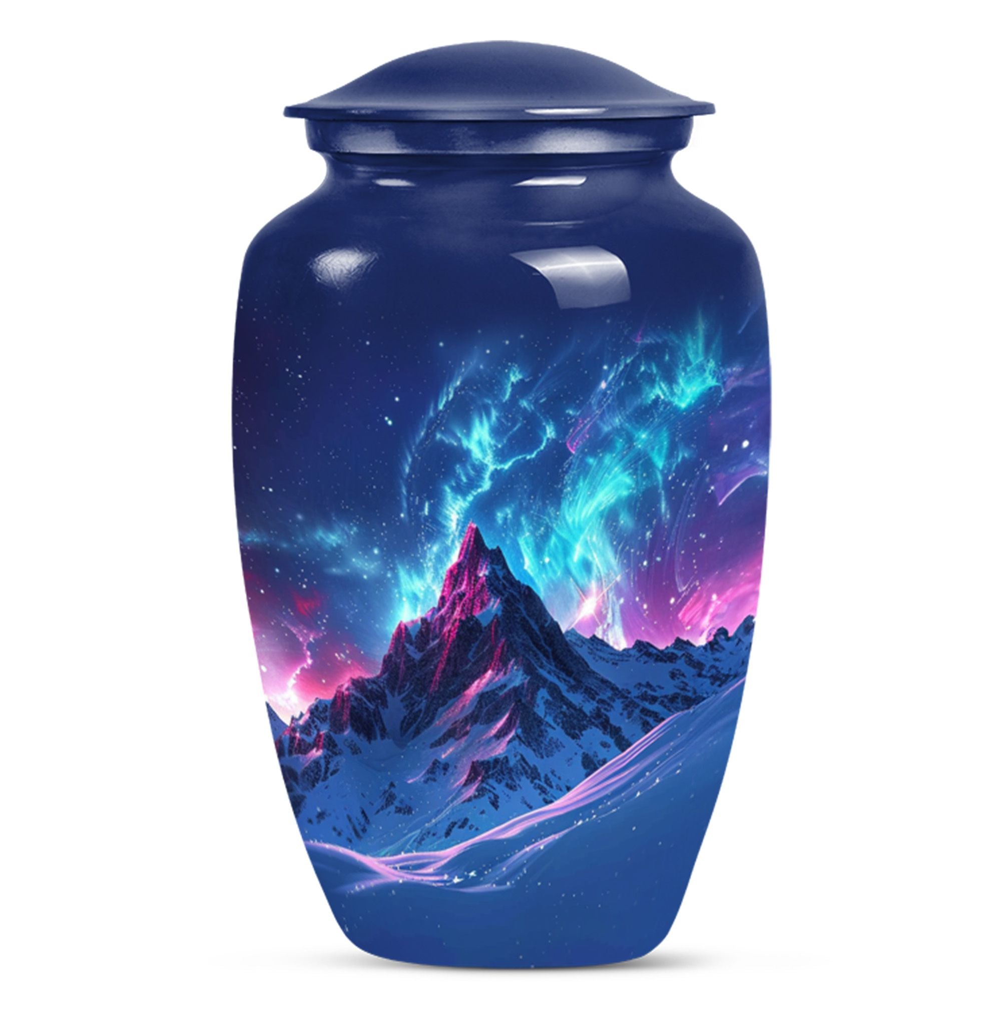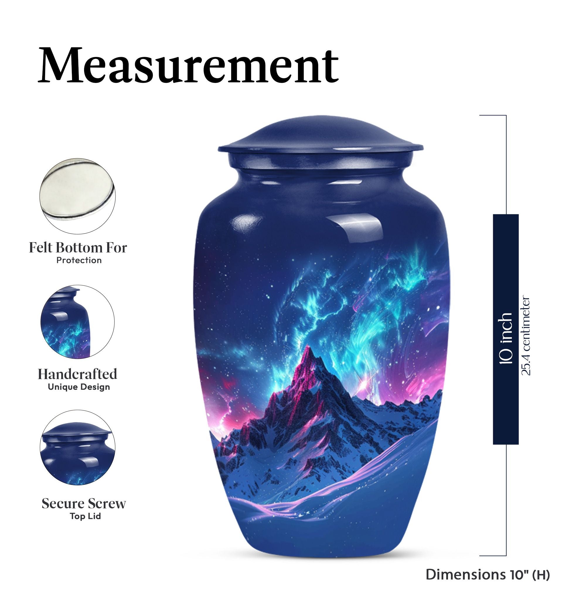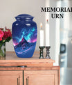 Experience the entrancing Northern Lights through our regally designed large urns, precision crafted for individuals seeking ceremoniously elegant cremation urns for adult males. This classic urn, crowned with an enchanting butterfly theme, merges both strength and gentleness in its design statement. Standing 10 inches in height, this urn can comfortably hold 200 cubic inches, ideal for cremation ashes of both men and women. Each urn is weighted at 3.3 pounds and designed with the utmost precision from high-grade aluminium. Our unique offering comes with a velvet pouch for containment of ashes, ensuring dignified storage. Plus, you can add a personal touch by customizing your choice with engraved names, making this piece more than just a memorial urn, but a cherished keepsake. Whether you're looking for funeral metal urns or burial urns to be placed in the ground, this beautiful piece in our collection fits the purpose.