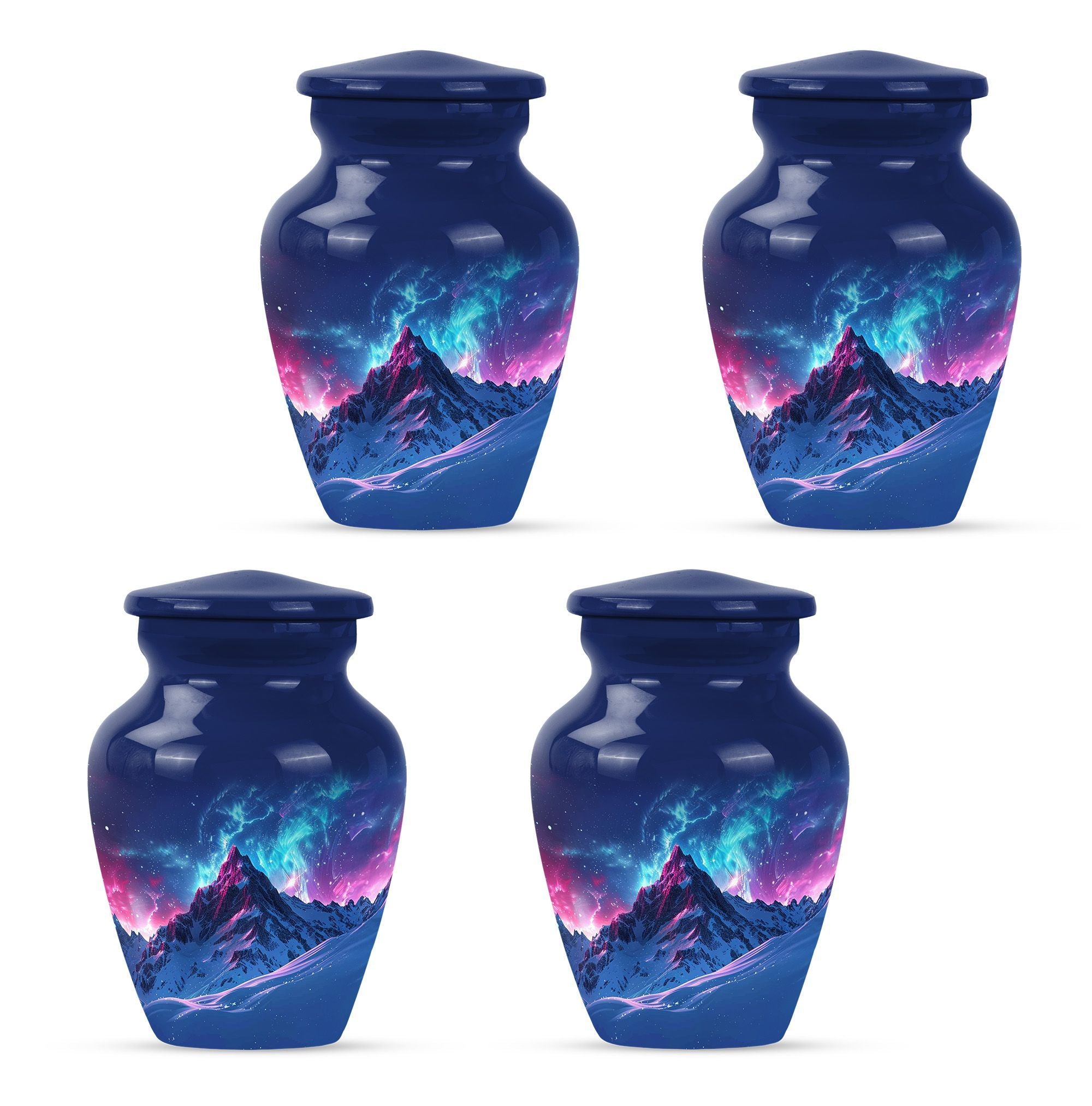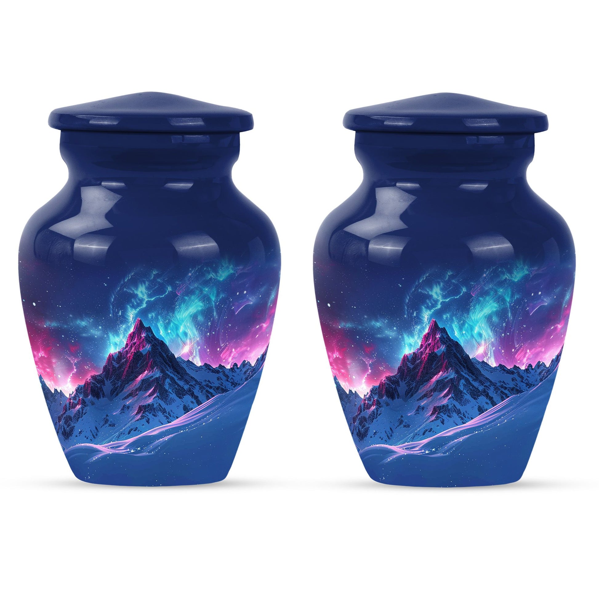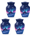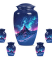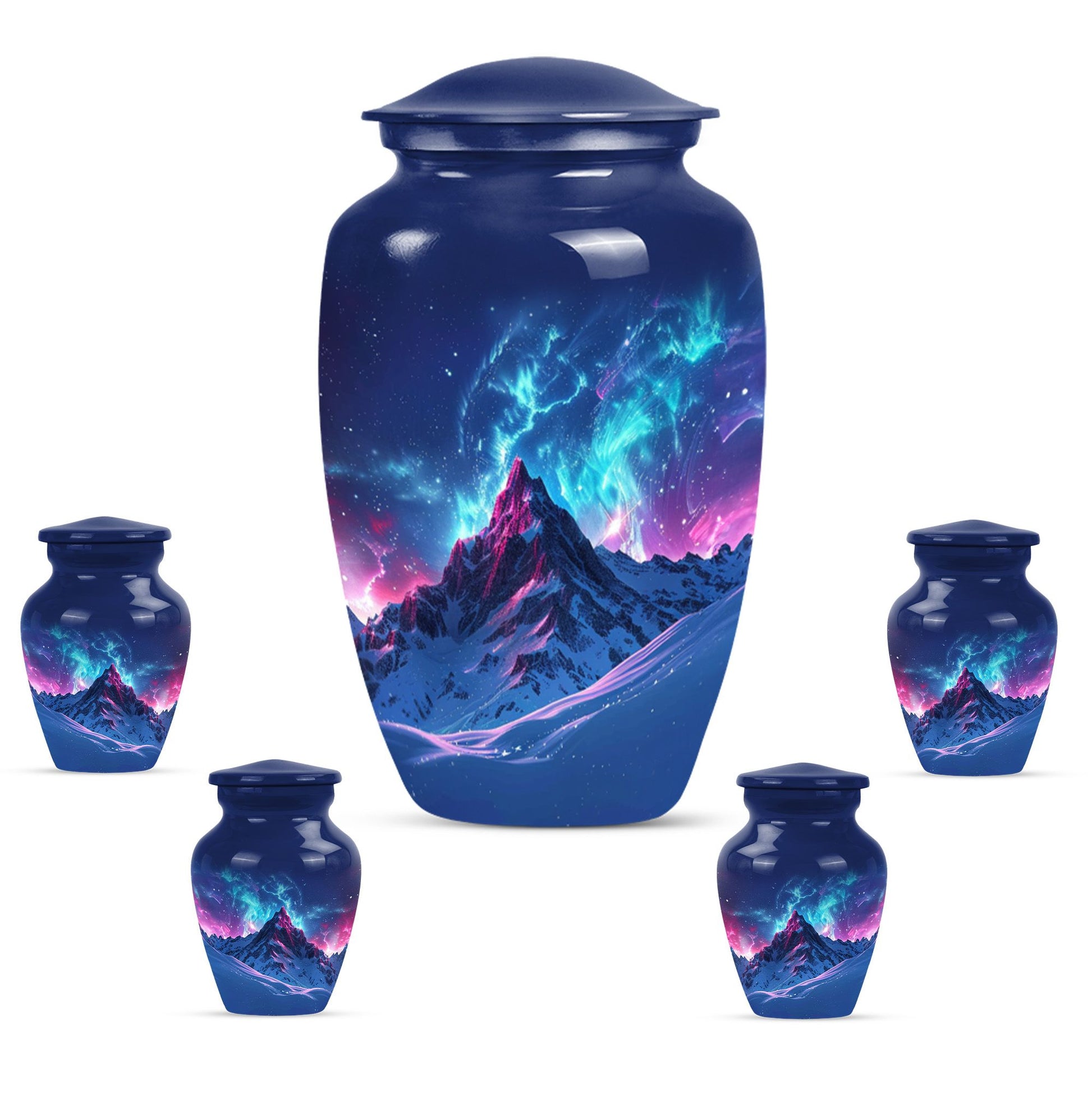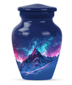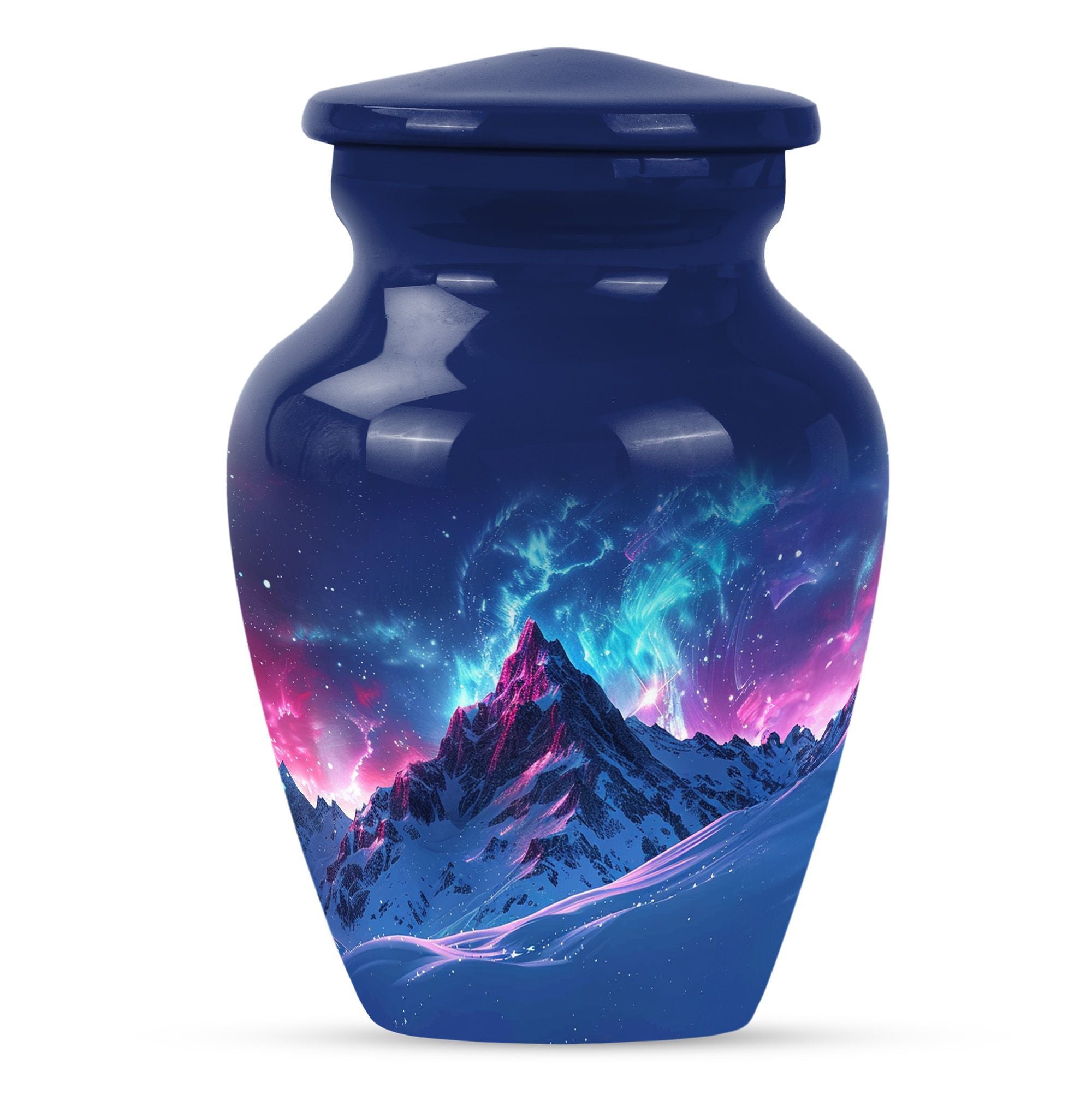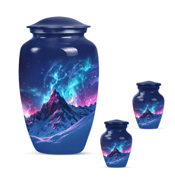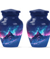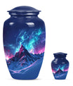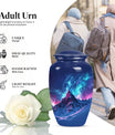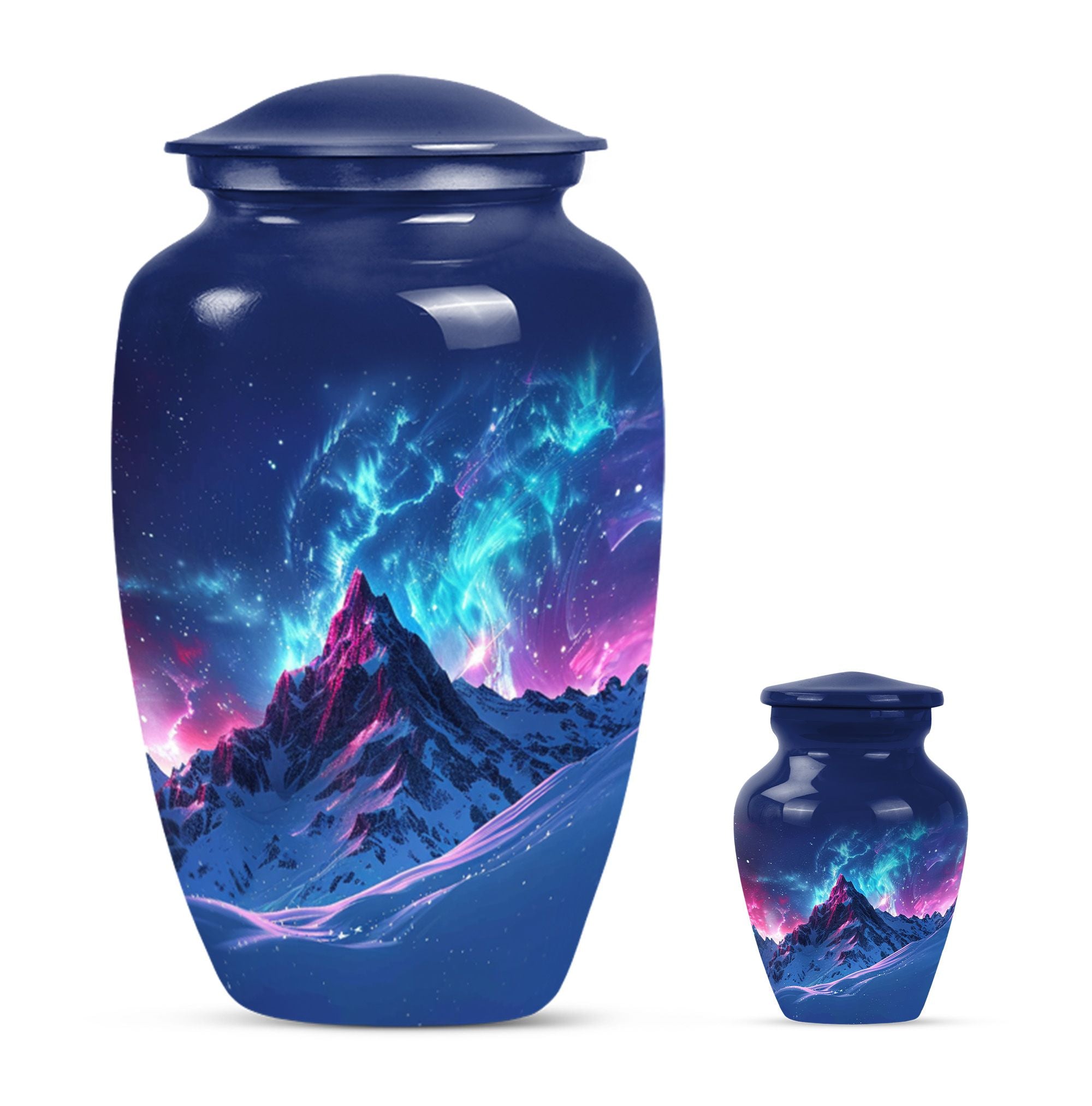 Experience the entrancing Northern Lights through our regally designed large urns, precision crafted for individuals seeking ceremoniously elegant cremation urns for adult males. This classic urn, crowned with an enchanting butterfly theme, merges both strength and gentleness in its design statement. Standing 10 inches in height, this urn can comfortably hold 200 cubic inches, ideal for cremation ashes of both men and women. Each urn is weighted at 3.3 pounds and designed with the utmost precision from high-grade aluminium. Our unique offering comes with a velvet pouch for containment of ashes, ensuring dignified storage. Plus, you can add a personal touch by customizing your choice with engraved names, making this piece more than just a memorial urn, but a cherished keepsake. Whether you're looking for funeral metal urns or burial urns to be placed in the ground, this beautiful piece in our collection fits the purpose.