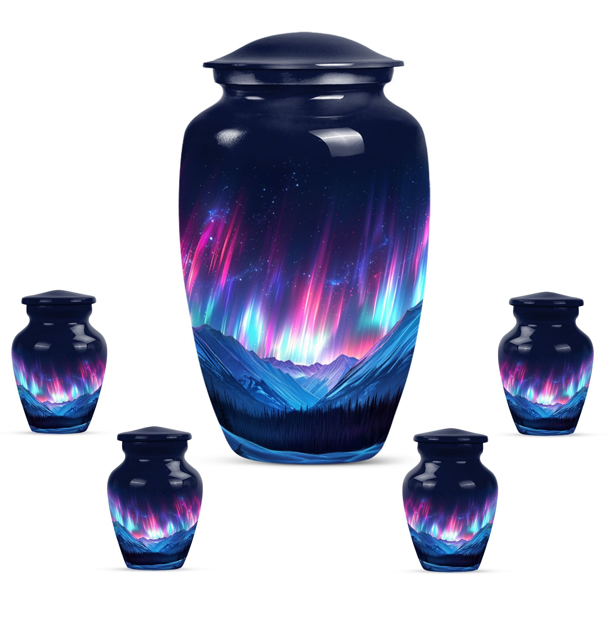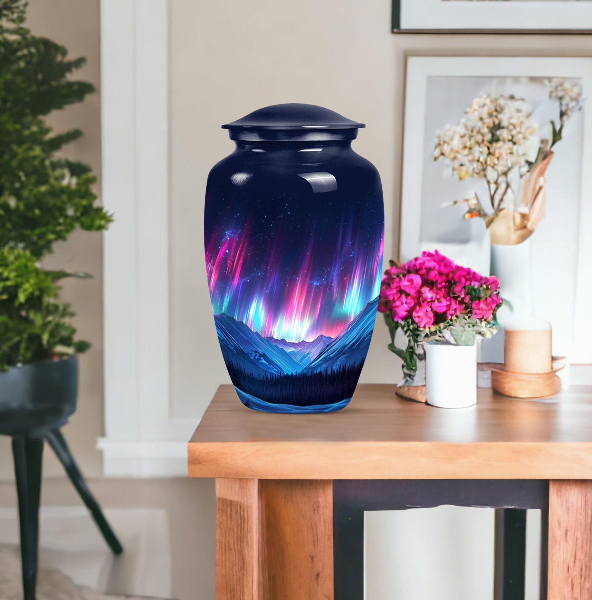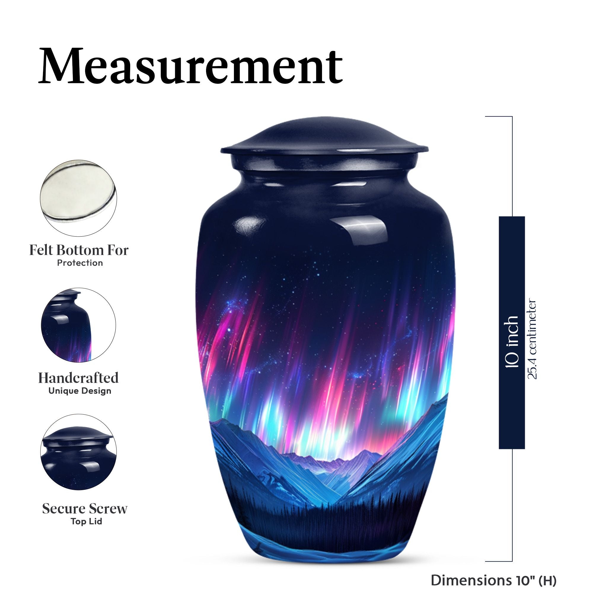 Discover the peace in eternal rest with our Northern Lights butterfly-themed cremation urn. This classic, large urn stands at 10 inches in height, an embodiment of reverence and respect that perfectly matches the solemn occasion. Carefully constructed from tough and sturdy aluminium, this reliable funeral urn for men's ashes weighs just 3.3 pounds. Accommodating up to 200 cubic inches, this piece is ideal for preserving the beloved memory of the departed. Dipped in a rich, lush theme of butterflies, the urn radiates a unique tranquility that comforts the grieving heart. The set also includes a velvet pouch for dignified containment of the ashes. What makes this urn truly special is the option to personalize it with engraved names, adding a distinctive touch. This decorative human ashes urn, steeped in sophistication, brings a noble closure to their earthy journey and bestows unbroken serenity as a timeless remembrance.