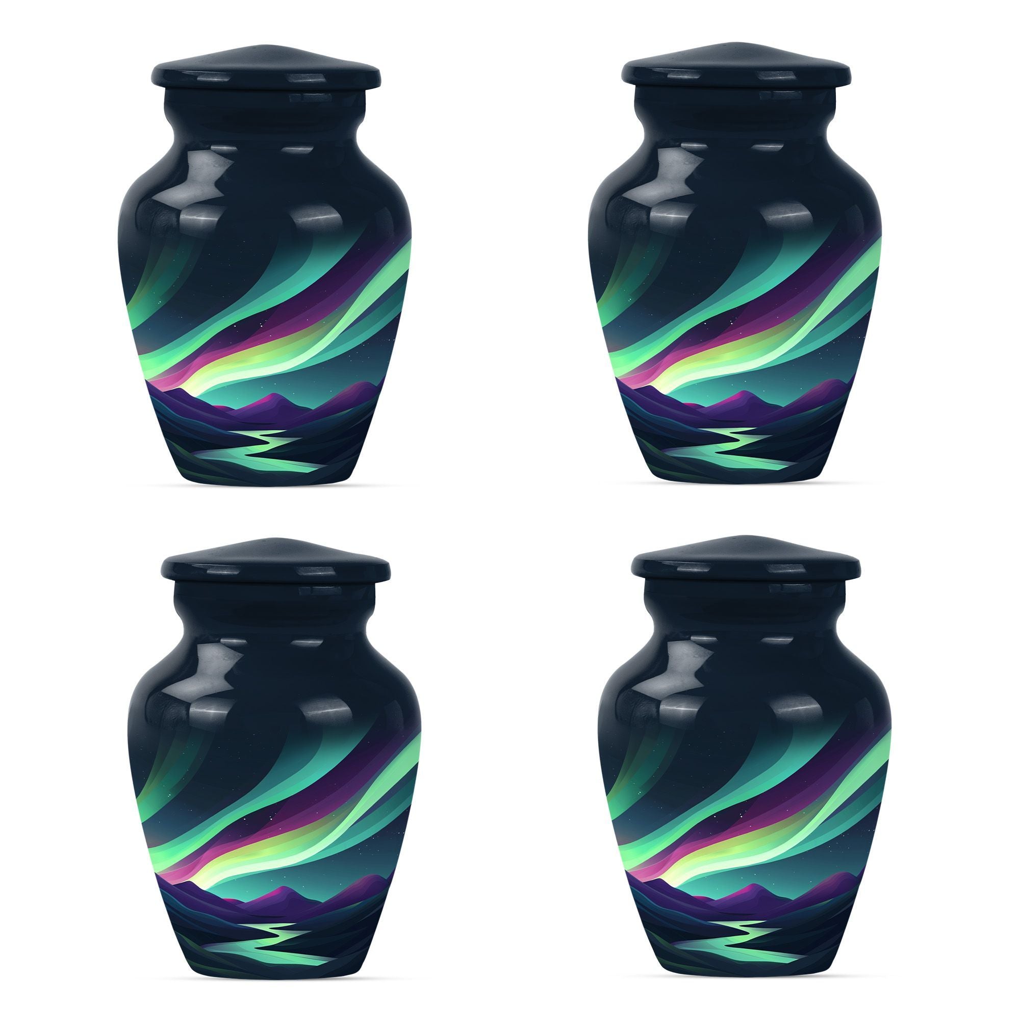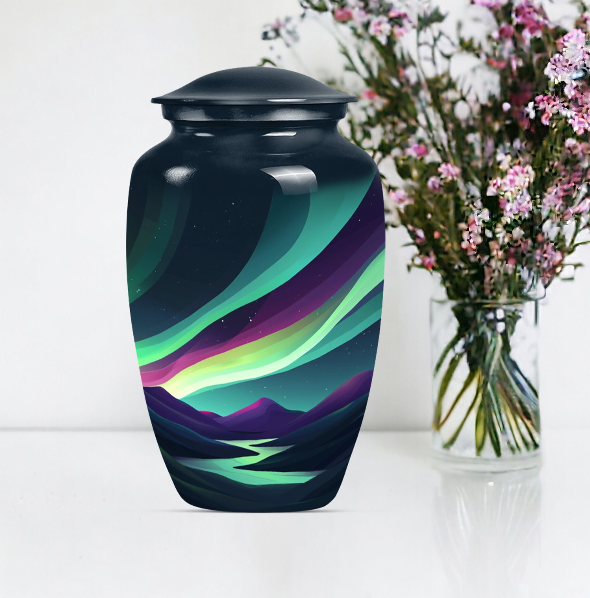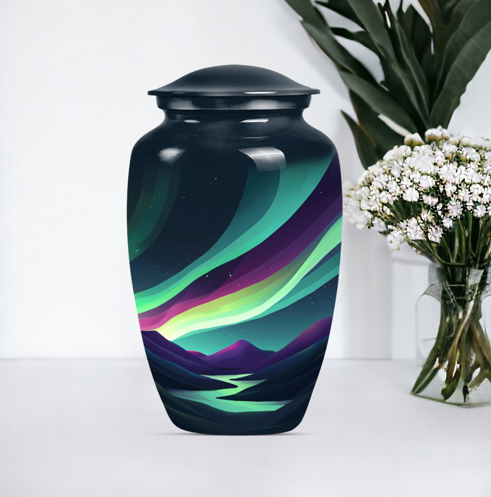 Experience a luminous tribute to your departed loved ones with our Large Northern Lights Urn, a specialty Memorial Ash Urn of compelling beauty and spirit. Tailored from durable Aluminium and coated in a captivating 'Purple Meadow' theme, this Memorial Urn stands at an unassuming 10 inches, showcasing its humble respect for the monumental task it accommodates. The classic Urn's size can graciously hold up to 200 cubic inches of ashes, allowing for a comprehensive tribute, weighty with memories. As an addition, it comes with an elegant velvet pouch for the containment and protection of the precious remains. Displaying its value beyond beauty, this Large Urn supports customization, allowing for the eternal engraving of names, allowing personal attachment to the stylish memorial. Always remember your departed with a Funeral urn that merges an immersive tribute with elegance, large enough for adult men ashes. Transport the sacred remains safe and stylish, reminiscent of the universal love echoed through the Aurora Borealis, our Northern Lights Urn.