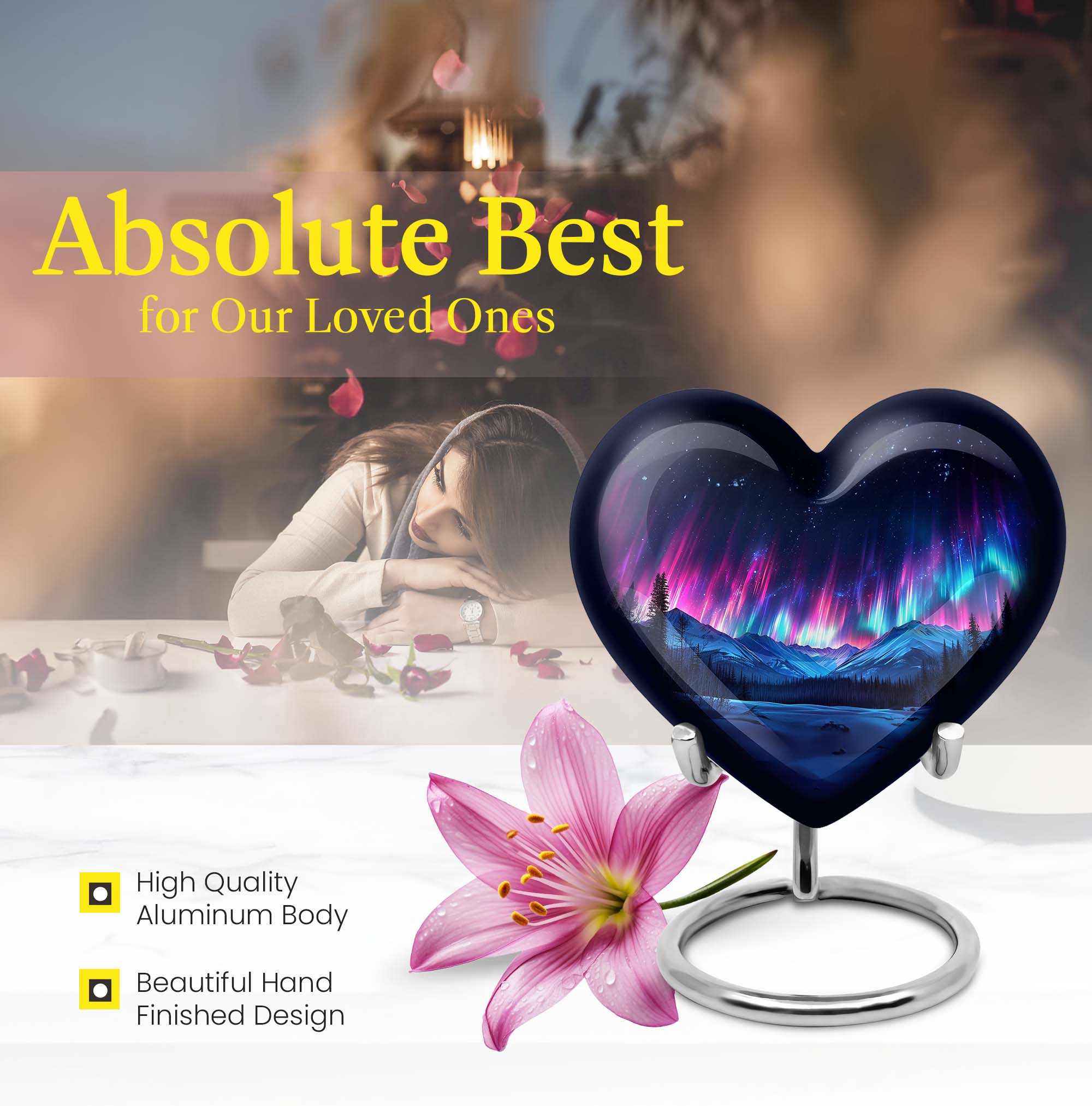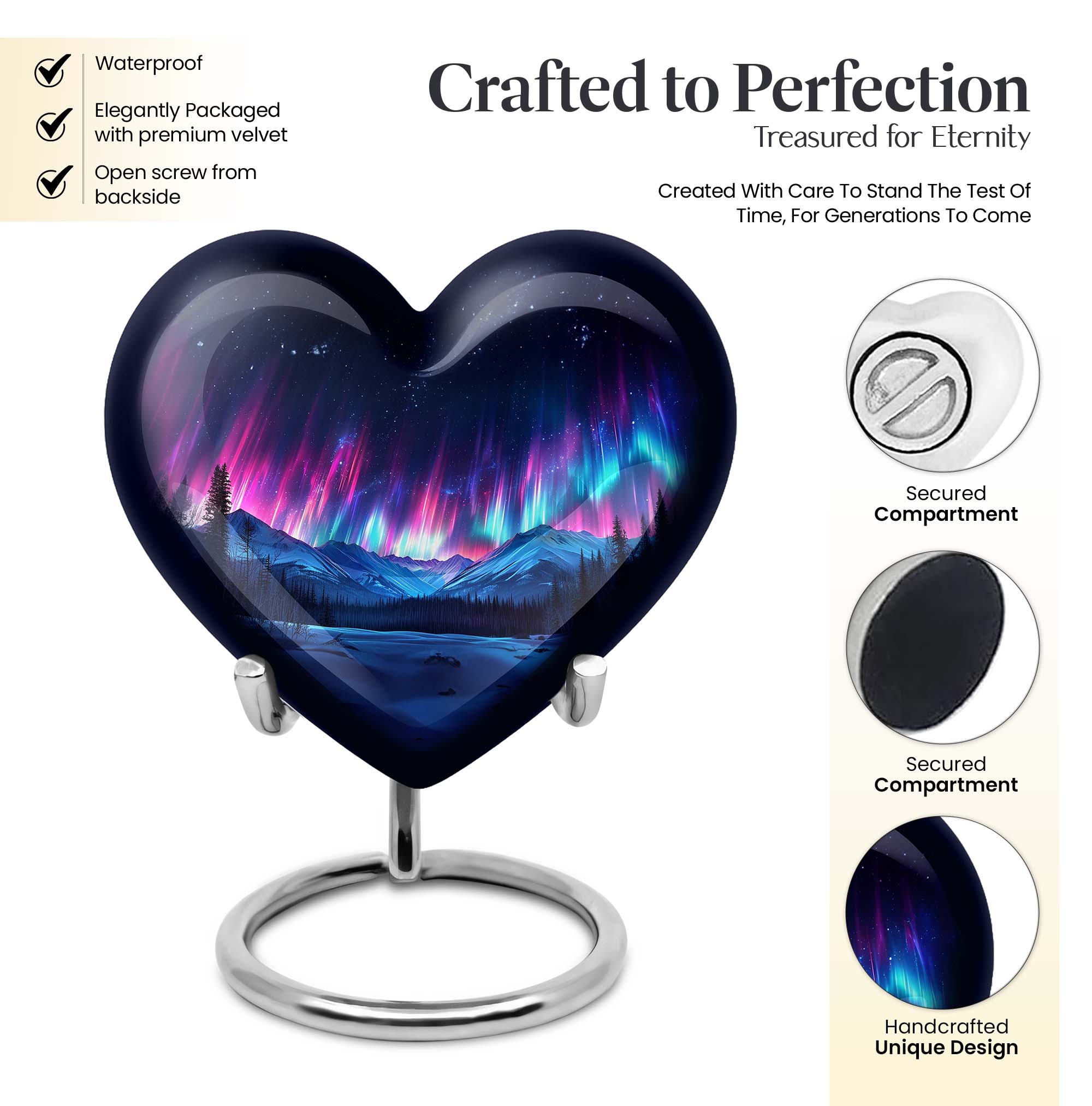 This Northern Lights funeral urn offers a tasteful, distinguished way to carry the treasured memories of loved ones. Specially designed for men ashes, this 10-inch cremation urn stands firm with a robust weight of 3.3 pounds. The heart-shaped urn, surrounded with an elegant butterfly theme, is fashioned from resilient aluminium, making it an enduring choice. It is one of our large urns with a capacity of 200 cubic inches, ample space to safeguard the ashes. Adding to its uniqueness, it offers personalization facilities where you could engrave the names and keep their memories close to your heart. The package comes with a velvet pouch which ensures the containment of ashes in a refined manner. Perfect for those seeking adult urns for ashes, it fuses a comforting message of love with the solemnity of memorial ceremony supplies. Decorative human ashes urns like this offer a peace-filled closure, letting the Northern Lights metaphorically beacon the journey ahead for the departed.