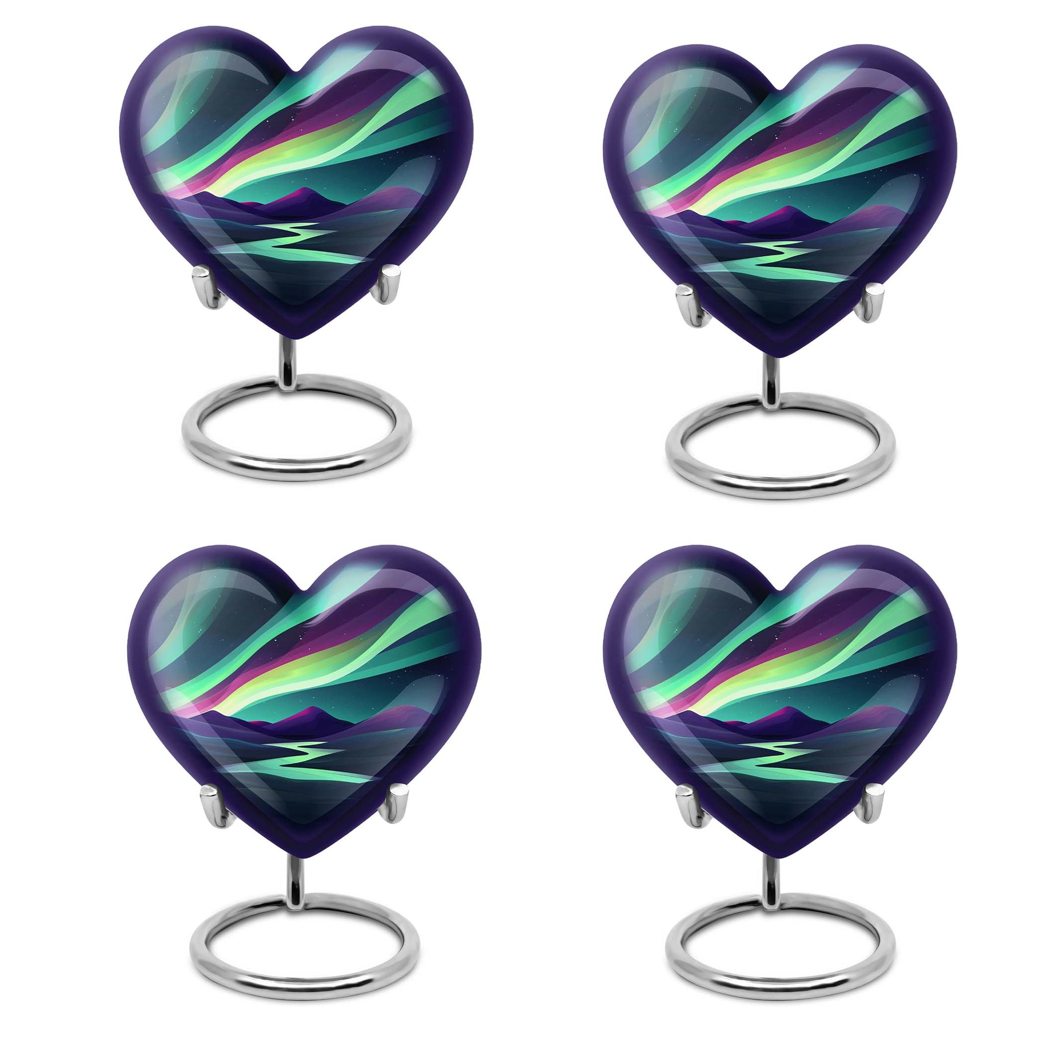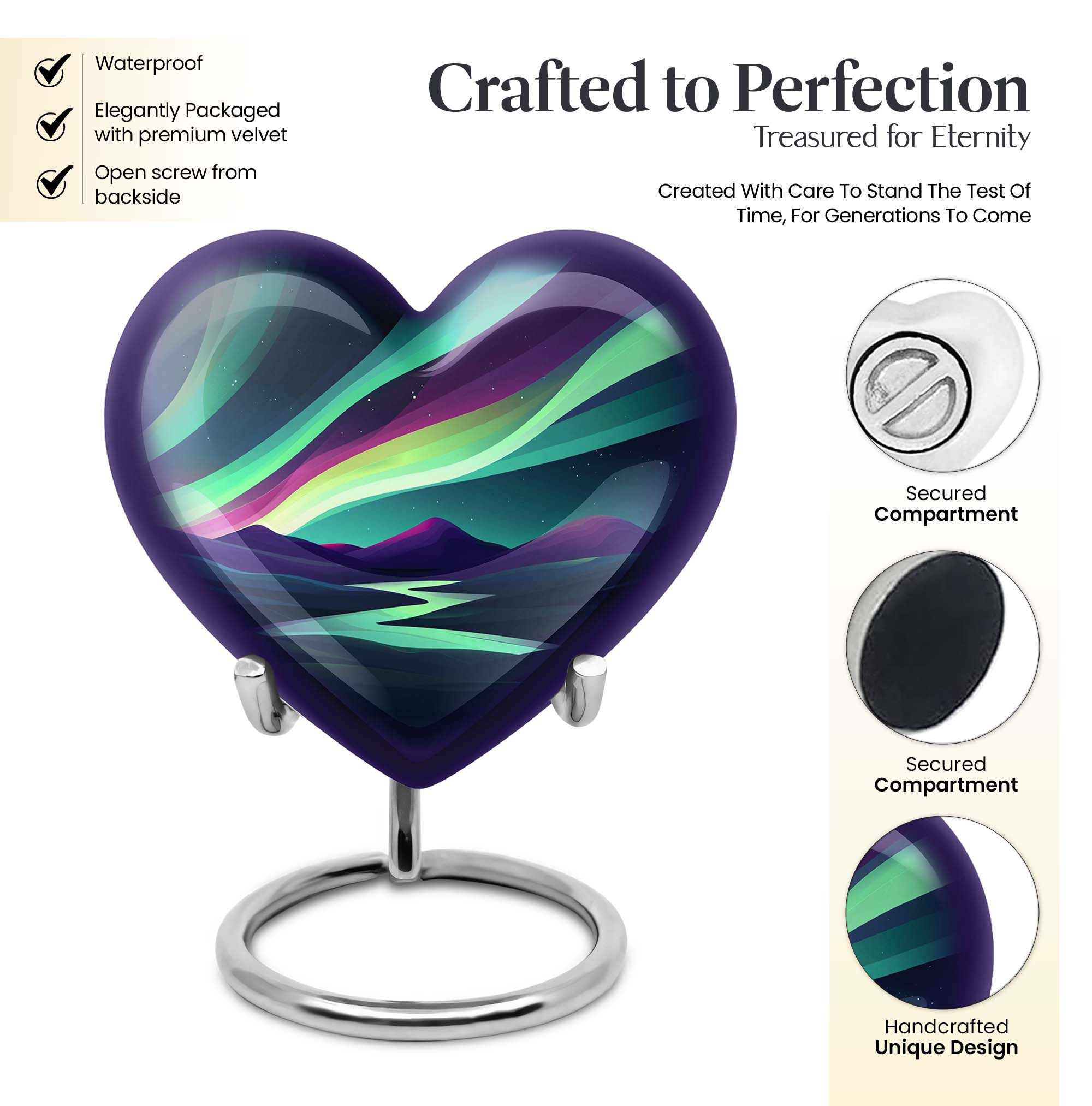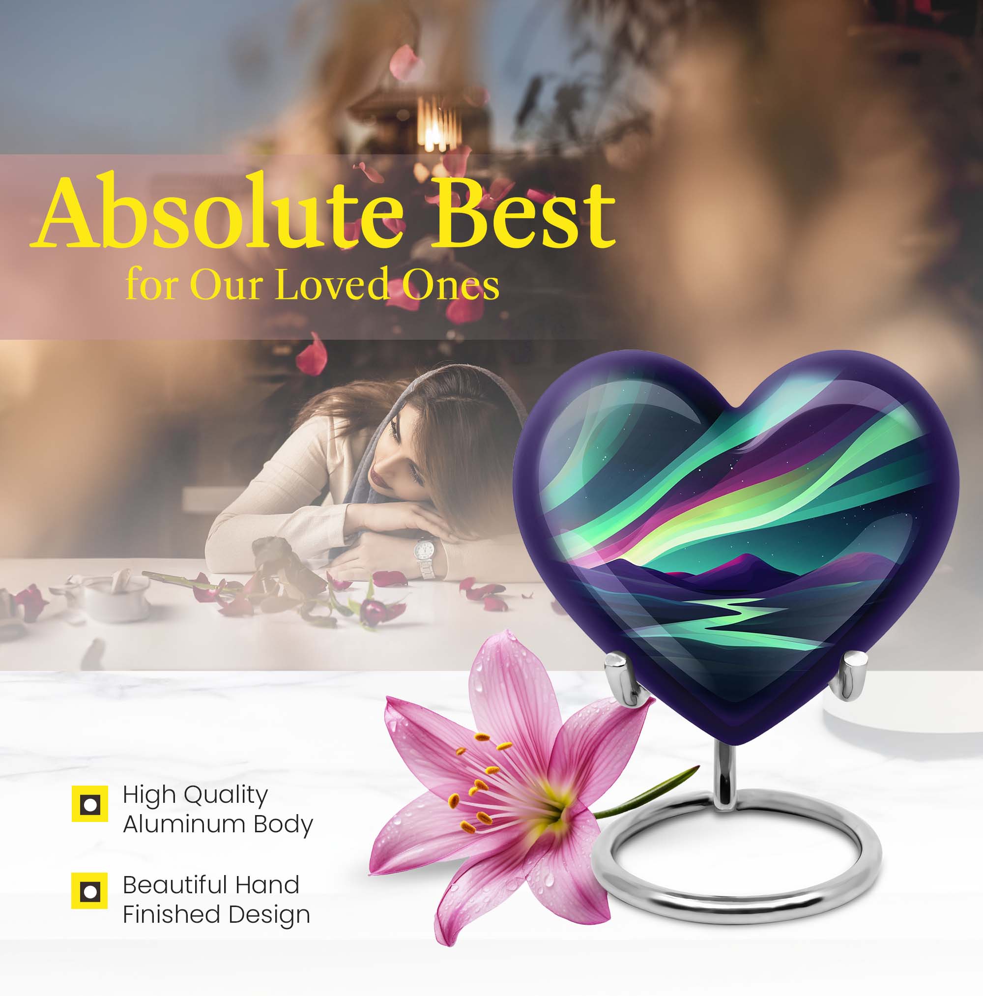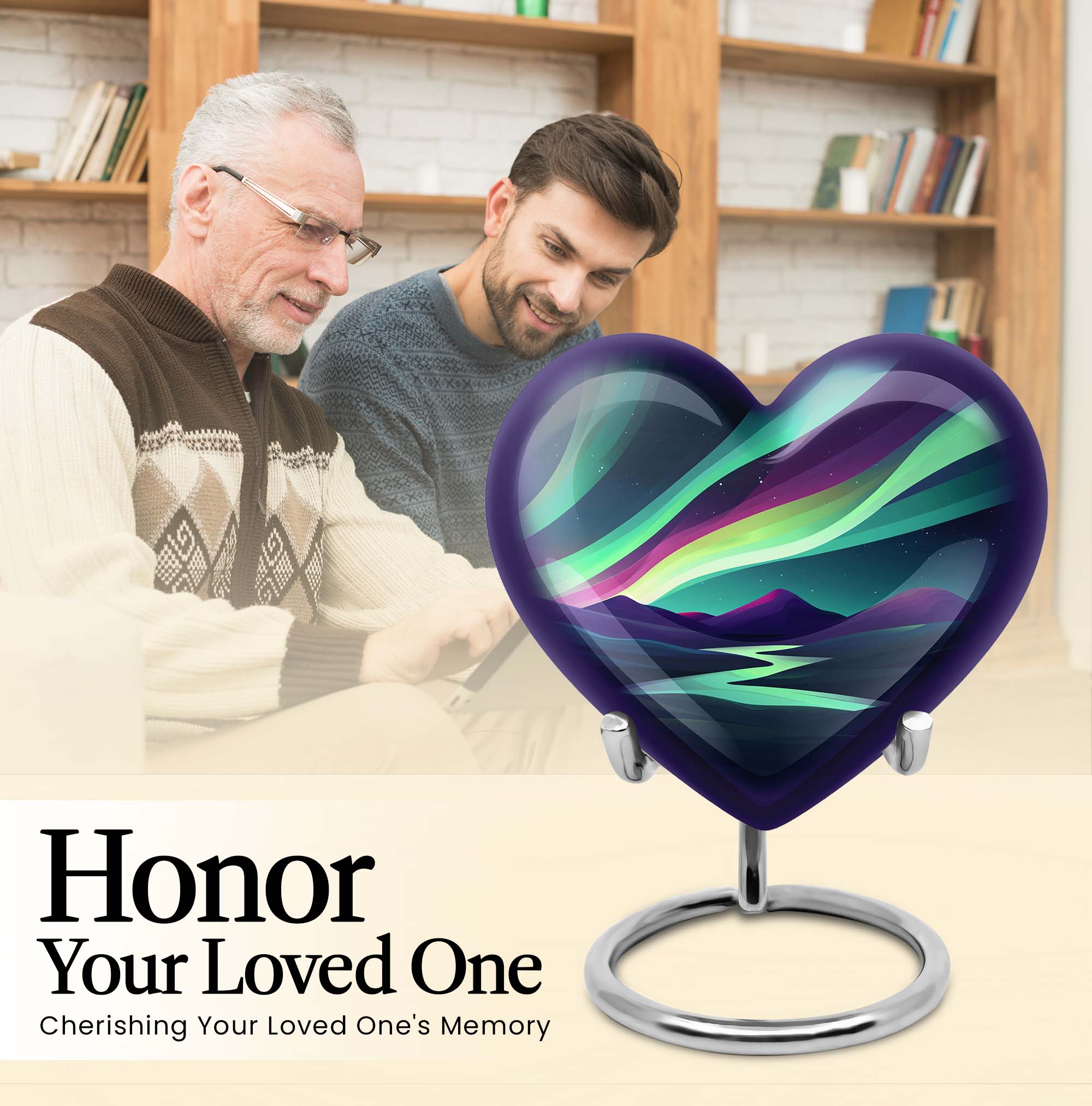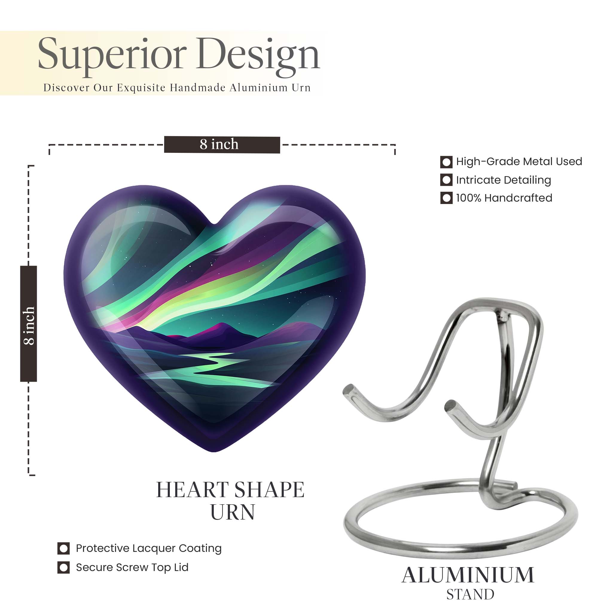 Discover a soulful reflection of your loved one's life with our Northern Lights Urn, a perfect resting place for adult ashes. Meticulously crafted from durable aluminium, the theme of this 10-inch heart urn is the picturesque 'Purple Meadow', evoking a beautiful symphony of tranquility and reverence. Weighing only 3.3 pounds, it offers an impressive capacity of 200 cubic inches, able to hold the remains of a dear one respectfully. Adding a touch of personal love, the urn can be further customized by engraving names onto it. Packaged scrupulously with a velvet pouch, this substantial memorial urn safeguards the precious remnants of your beloved. This urn stands out among the memorial ash urns with its elegance and style, making it more than just an urn - a true testament to a life well-lived. Offer your tribute in the form of our Northern Lights Urn, a memorial symbol blurring the boundaries between simplicity and grandeur.
