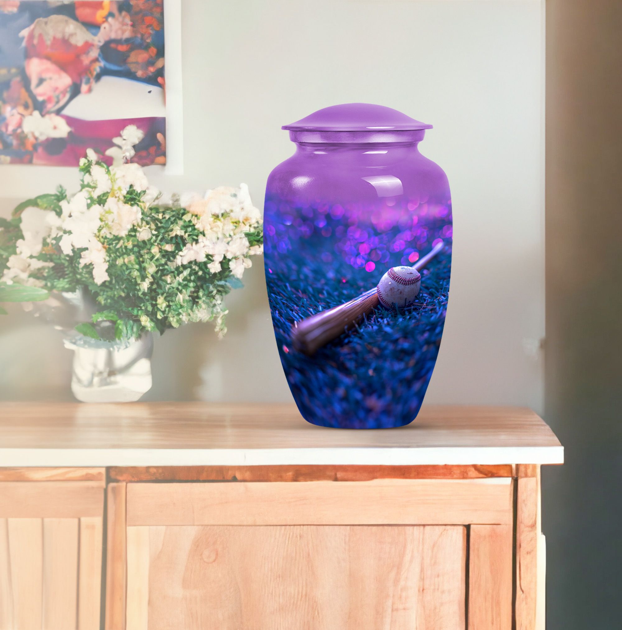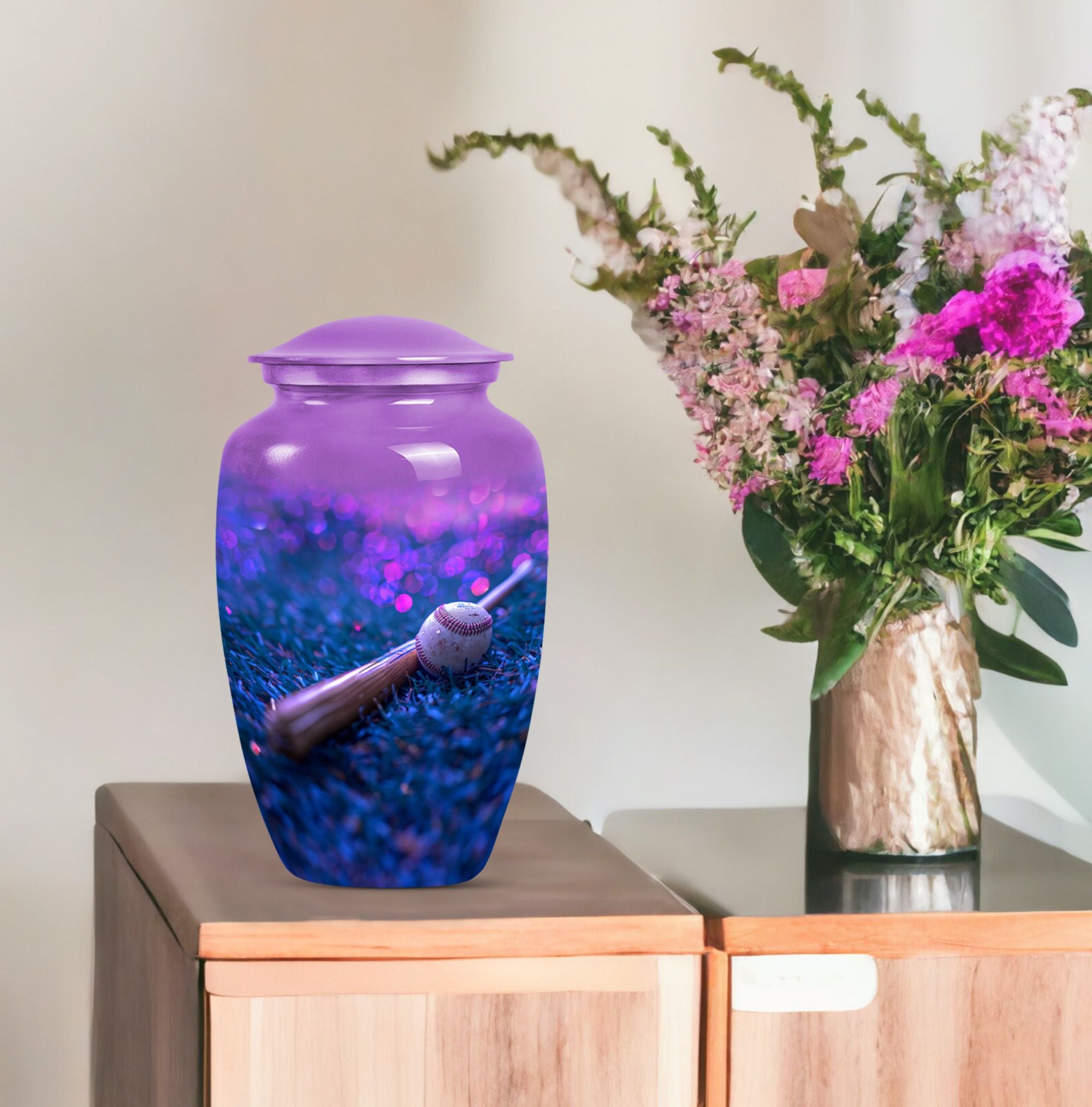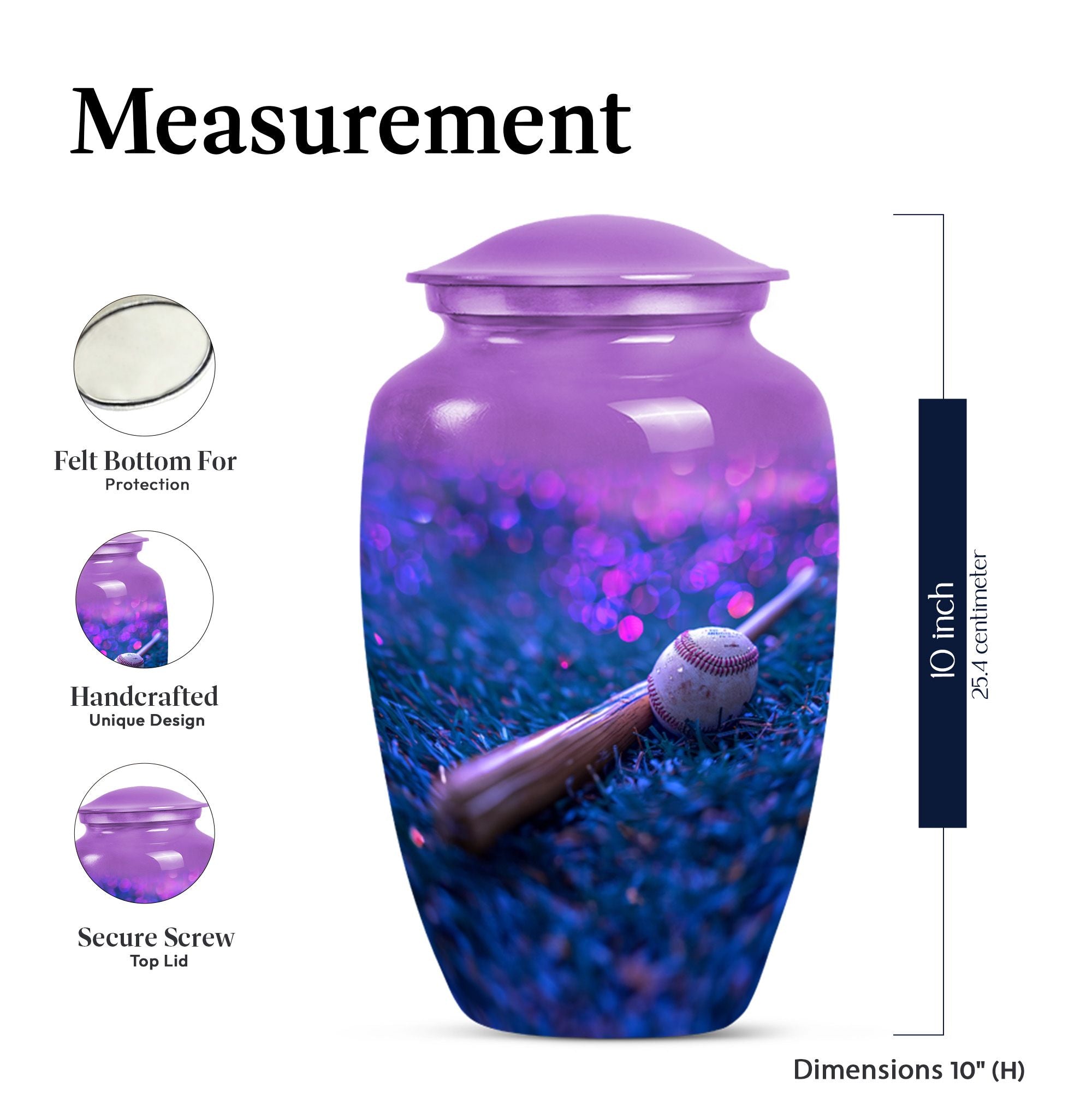 Ensure a dignified memorial service with our beautifully crafted, 10-inch Baseball urn. Made to honor your beloved with sophistication and elegance, our Large urn styled in a classic design displays a notable finesse. This memorial urn for burial in ground is delicately crafted from durable Aluminium and features a striking butterfly theme that symbolizes endurance, change, and resurrection. With a capacity of 200 cubic inches, this cremation urn is designed to securely hold the ashes and comes with a luxurious velvet pouch for containment. Weighing a sturdy 3.3 pounds and standing proudly at 10 inches in height, the urn can be personalized with engraved names, adding a genuinely unique touch to this already exceptional piece. Uncommonly grand, this Baseball urn also caters to seniors and adults as a poignant reminder of a well-lived life. Whether it be a memorial funeral urn or large urn for adults, our Baseball urn satisfies all with an unmatched intricacy.