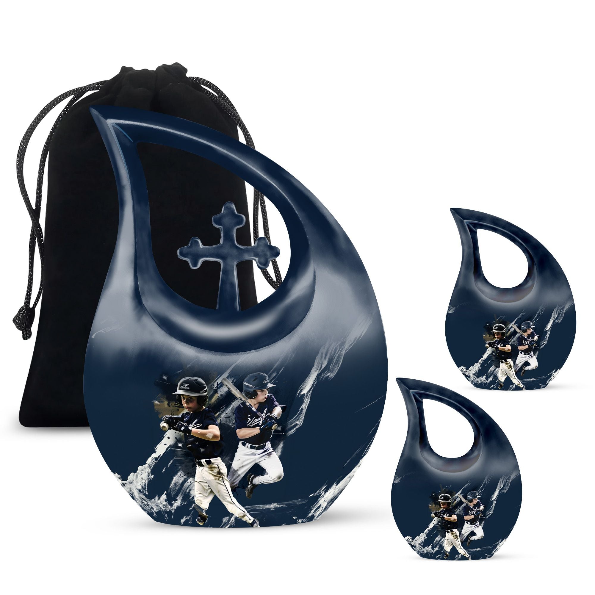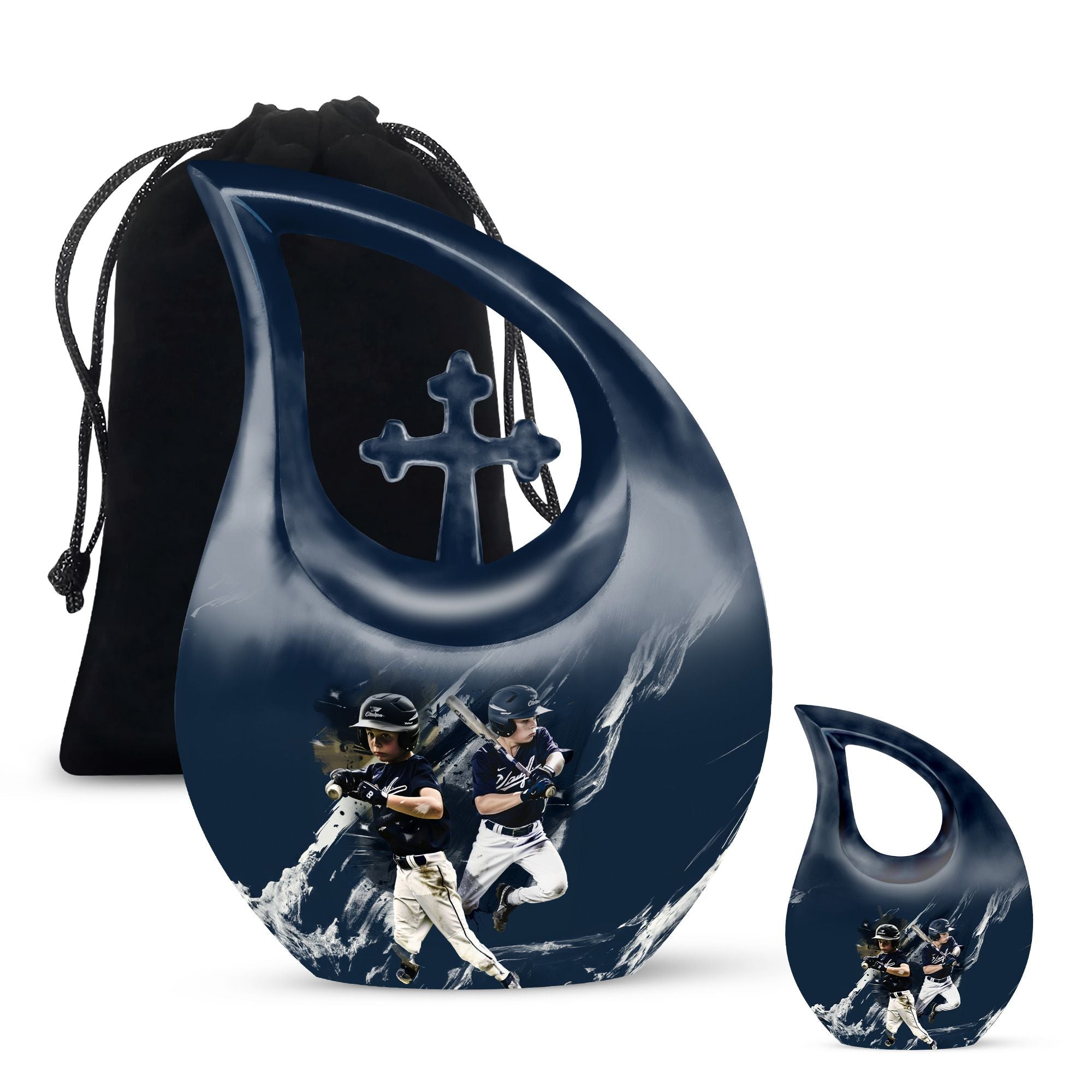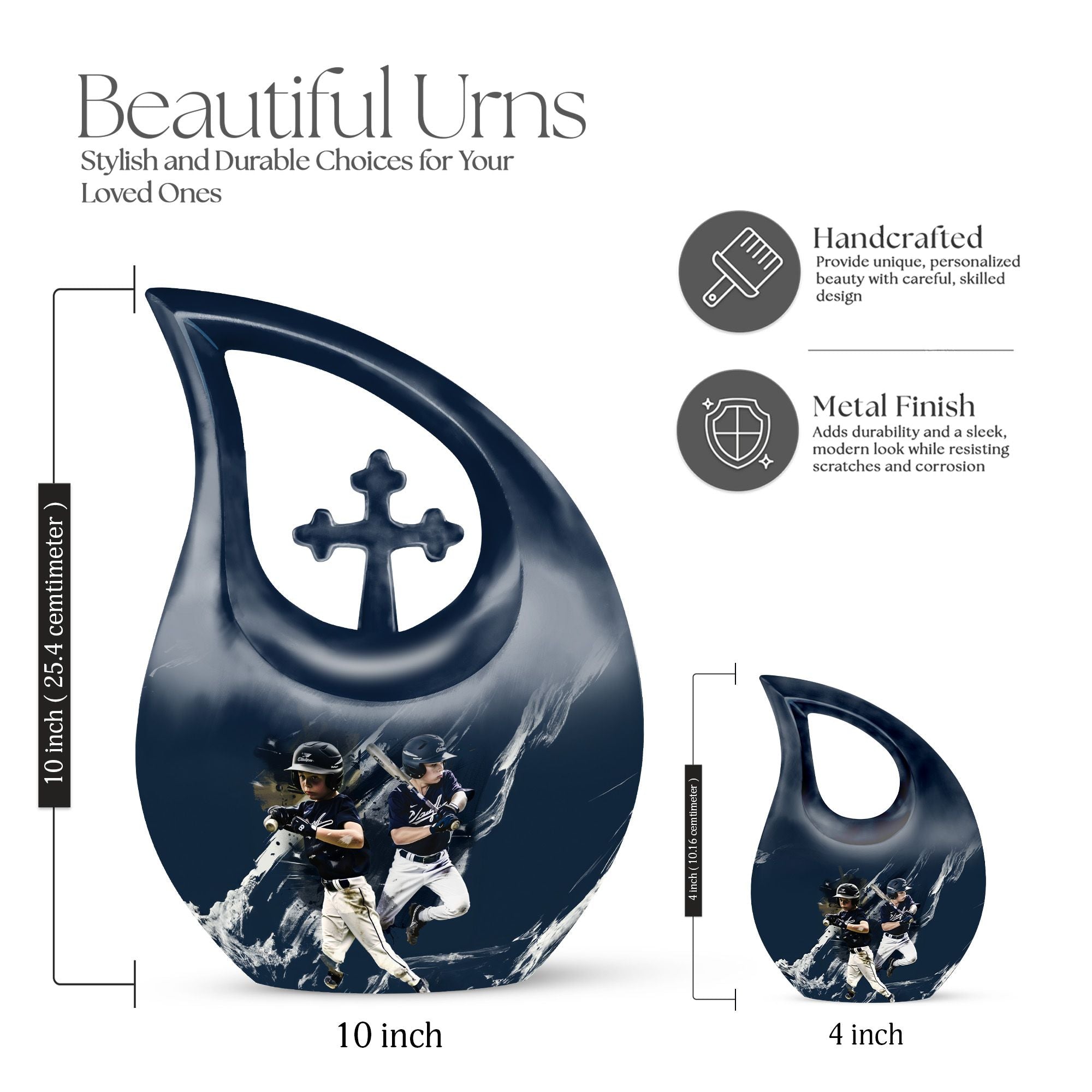 Preserve cherished memories in a dignified way with our Baseball Urn. Cast from solid aluminum and measuring 10 inches in height, this memorial urn has a weight of 3.3 pounds, indicating robust construction that stands the test of time. Majestic and reverent, the Cross Drop theme enhances this large-sized urn, signifying love, faith, and a connection to the divine. With a capacity of 200 cubic inches, it comfortably holds ashes, providing a fitting resting place. The product arrives with a velvet pouch, ensuring secluded containment of the ashes while adding an extra layer of protection. Infuse a personal touch by letting us engrave names on it, a service we're always glad to provide. Unusually crafted and priced reasonably, the Baseball Urn transcends the constraints of affordability, giving you and your loved ones a parting gift that resonates with care and respect. Ideal for adults, it also finds a purpose as a small urn, marking it a versatile choice in memorial ceremony supplies. In the search for 'Affordable Urn', 'Adult urns', 'Urns for Ashes', or 'Baseball Urn', it invariably stands out, making it a suitable choice in its category.
