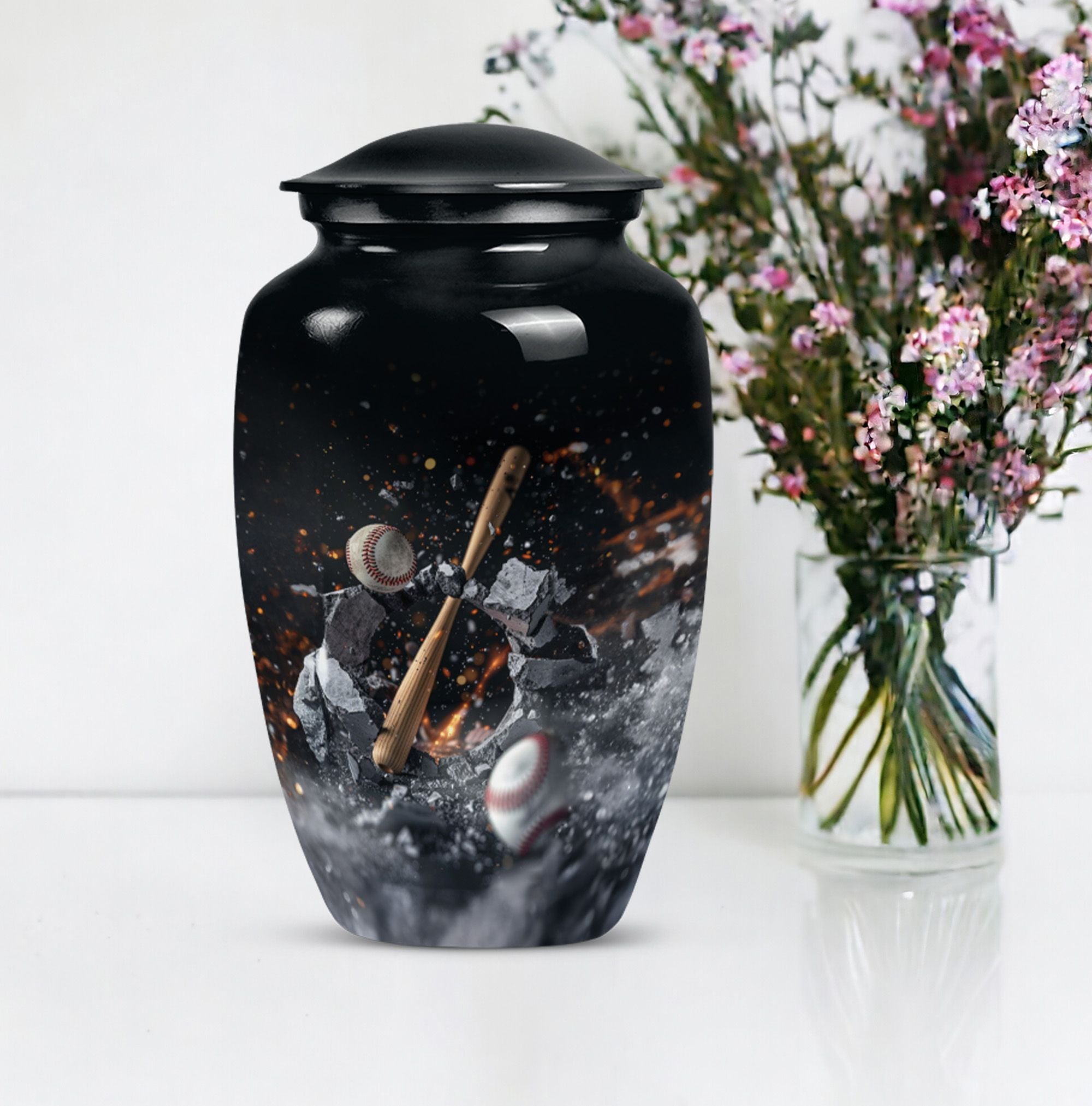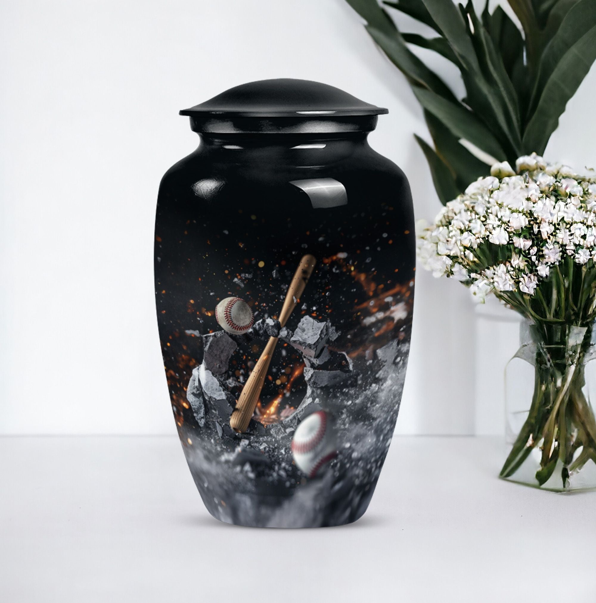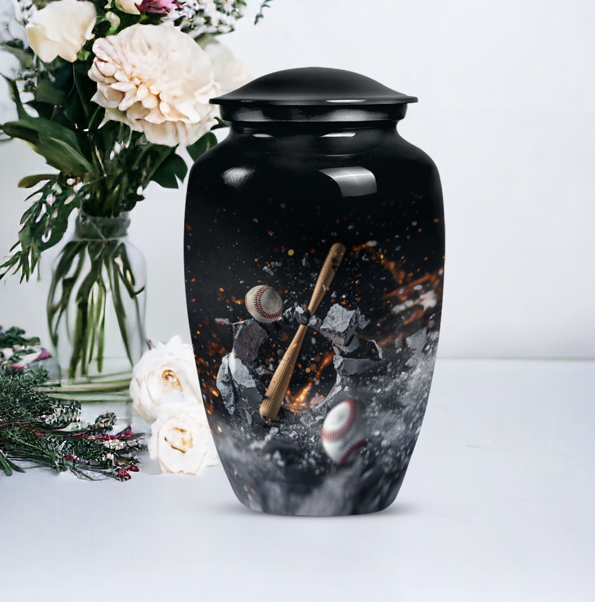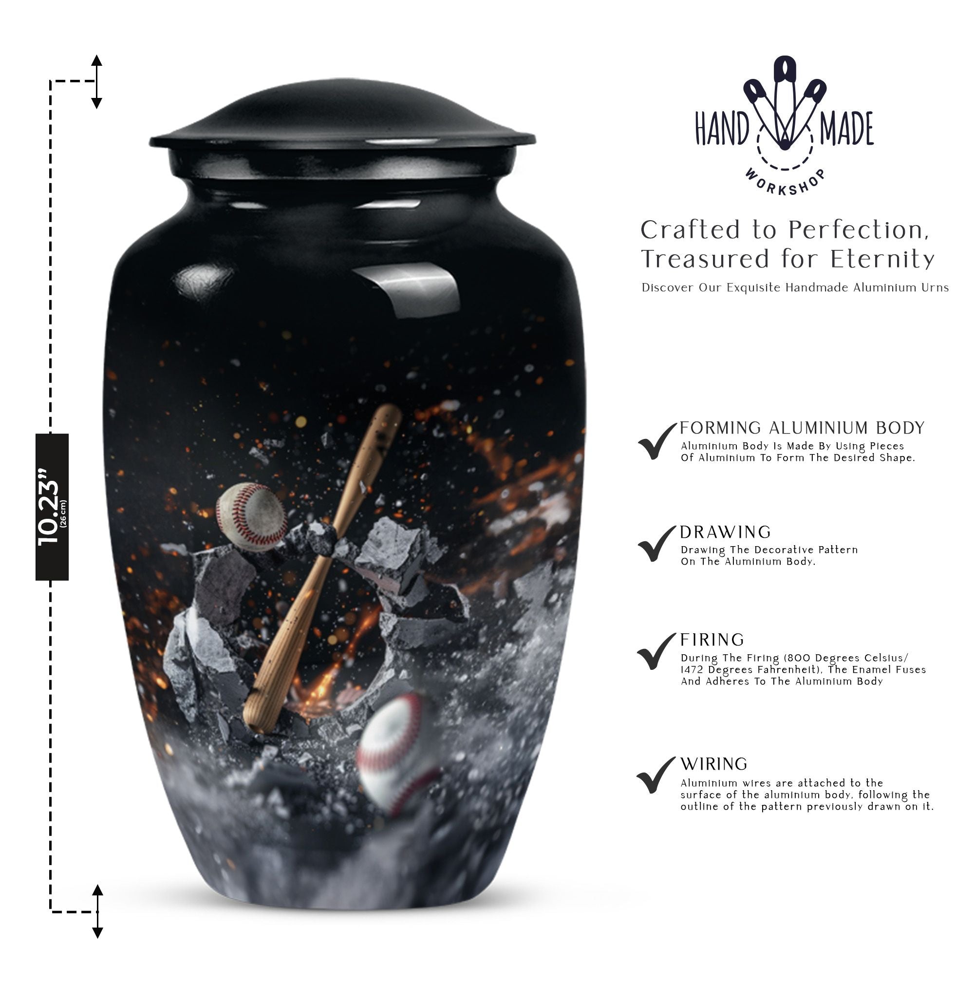 Bring an elegant and timeless tribute to your loved one with our 10-inch aluminium baseball urn. Handcrafted for artistic souls, this memorial large urn for ashes is not just a mere container, but a symbol of everlasting love and memory. With a weight of only 3.3 pounds, it is light yet sturdy reflecting our commitment to quality. The urn has a capacity of 200 cubic inches, making it a perfect funeral urn for women's ashes and sized large urns for ashes. Its abstract theme brings a certain serenity and peacefulness, offering comfort in times of grief. Personalize your cremation urn with engraved names, adding a truly personal touch to this already unique piece. The package also includes a velvet pouch for containment of ashes. Celebrate your loved one's life and hold onto those precious memories with this exquisite urn, designed to serve as a solemn reminder of the eternal bond of love.