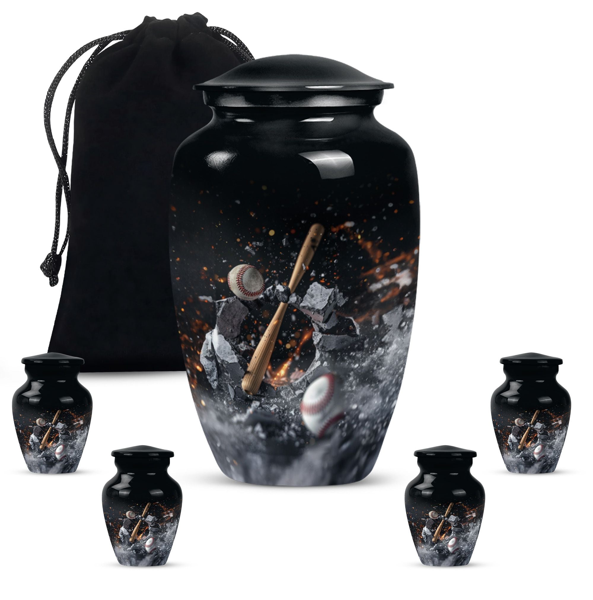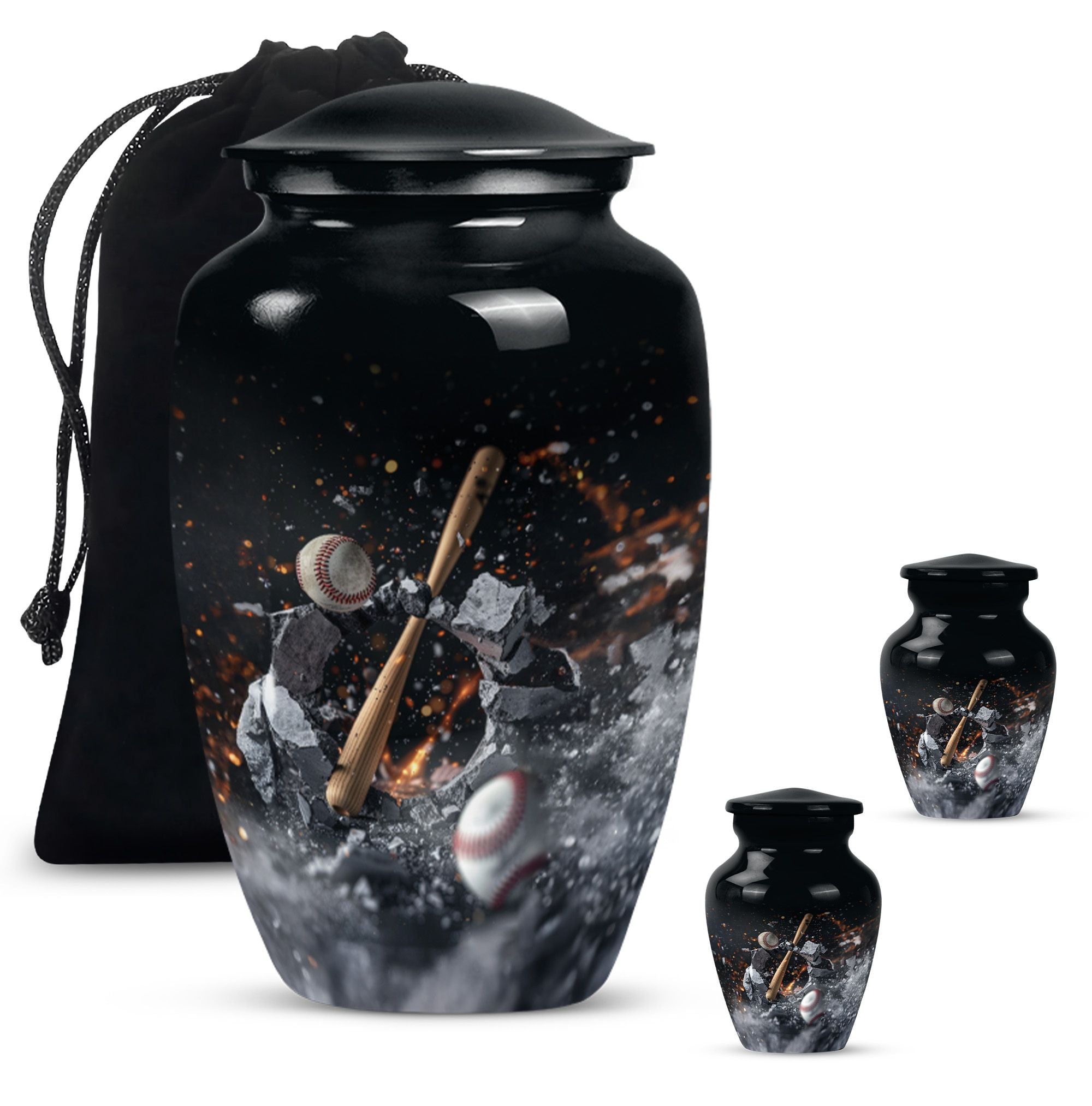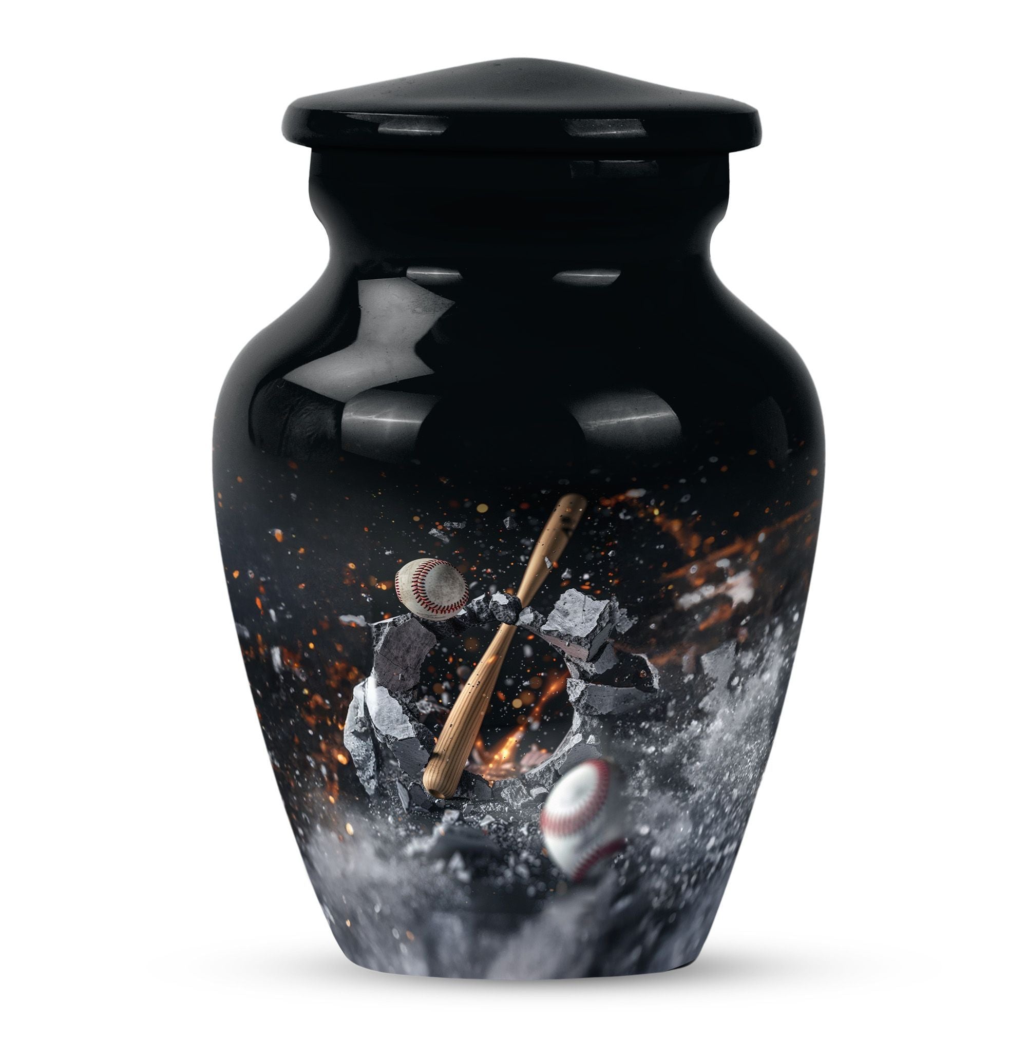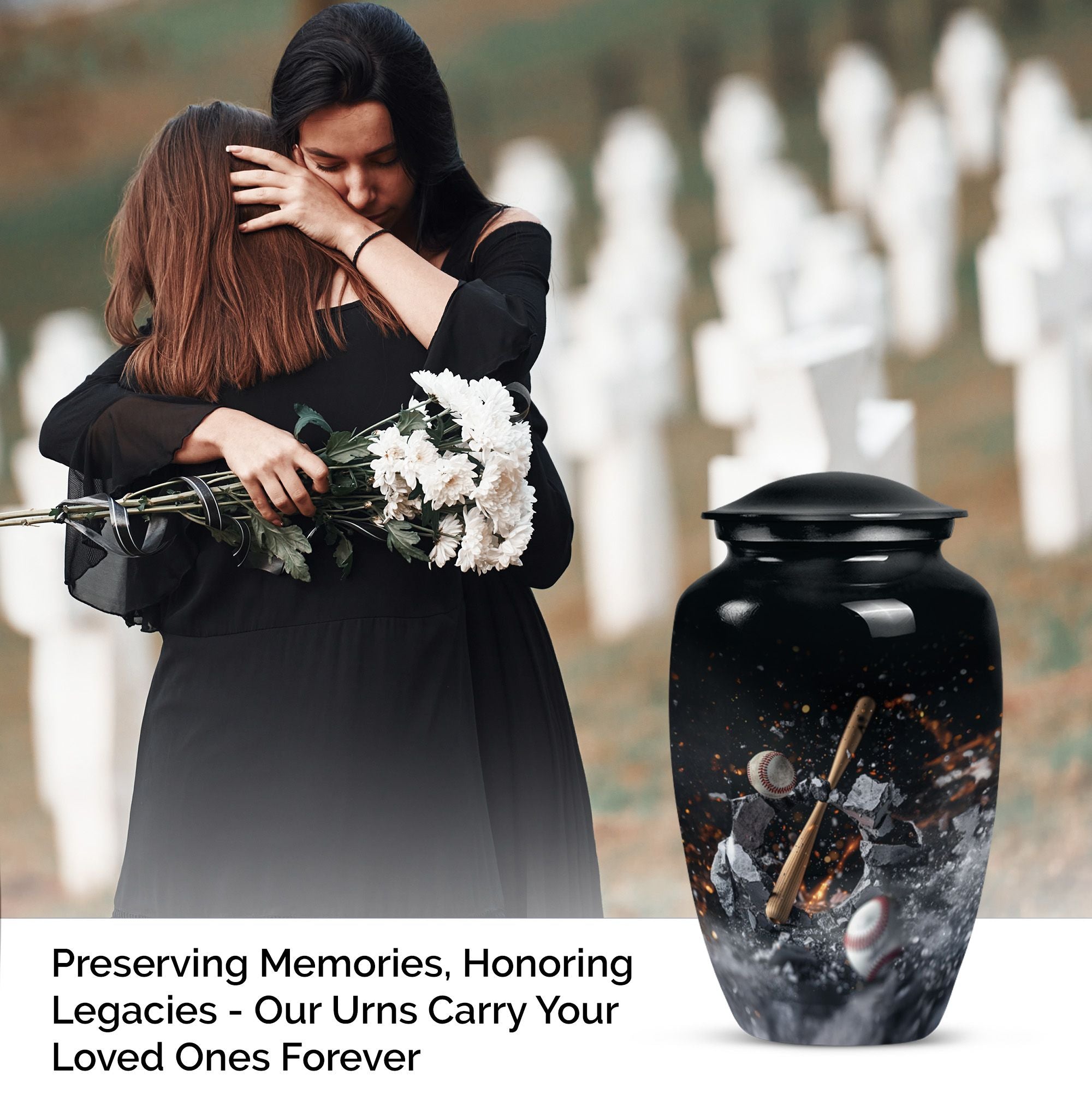 Bring an elegant and timeless tribute to your loved one with our 10-inch aluminium baseball urn. Handcrafted for artistic souls, this memorial large urn for ashes is not just a mere container, but a symbol of everlasting love and memory. With a weight of only 3.3 pounds, it is light yet sturdy reflecting our commitment to quality. The urn has a capacity of 200 cubic inches, making it a perfect funeral urn for women's ashes and sized large urns for ashes. Its abstract theme brings a certain serenity and peacefulness, offering comfort in times of grief. Personalize your cremation urn with engraved names, adding a truly personal touch to this already unique piece. The package also includes a velvet pouch for containment of ashes. Celebrate your loved one's life and hold onto those precious memories with this exquisite urn, designed to serve as a solemn reminder of the eternal bond of love.
