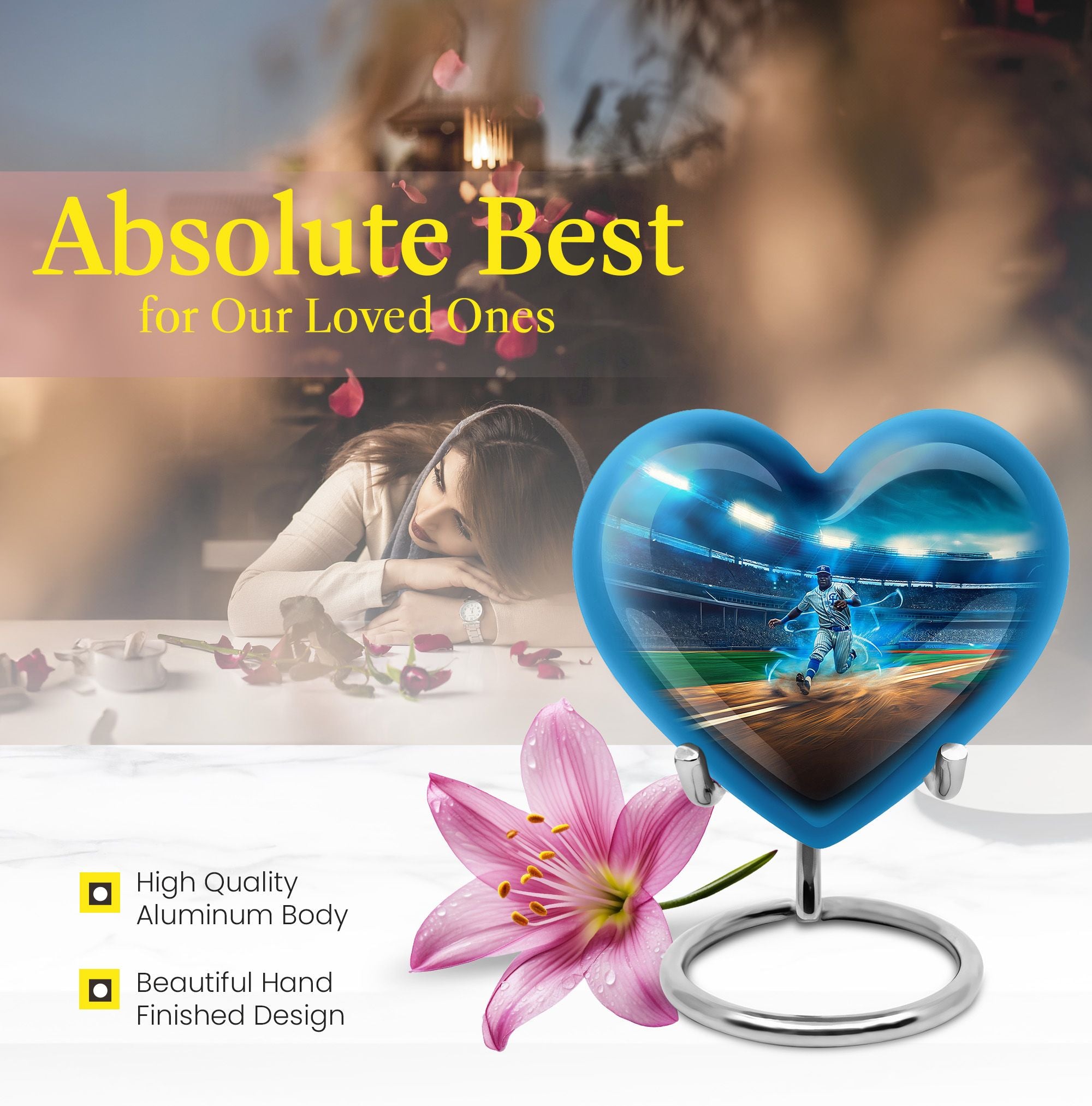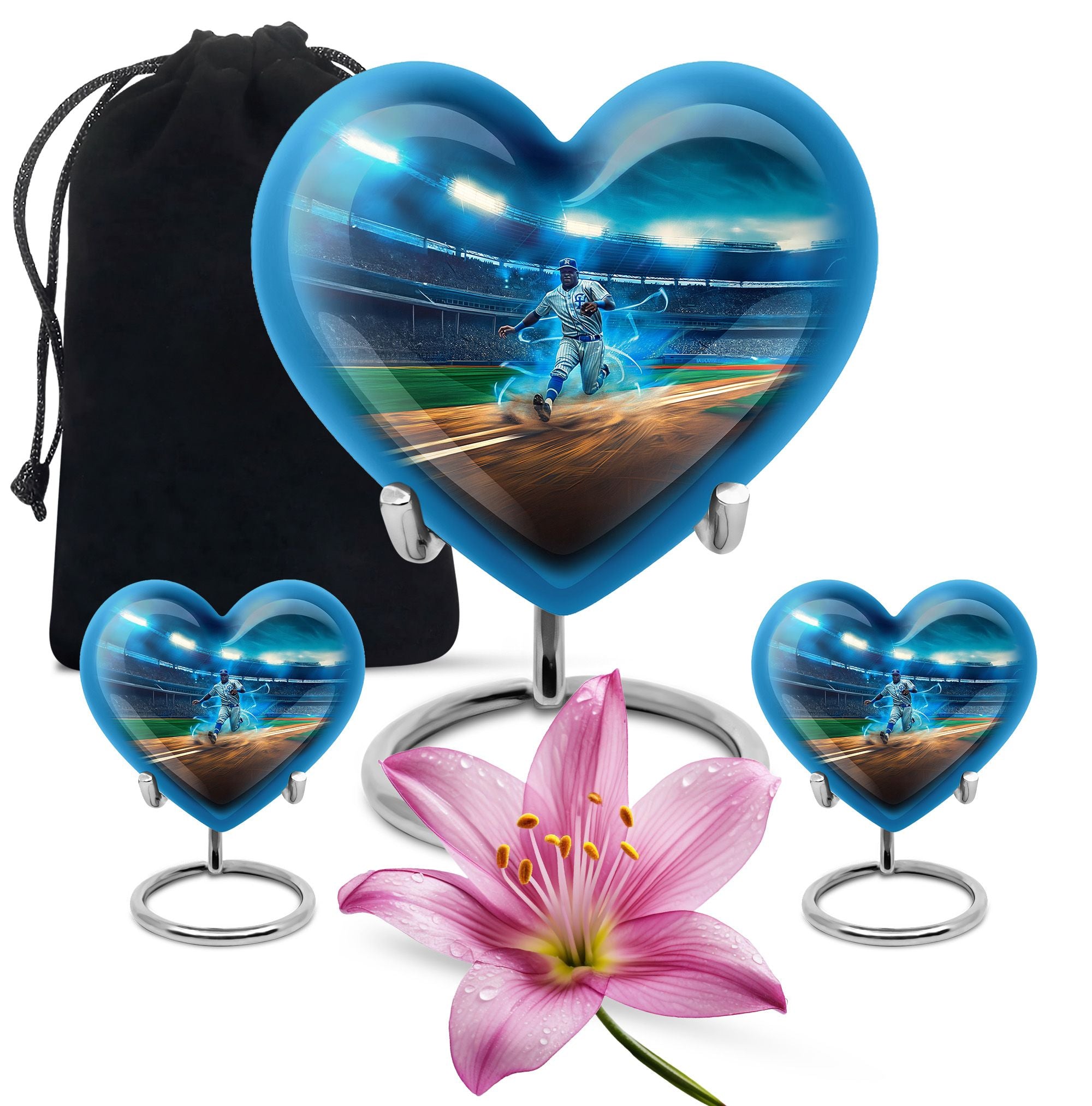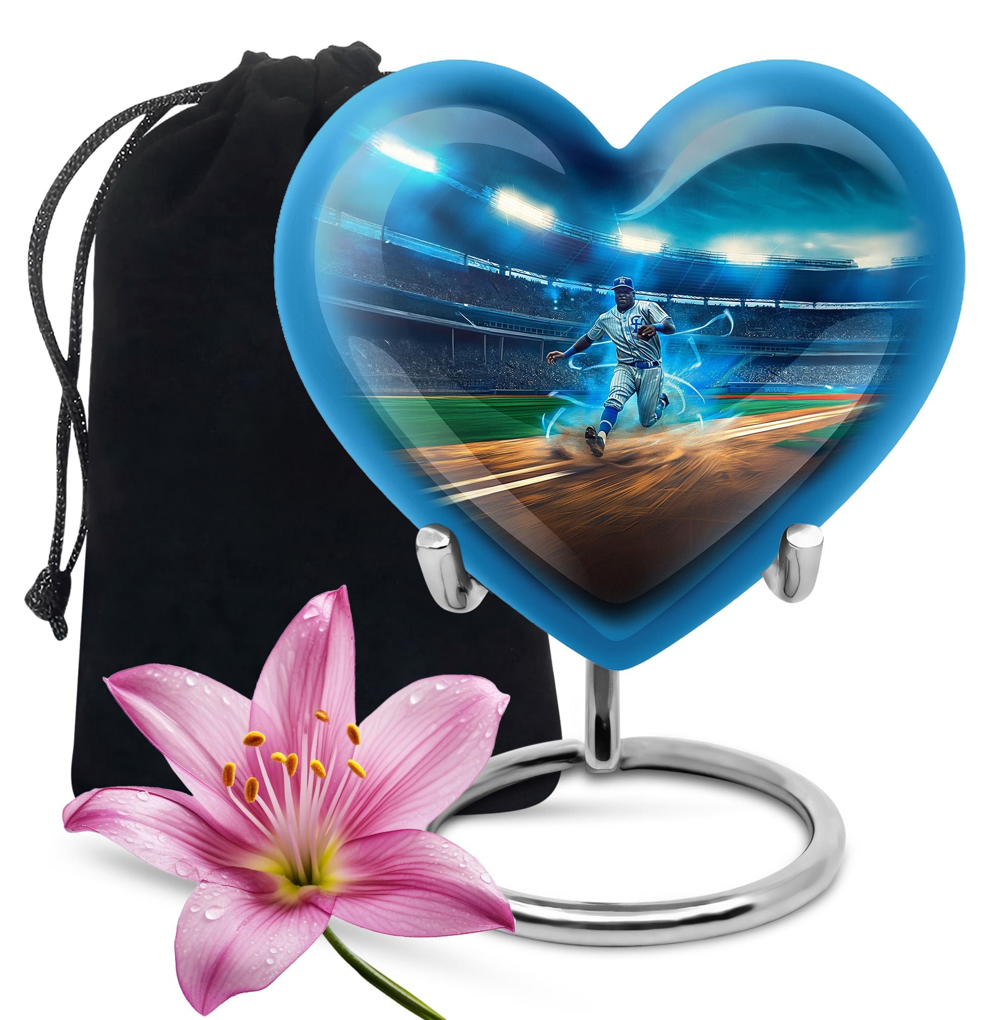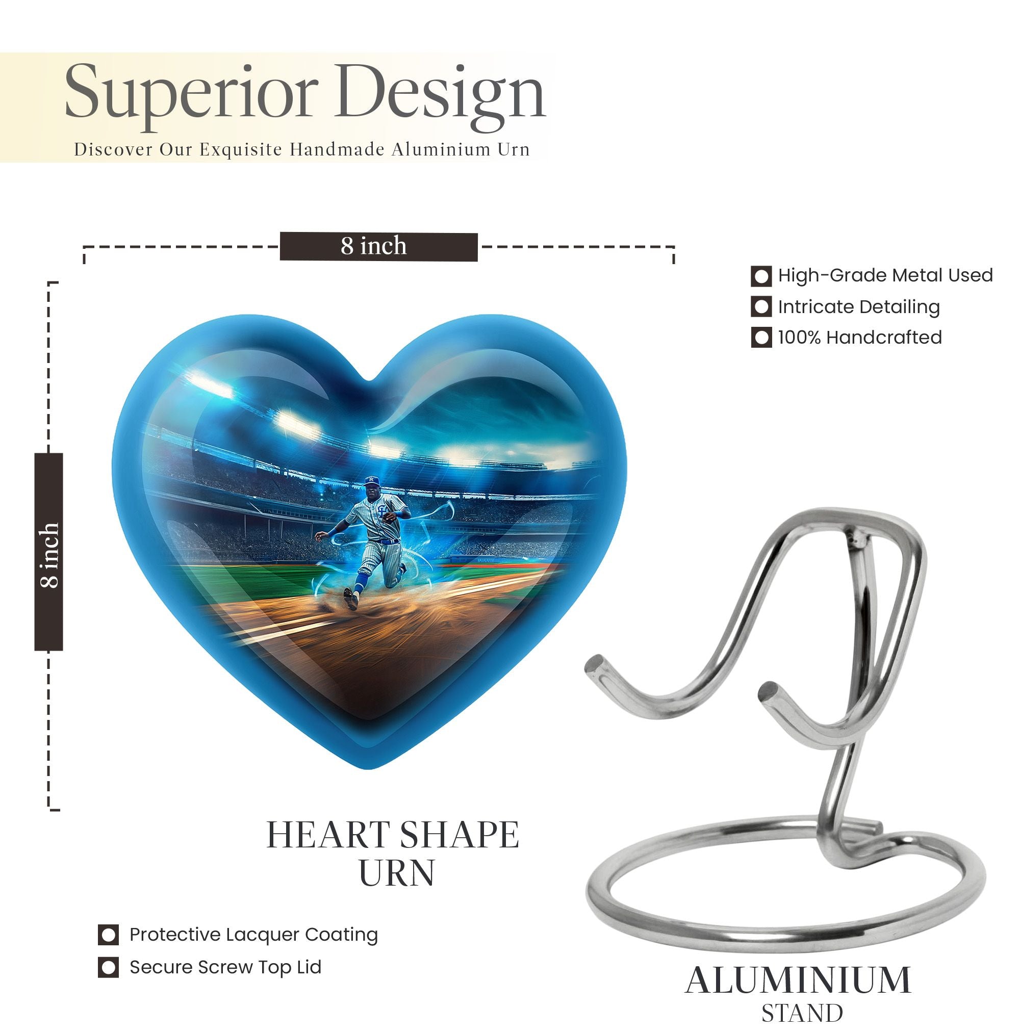 Cherish your beloved departed with this distinguished cremation urn. Crafted from high-quality aluminum, this 10-inch, heart-themed baseball urn has a capacity to hold up to 200 cubic inches of ashes, making it an ideal large urn. Its abstraction theme provides a token of love and fond remembrance. The urn comes with an exquisite velvet pouch for respectful containment of ashes. With a weight of 3.3 pounds and standing tall at 10 inches in height, it's as substantial and impressive as the memory of your loved one should be. What sets our urn apart is the personal touch we provide - you have the option to personalize this urn with engraved names, adding a unique dimension of intimacy. Note, the baseball urn, serving as one of the symbolic cremation urns for men, is also sought after as a burial urn for cremation ashes for a mother. This versatile cremation urn can serve to memorialize any departed loved one with dignity and affection.