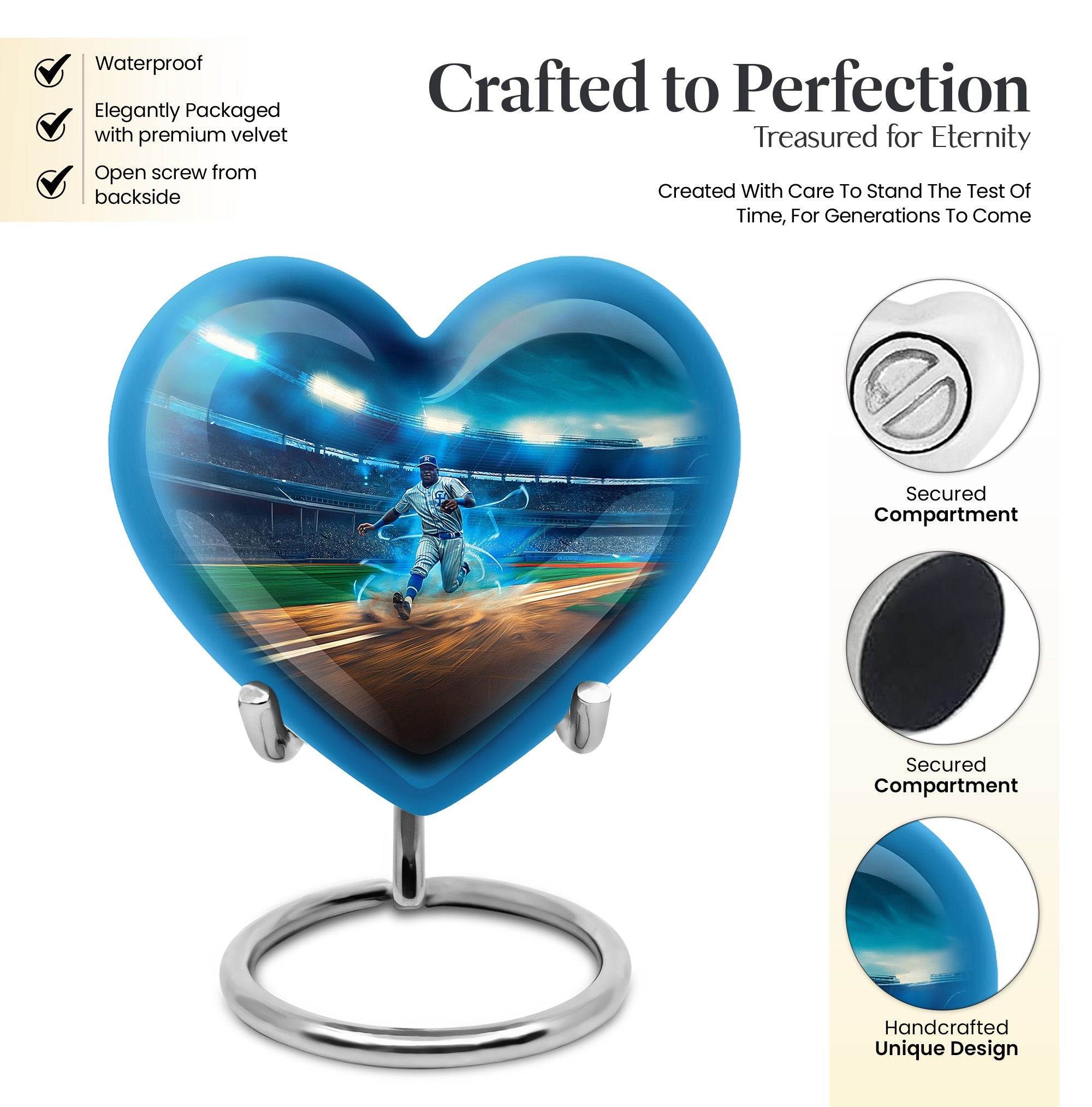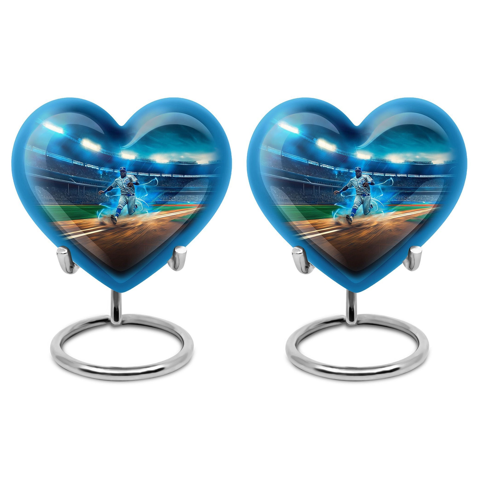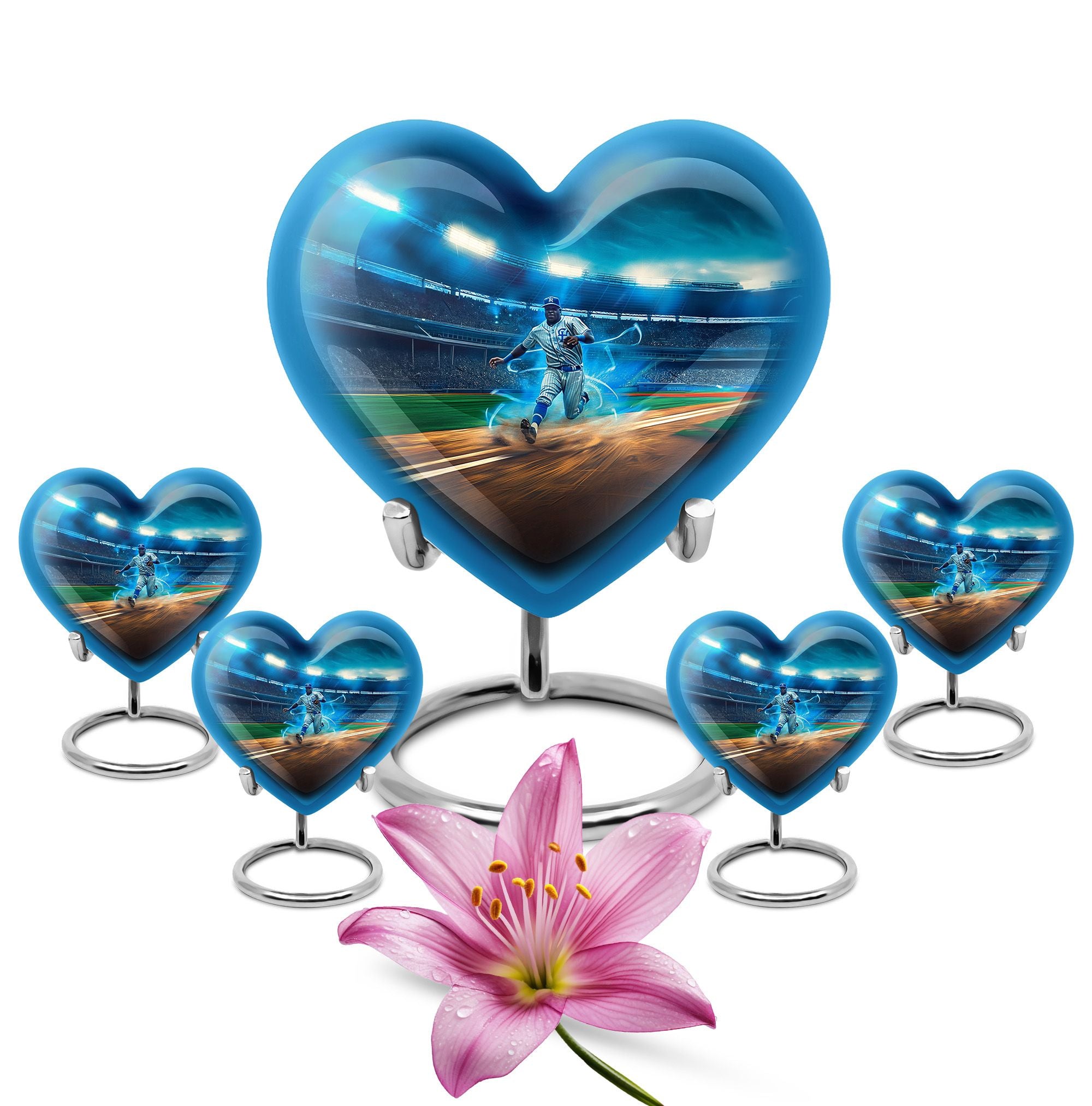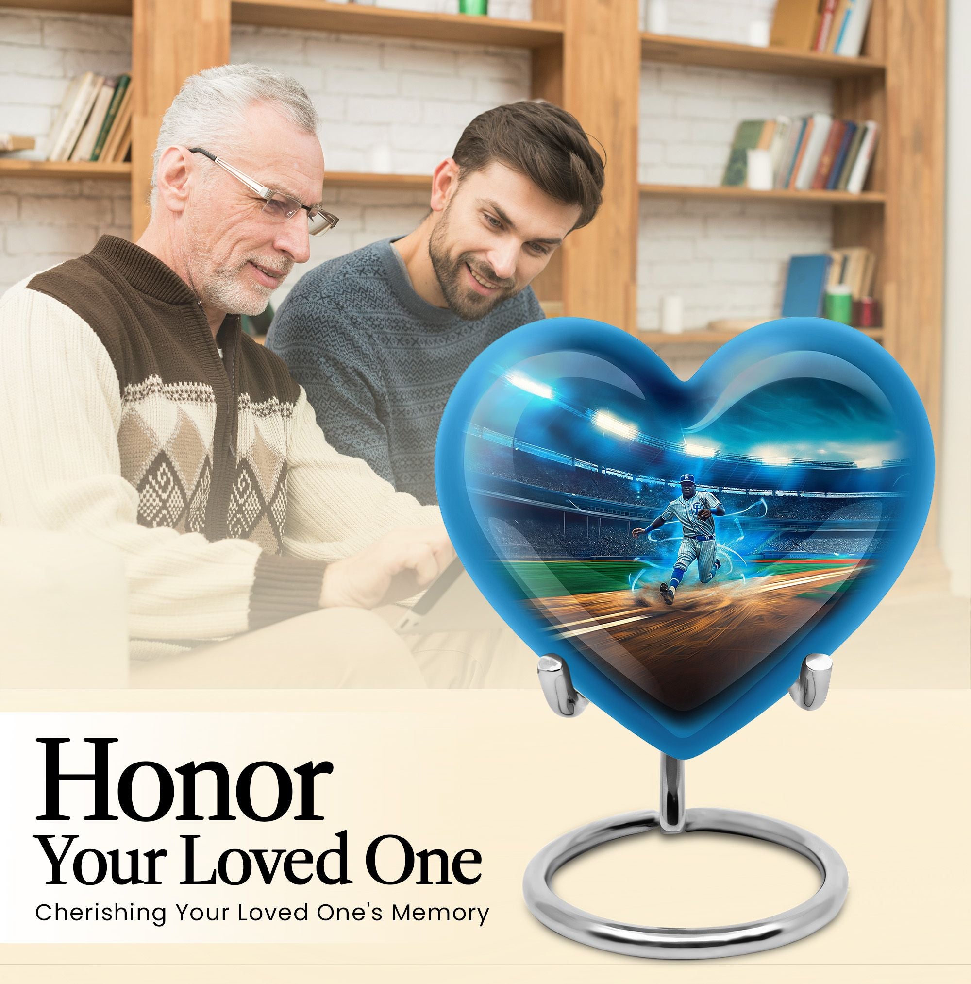 Cherish your beloved departed with this distinguished cremation urn. Crafted from high-quality aluminum, this 10-inch, heart-themed baseball urn has a capacity to hold up to 200 cubic inches of ashes, making it an ideal large urn. Its abstraction theme provides a token of love and fond remembrance. The urn comes with an exquisite velvet pouch for respectful containment of ashes. With a weight of 3.3 pounds and standing tall at 10 inches in height, it's as substantial and impressive as the memory of your loved one should be. What sets our urn apart is the personal touch we provide - you have the option to personalize this urn with engraved names, adding a unique dimension of intimacy. Note, the baseball urn, serving as one of the symbolic cremation urns for men, is also sought after as a burial urn for cremation ashes for a mother. This versatile cremation urn can serve to memorialize any departed loved one with dignity and affection.