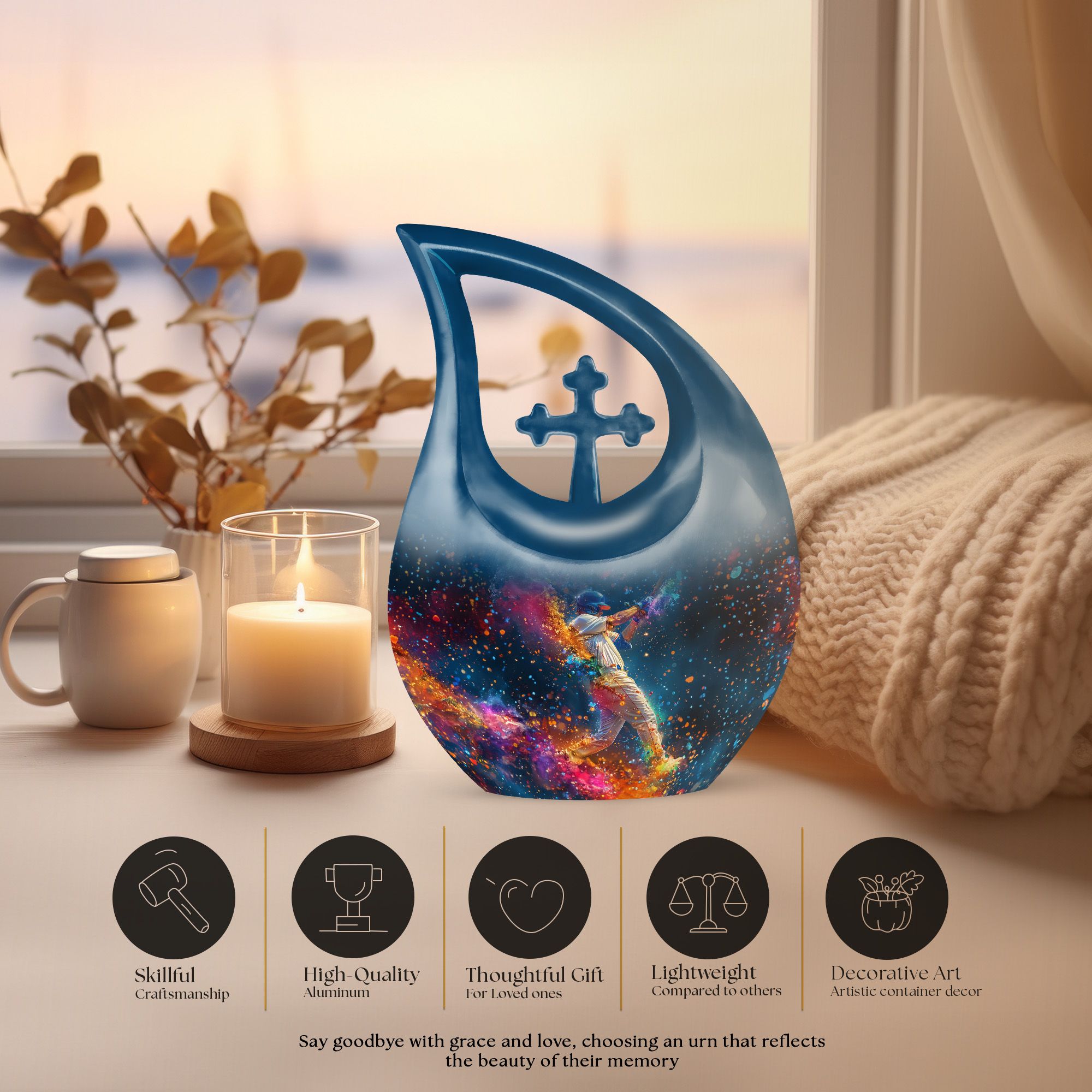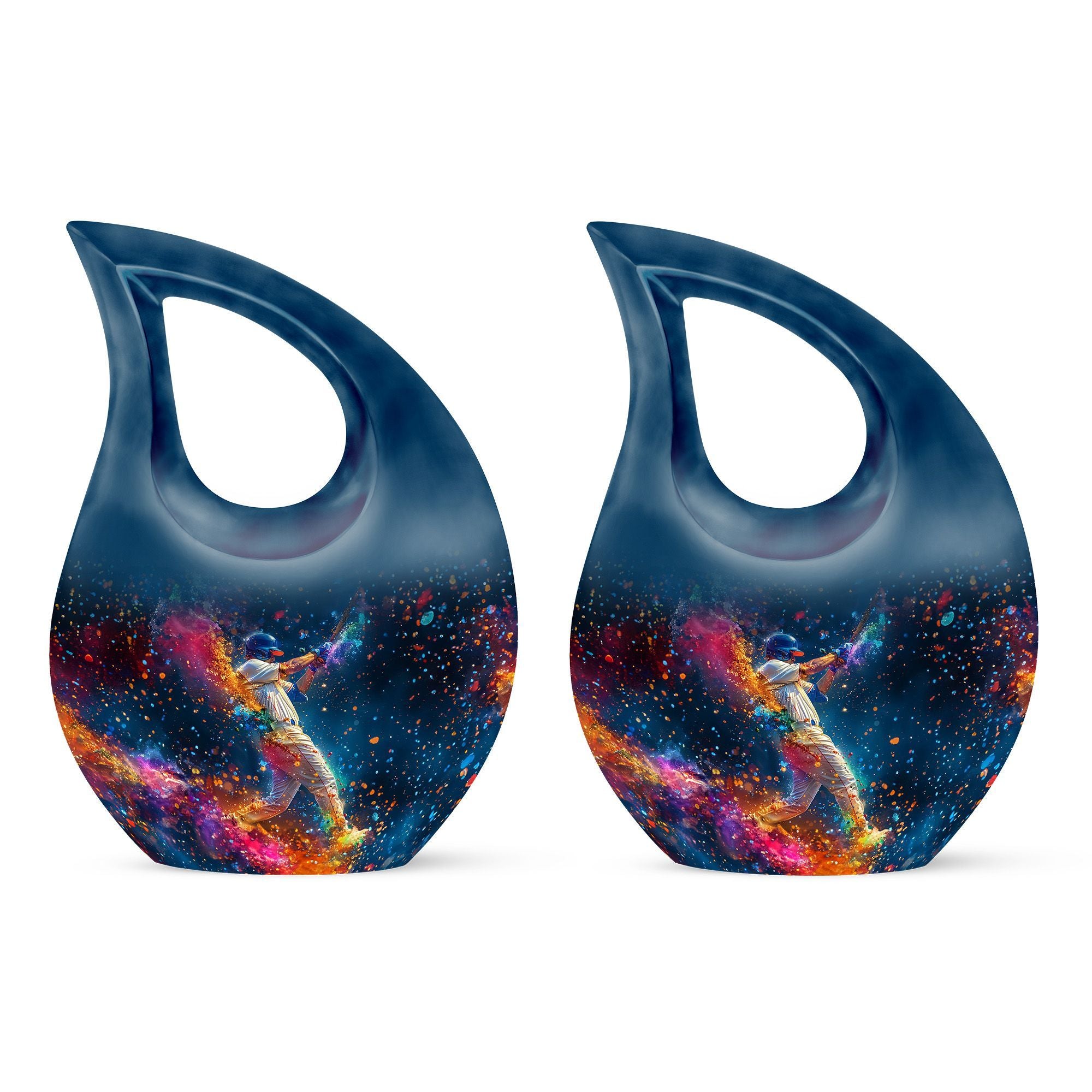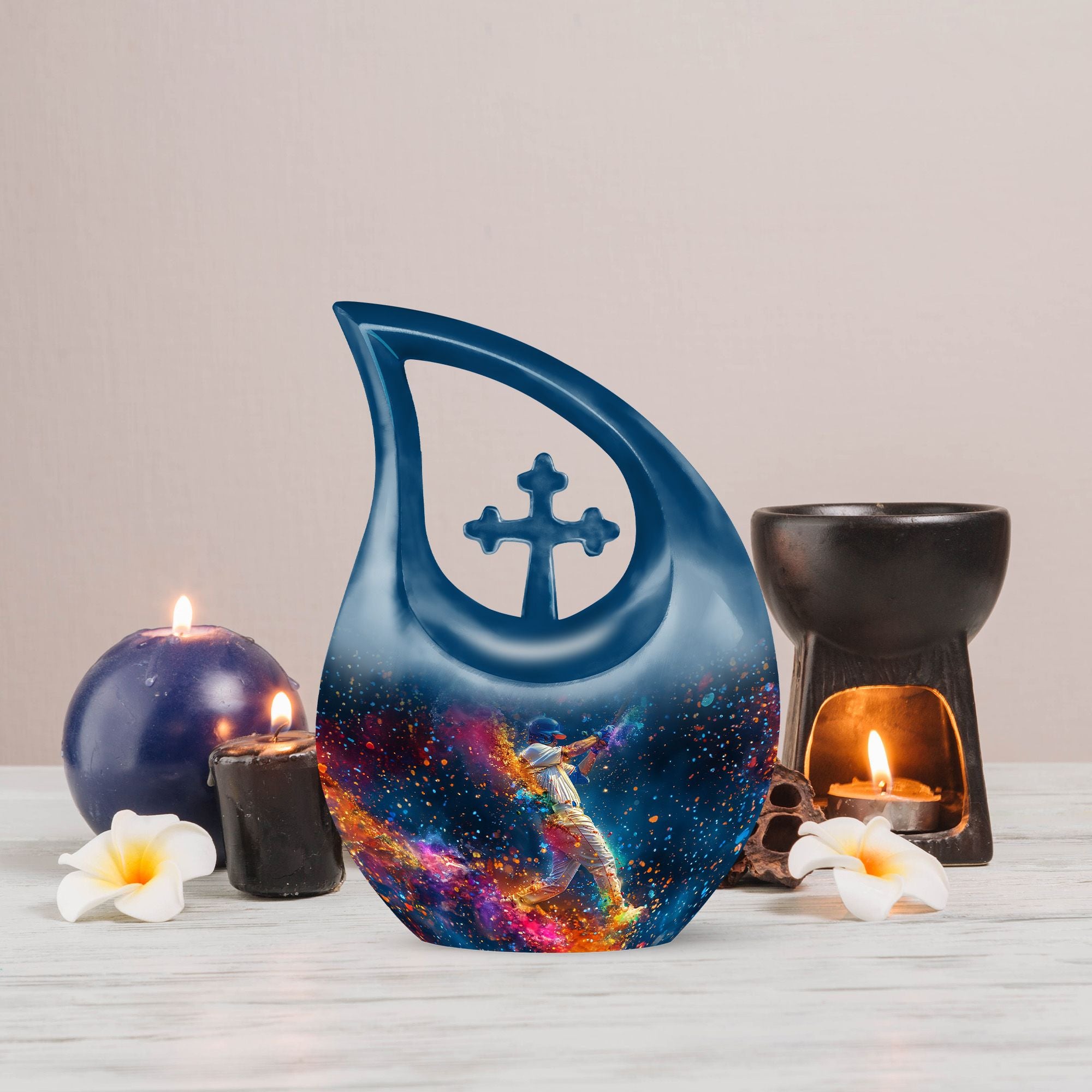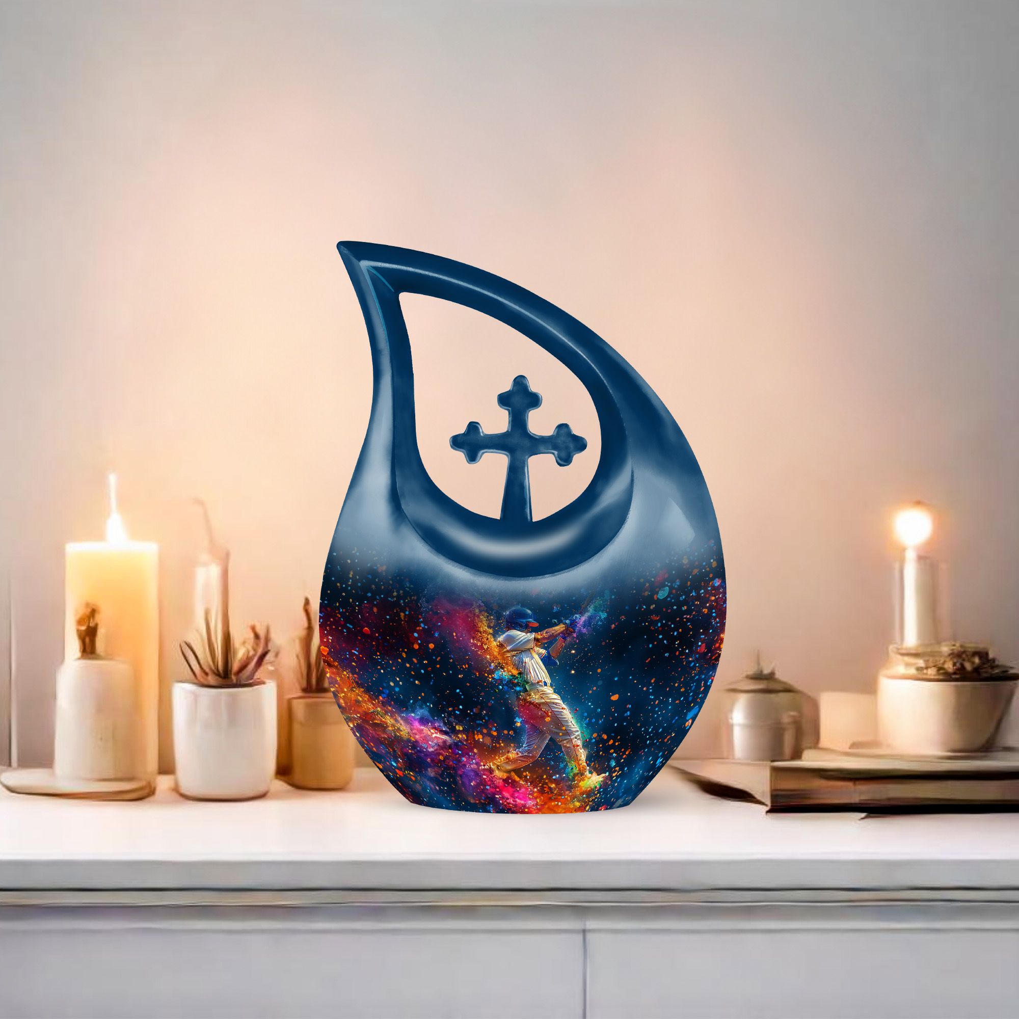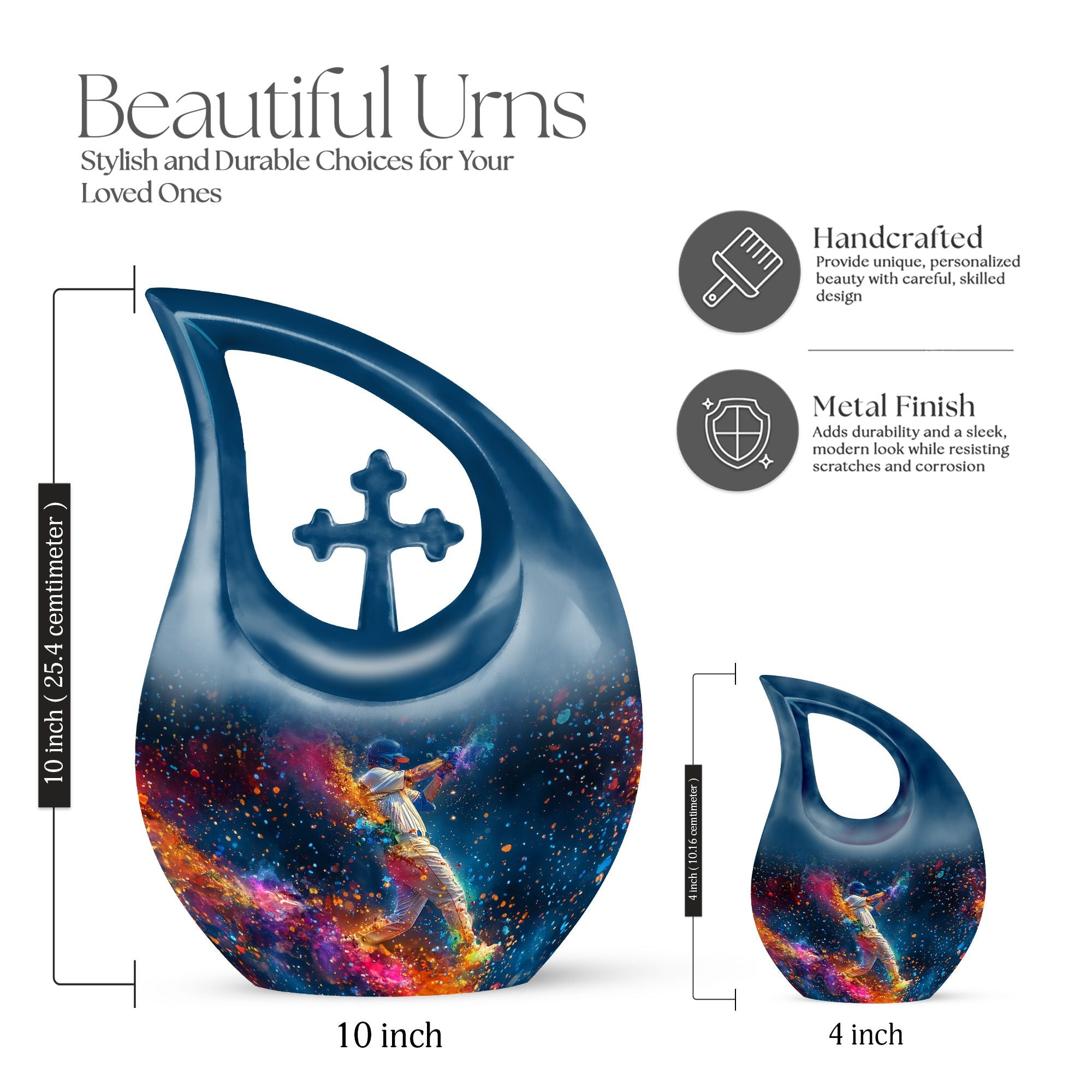Honor your cherished one's memory with our 10 Inch Cross Drop Baseball Urn, an exquisite tribute designed meticulously to hold precious ashes. Crafted from robust aluminium, these extra-large cremation urns are substantial, with a weight of 3.3 pounds, and feature poised dimensions of 10 inches in height. Accepting a remarkable 200 cubic inches in capacity, our urns deliver solace and respect, paying homage to the departed soul. Personalization is available, allowing the engraving of names to maintain a connection beyond the veil. The urn comes with a comforting velvet pouch, ensuring safe containment of the fine ashes. This urn, symbolic of baseball's resilience and spirit, provides an earnest way to preserve the memory of your loved ones. Whether you're seeking to buy an urn or seeking companion options, our collection is unconditionally reliable. Promote peace with these metal urns for ashes, often rendered as the ultimate memorial urns.