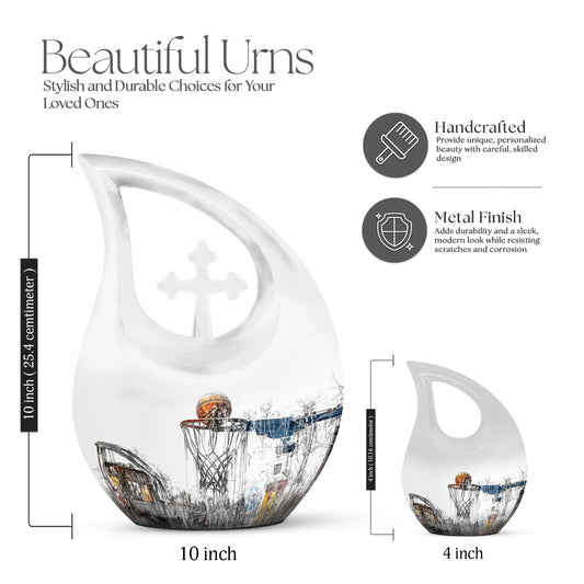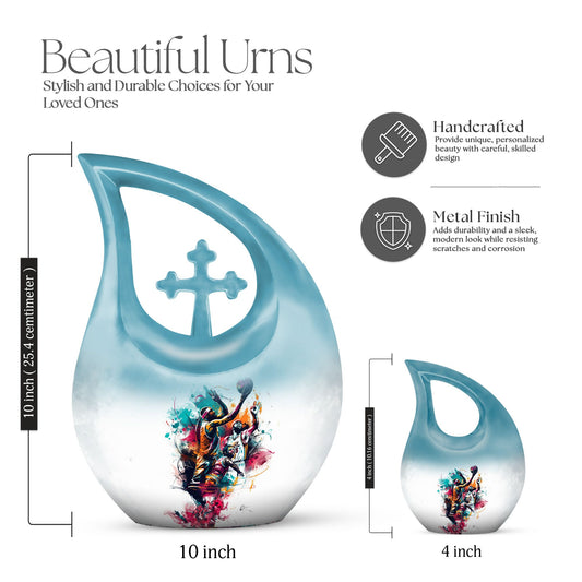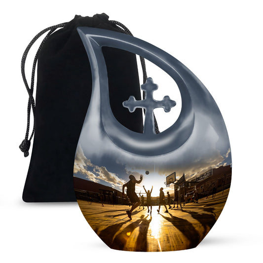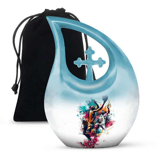 Each urn in this collection features basketball-themed artwork, from engraved balls and hoops to scenes of the game in motion, all crafted on durable aluminum cremation urns. Though these urns are not made from real sports materials, their sleek finish and custom design make them feel personal and authentic. The vibrant imagery pays tribute to the energy, discipline, and dedication that the game represents.