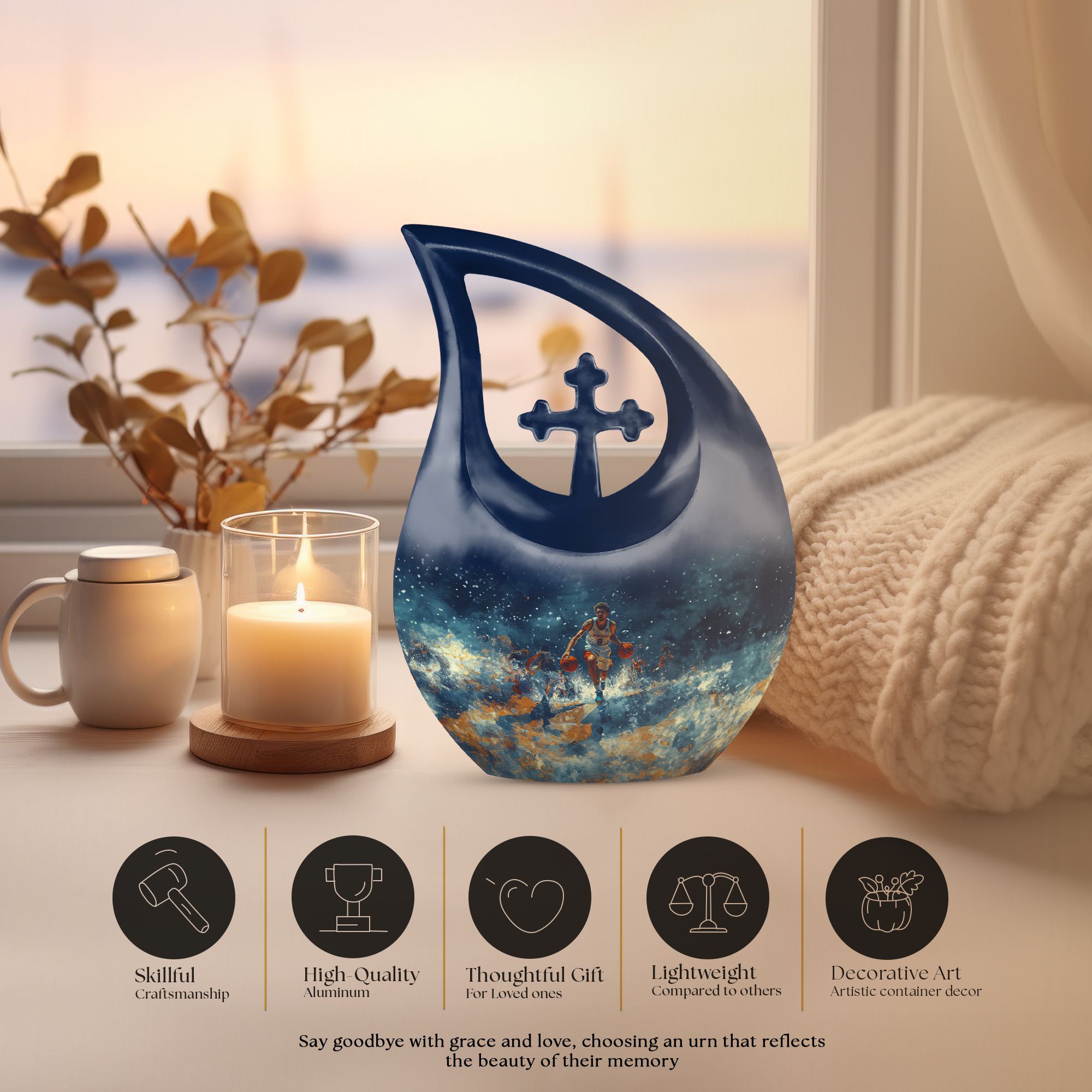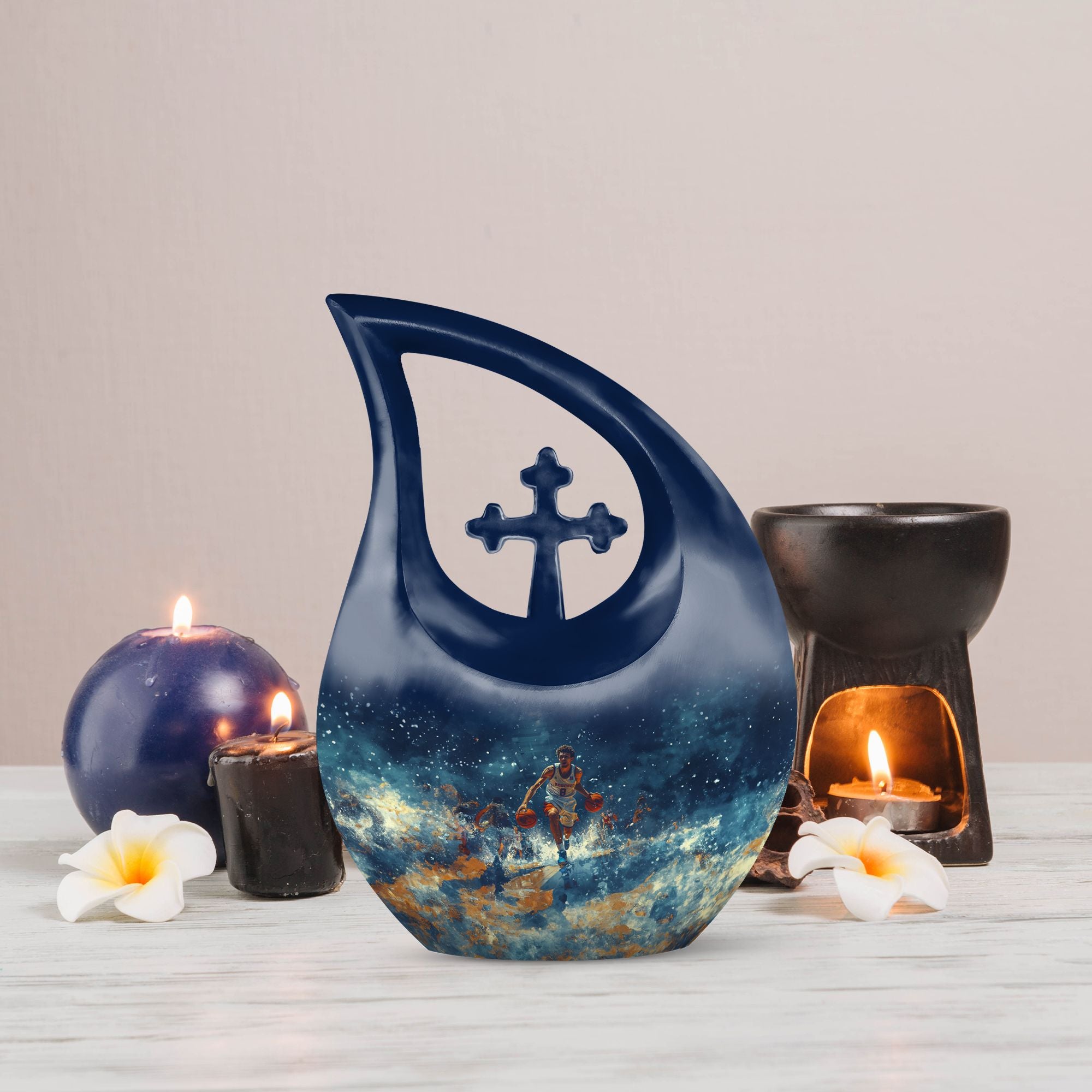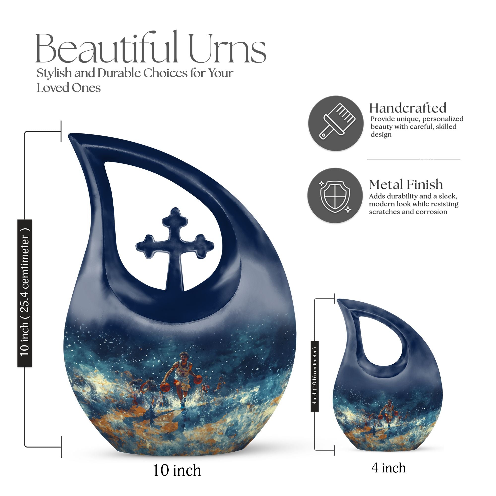 Celebrate the life of a passionate basketball enthusiast with our Basketball Urn - a symbolic piece from our Memorial Ceremony Supplies category. This Large Urn stands at a considerable height of 10 inches and weighs 3.3 pounds, offering the capacity to hold 200 cubic inches of ashes. Crafted from premium quality aluminium, the urn provides durability and aesthetics in one bundle, ensuring your precious memories are tightly closed within. The urn also comes with a velvet pouch, adding an additional safeguard for the contained ashes. The predominant feature of our Burial Urns for Adults is the Cross Drop design that seamlessly merges with the overarching basketball theme. Moreover, clients can personalize these urns with engraved names, adding a truly unique touch to the tribute. Dive into our collection of Angel Urns for Ashes, Engraved Urns, Double Urns for Ashes, and Cremation Ashes Keepsakes to discover more.