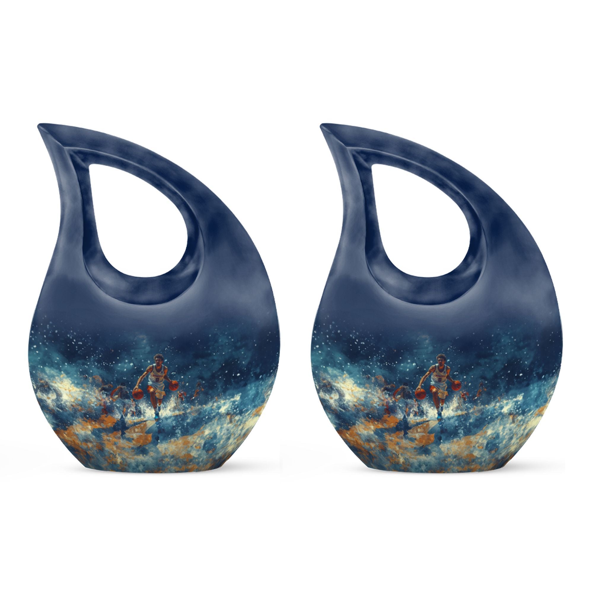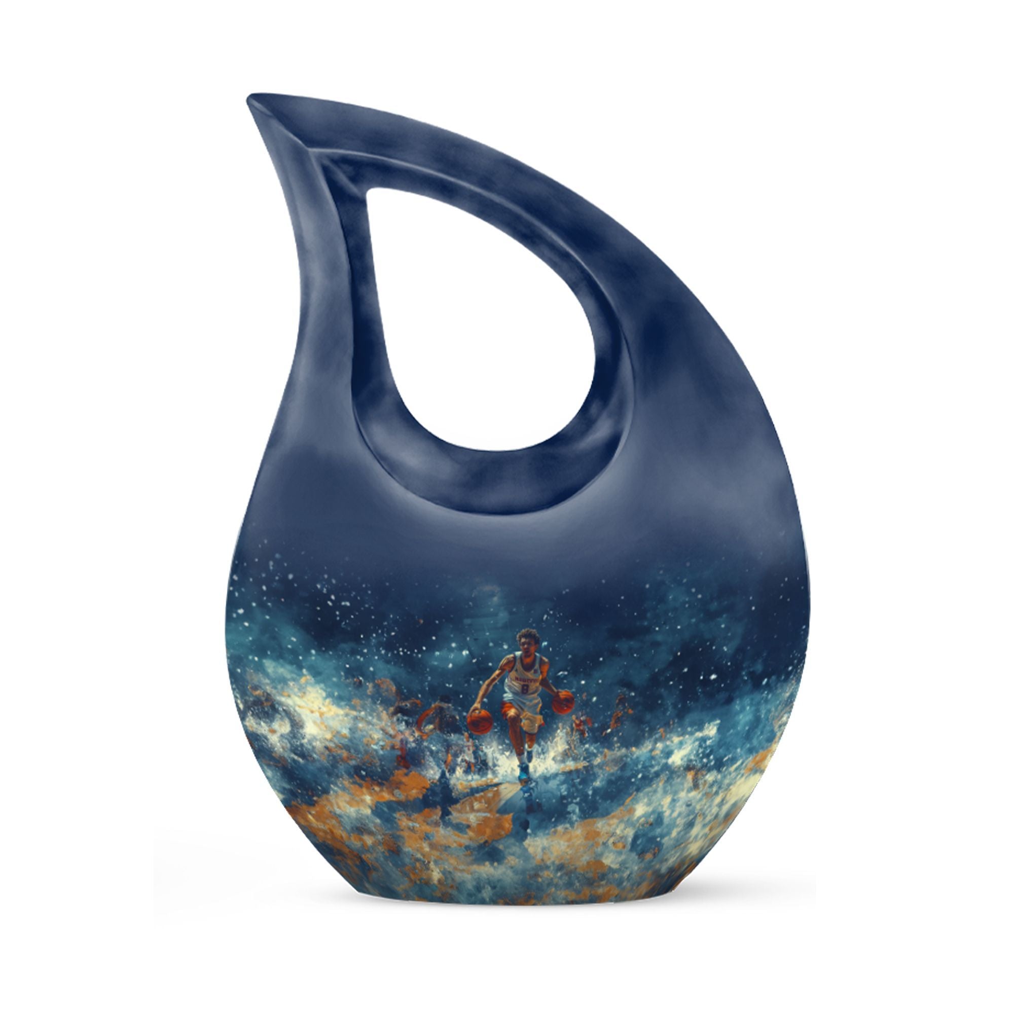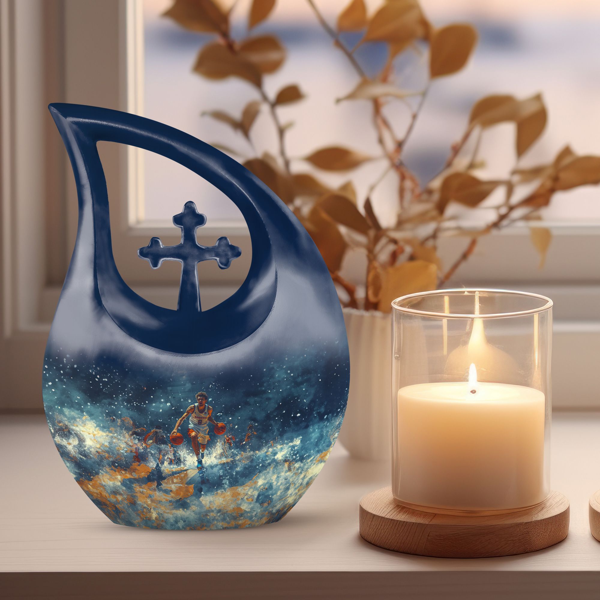 Celebrate the life of a passionate basketball enthusiast with our Basketball Urn - a symbolic piece from our Memorial Ceremony Supplies category. This Large Urn stands at a considerable height of 10 inches and weighs 3.3 pounds, offering the capacity to hold 200 cubic inches of ashes. Crafted from premium quality aluminium, the urn provides durability and aesthetics in one bundle, ensuring your precious memories are tightly closed within. The urn also comes with a velvet pouch, adding an additional safeguard for the contained ashes. The predominant feature of our Burial Urns for Adults is the Cross Drop design that seamlessly merges with the overarching basketball theme. Moreover, clients can personalize these urns with engraved names, adding a truly unique touch to the tribute. Dive into our collection of Angel Urns for Ashes, Engraved Urns, Double Urns for Ashes, and Cremation Ashes Keepsakes to discover more.