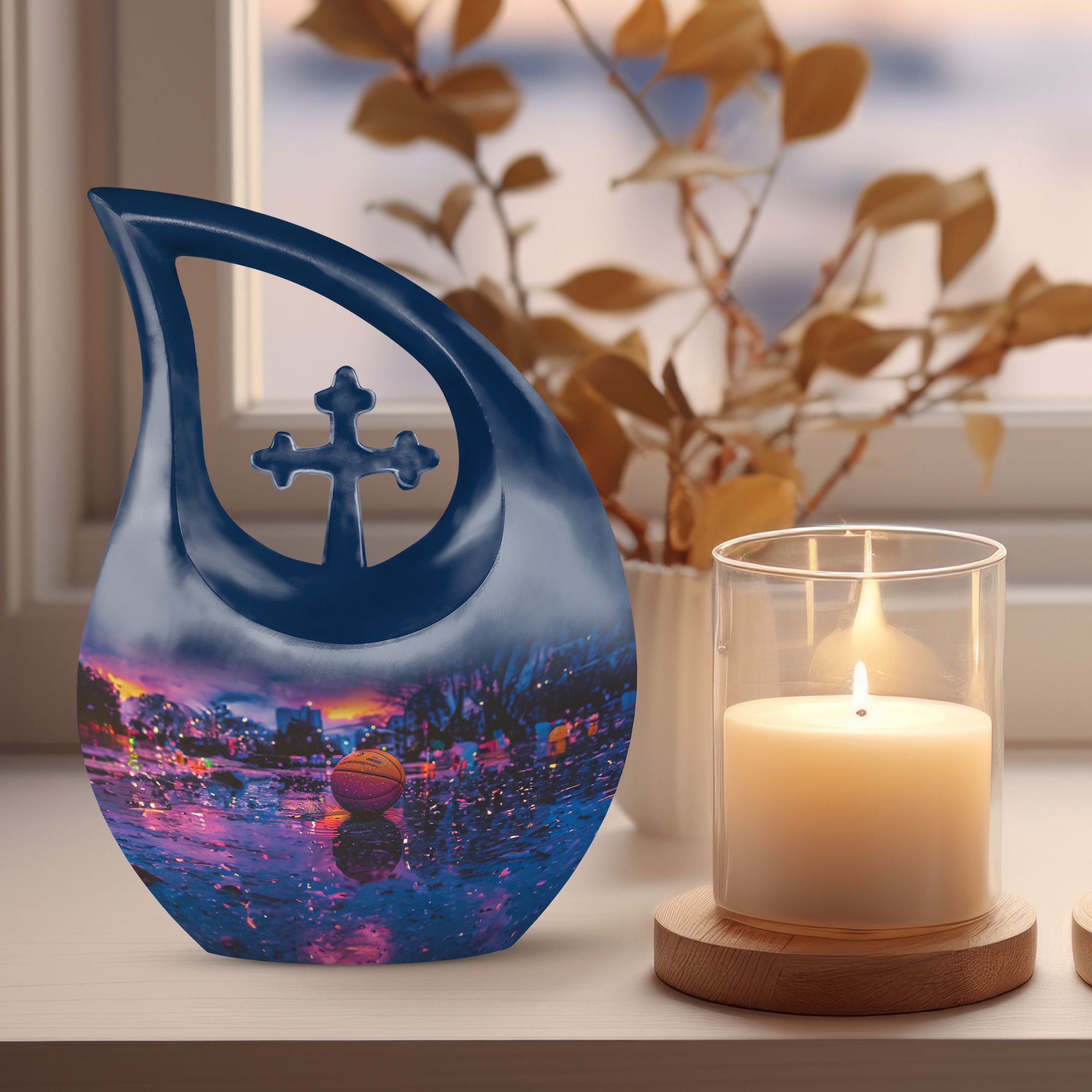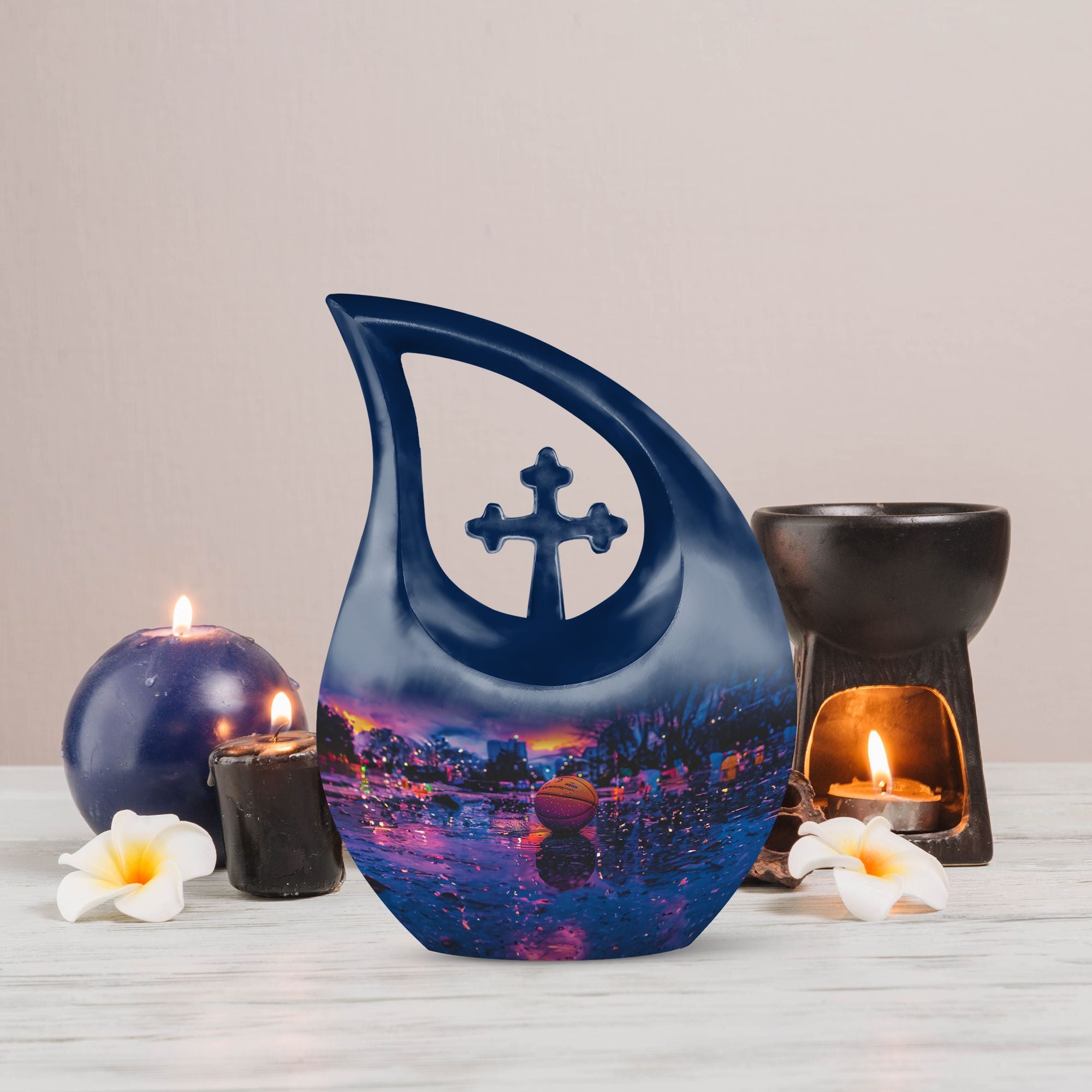 Looking for a unique way to memorialize your loved one who was a devout basketball enthusiast? Our notable 'Basketball Urn' is an exceptional choice. Small yet dignified, this aluminum urn measures 10 inches in height and can accommodate up to 200 cubic inches of cremation ashes. Our special 'Cross Drop' theme signifies divine solace and peace, making this quality urn a fitting tribute. The hefty weight of 3.3 pounds ensures stability and robustness, speaking to the everlasting bond you share. You can personalize this urn with engraved names, making it a more intimate and heartwarming keepsake. It arrives with a velvet pouch to securely hold the ashes, exuding a touch of elegance. Perfect for those in search of 'Keepsake Urns For Human Ashes' or 'Urns For Cremation Ashes'. Remember, it is not just an urn; it’s a regal dwelling for cherished memories that transcends time. Note: This soaring 'Basketball Urn' comes in a subtle shade of majestic purple, presenting an alternative for those seeking a ‘Purple Urn’ or even a 'Biodegradable Urn'.