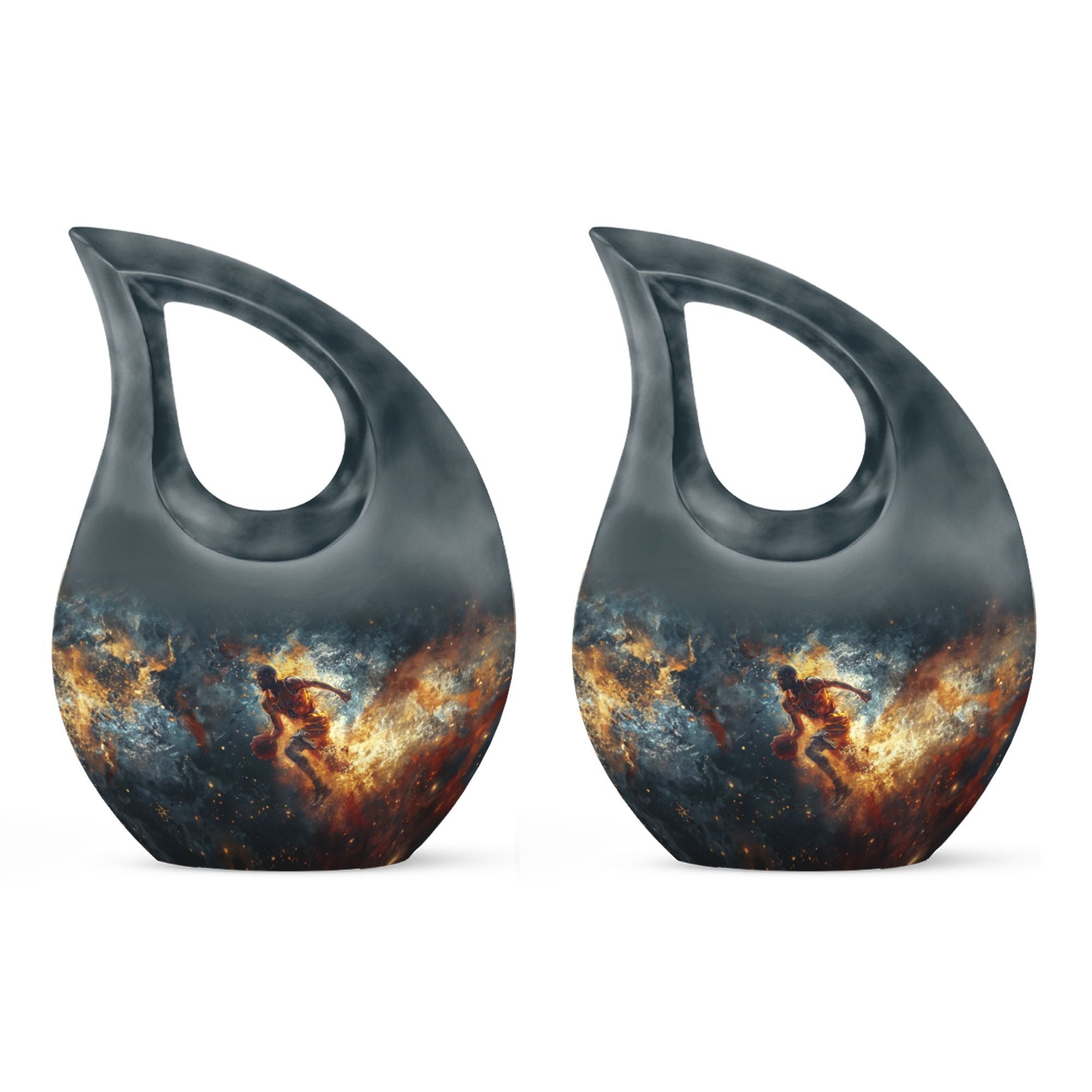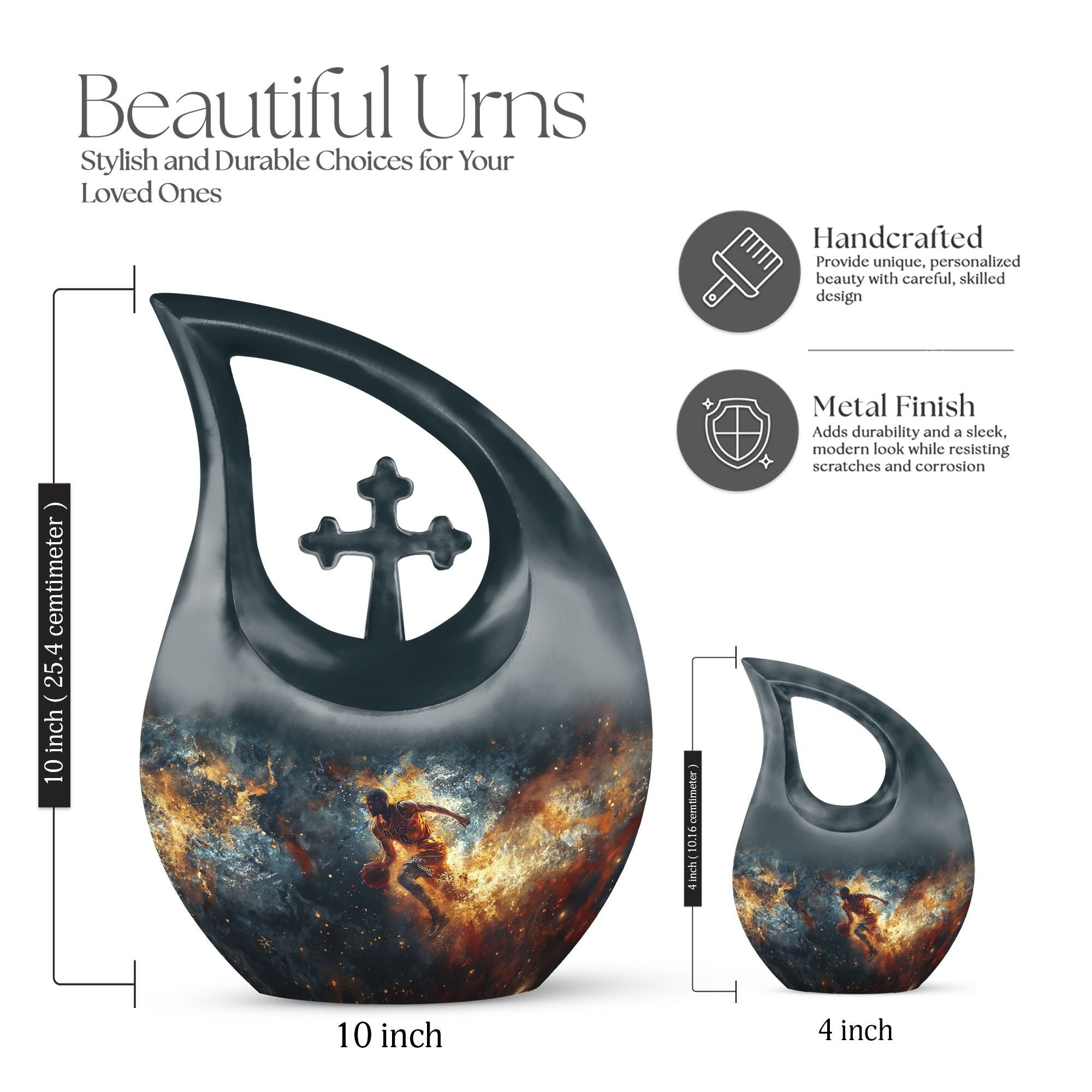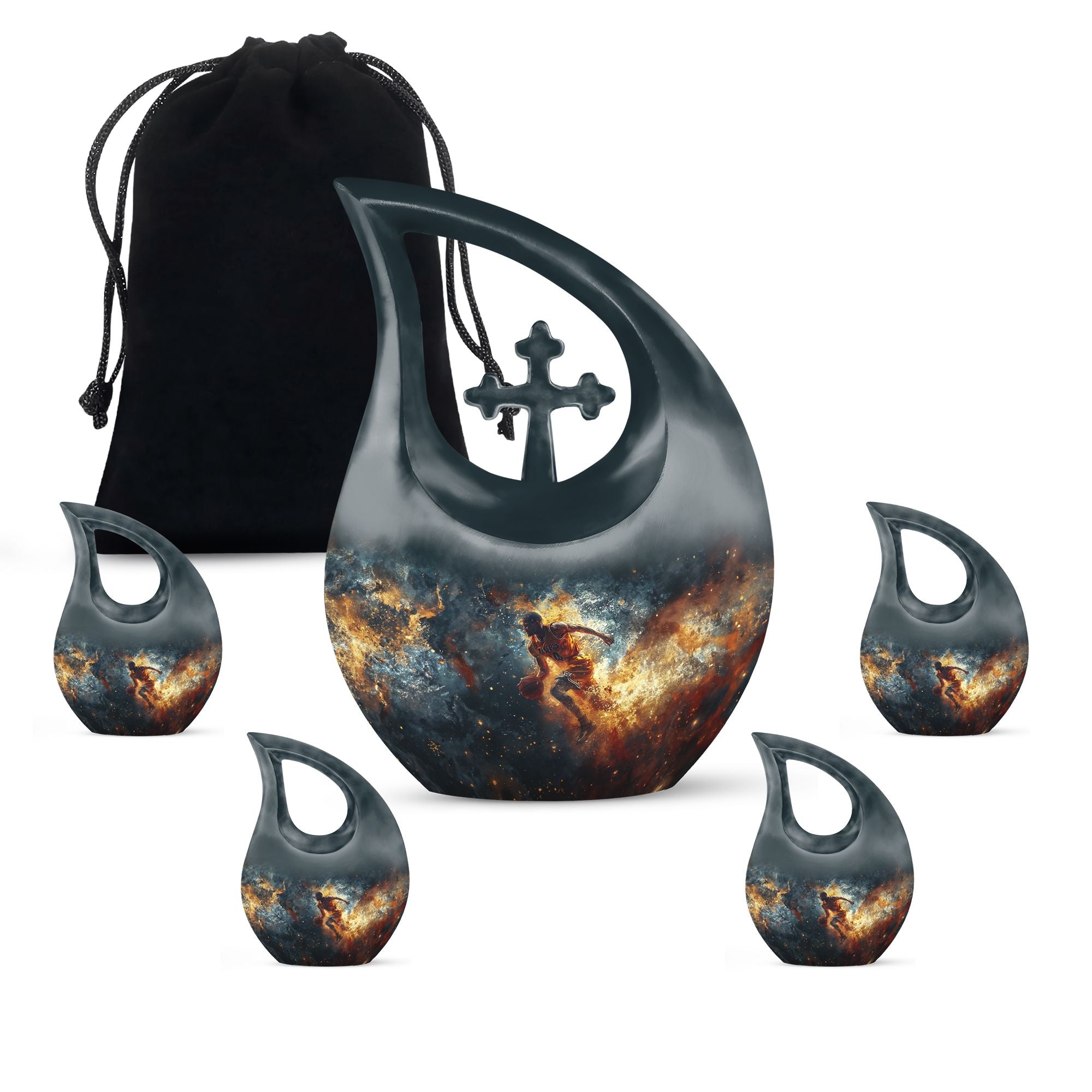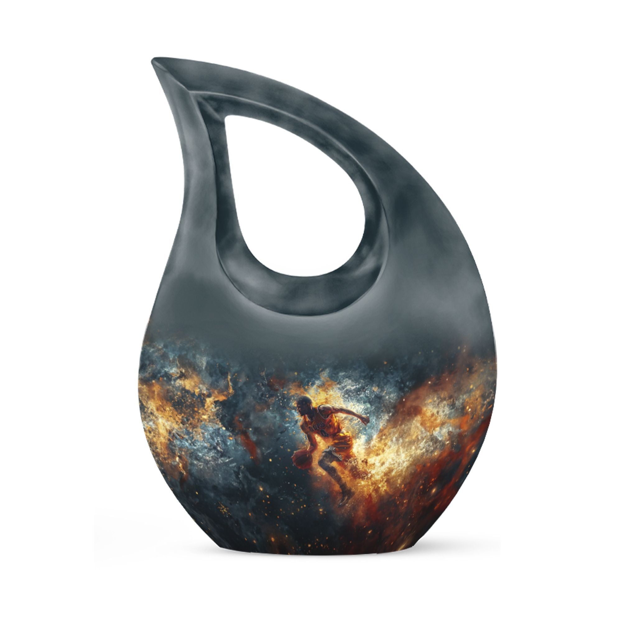 Discover a unique way to memorialize your loved one with this 10 inch large Basketball Urn, specifically designed for the sports enthusiasts. Combining reverence and passion, the urn's Cross Drop theme resonates with an understated elegance. With a generous capacity of 200 cubic inches, this keepsake urn for ashes can accommodate the departed's earthly remains with dignity and respect. Crafted from sturdy aluminum, it weighs a substantial 3.3 pounds, promising long-lasting sturdiness. Also included in your order will be a soft velvet pouch that ensures the safe containment and transportation of ashes. Stitching together solace and symbolism, this urn can be personalized to engrave names, allowing a more intimate connection. Look beyond generic cremation vessels and invest in this modern cremation casket that transforms an irreplaceable loss into a treasured memory. Dive into a curated collection of unique urns for ashes. This basketball-themed urn is a fitting tribute, that harmoniously merges the on-court fervor with the tranquillity of eternal rest.