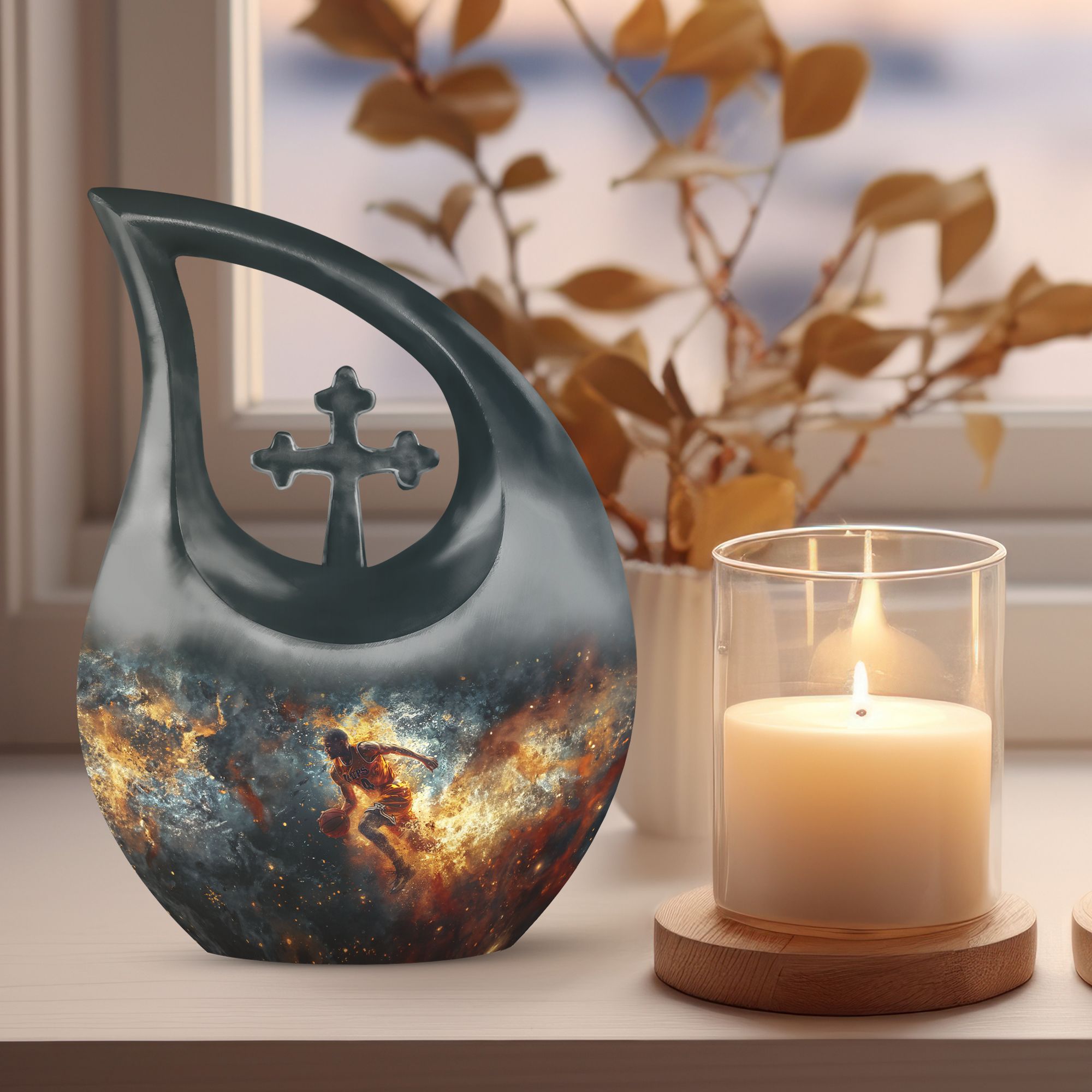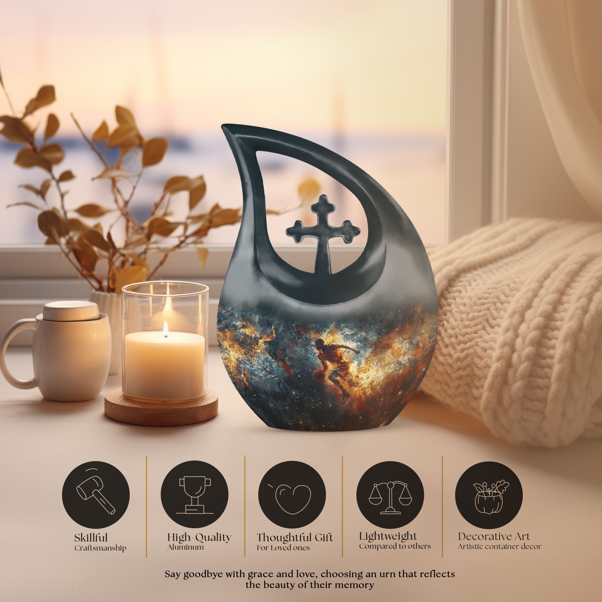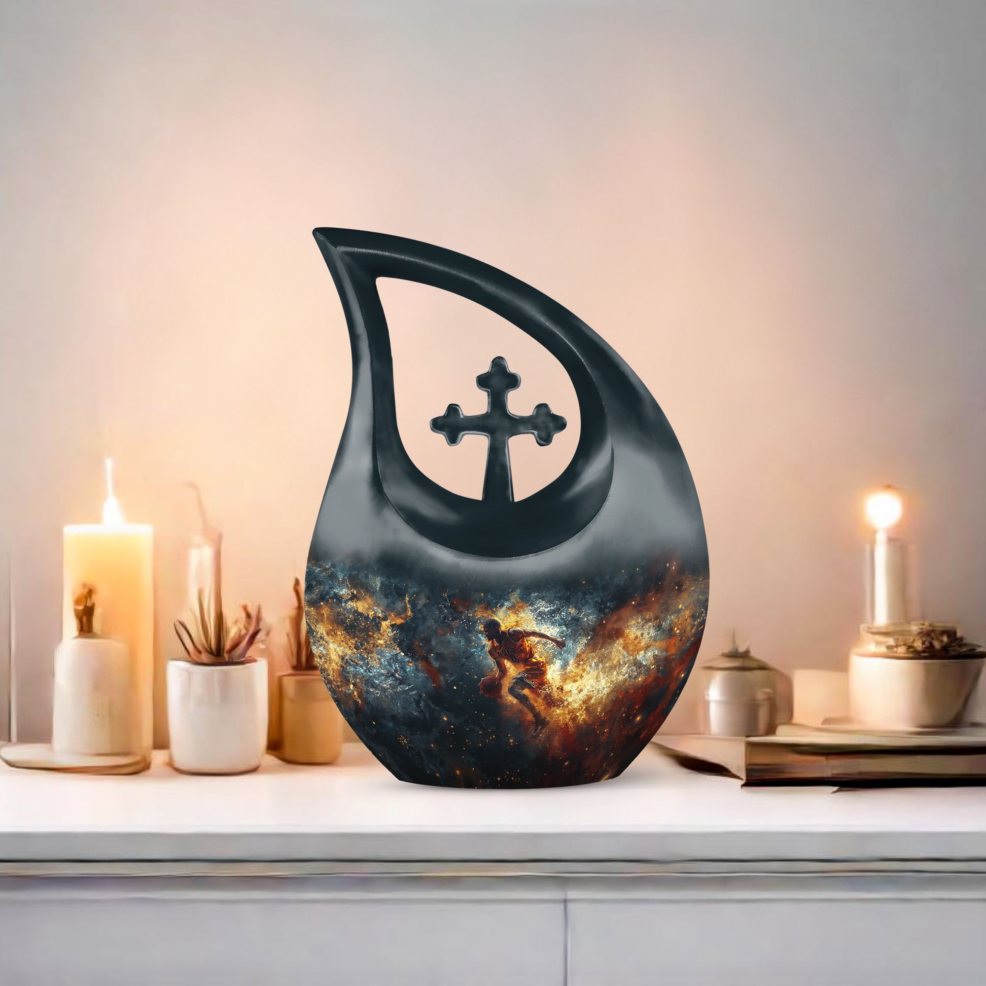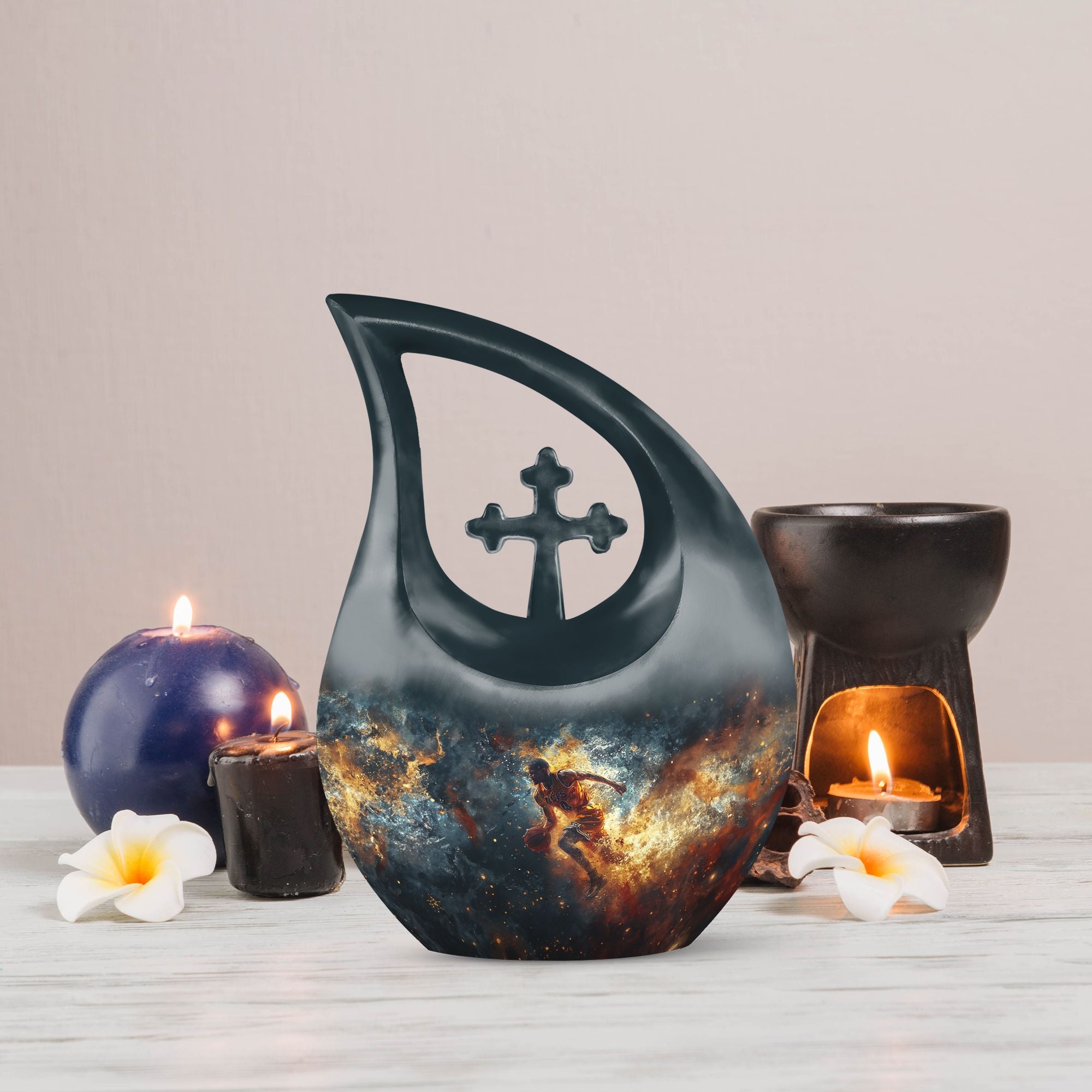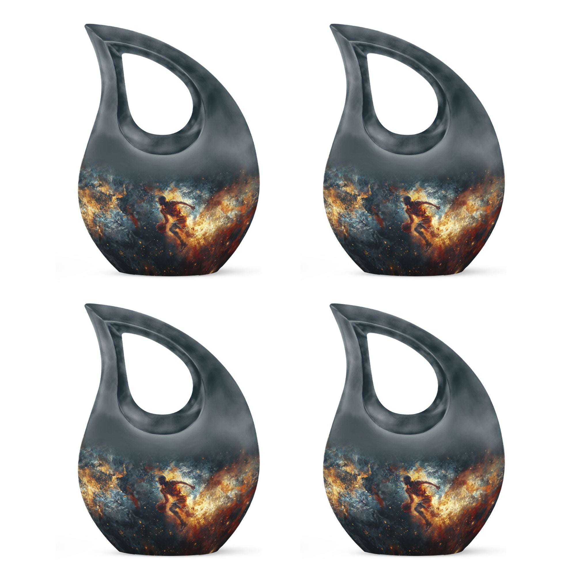 Discover a unique way to memorialize your loved one with this 10 inch large Basketball Urn, specifically designed for the sports enthusiasts. Combining reverence and passion, the urn's Cross Drop theme resonates with an understated elegance. With a generous capacity of 200 cubic inches, this keepsake urn for ashes can accommodate the departed's earthly remains with dignity and respect. Crafted from sturdy aluminum, it weighs a substantial 3.3 pounds, promising long-lasting sturdiness. Also included in your order will be a soft velvet pouch that ensures the safe containment and transportation of ashes. Stitching together solace and symbolism, this urn can be personalized to engrave names, allowing a more intimate connection. Look beyond generic cremation vessels and invest in this modern cremation casket that transforms an irreplaceable loss into a treasured memory. Dive into a curated collection of unique urns for ashes. This basketball-themed urn is a fitting tribute, that harmoniously merges the on-court fervor with the tranquillity of eternal rest.