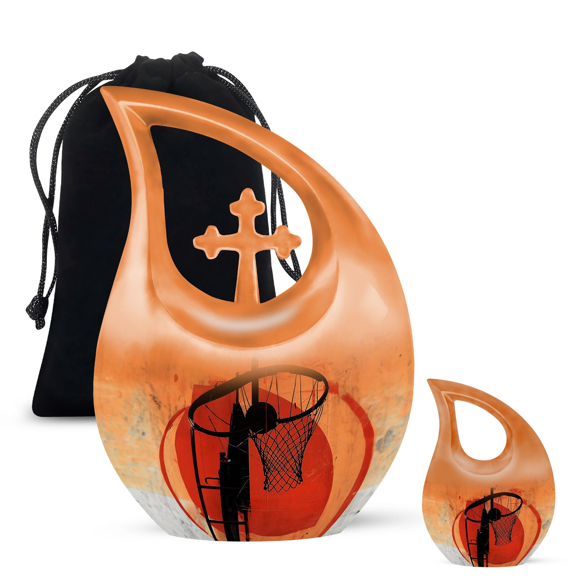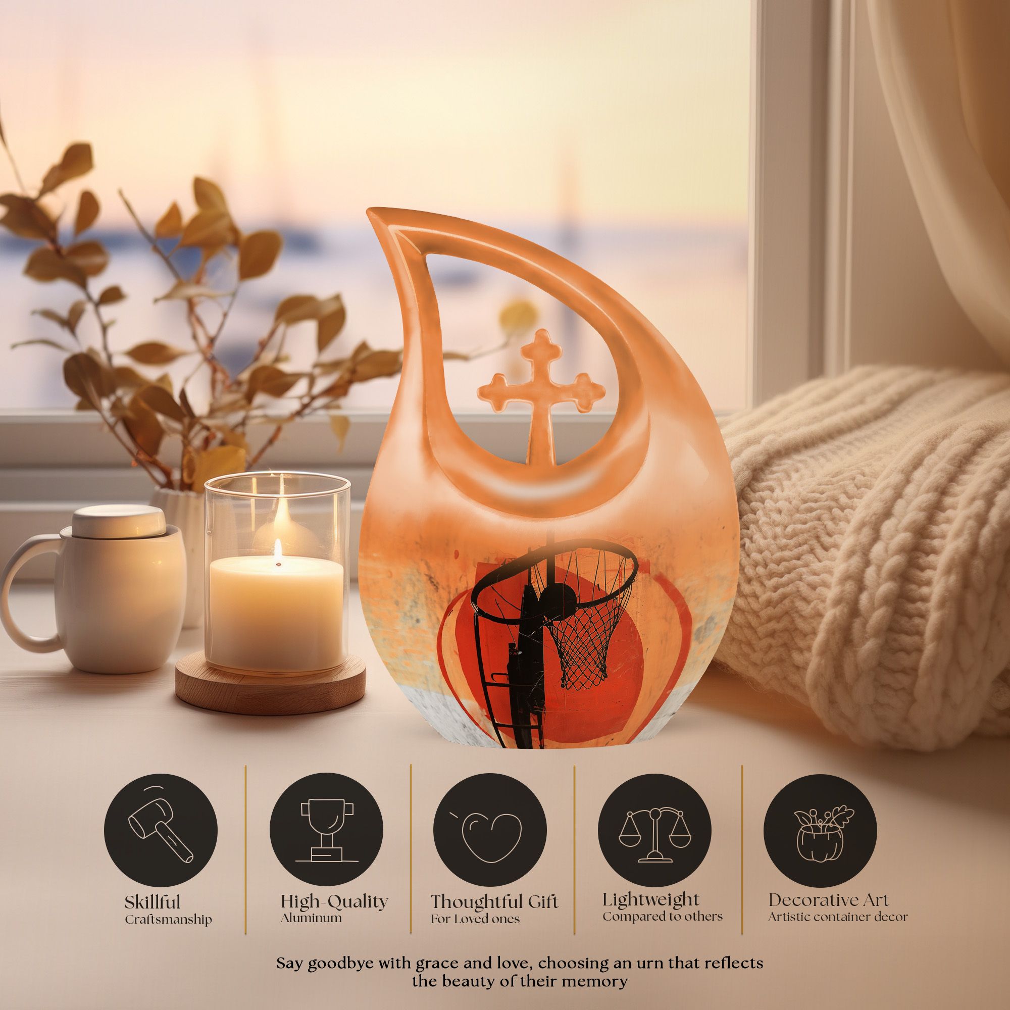 Expertly crafted from durable aluminium, this urn features a bold basketball-themed design symbolizing passion, energy, and the spirit of the sport. Its polished finish and secure screw-top lid make it reliable for home memorials or as an urn for burial in ground. Families looking for a funeral urn adult or adult funeral urn will appreciate its strong build and vibrant detailing. It pairs beautifully with funeral keepsake urns for sharing ashes among family members or for use with a mini keepsake funeral urn.