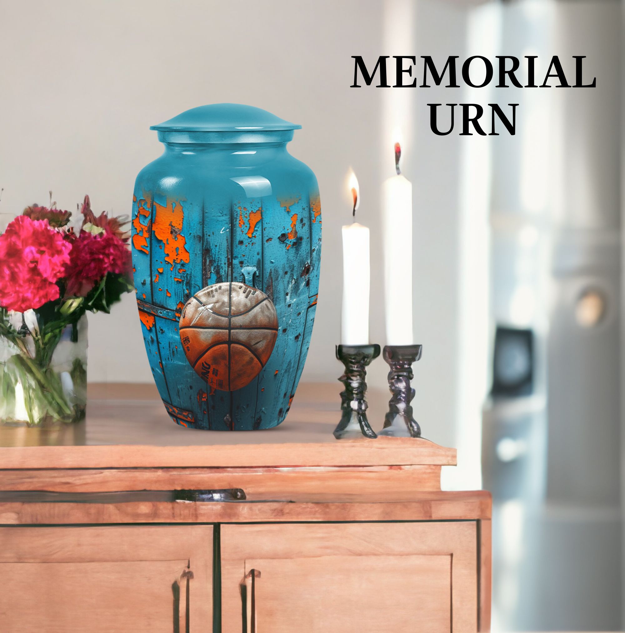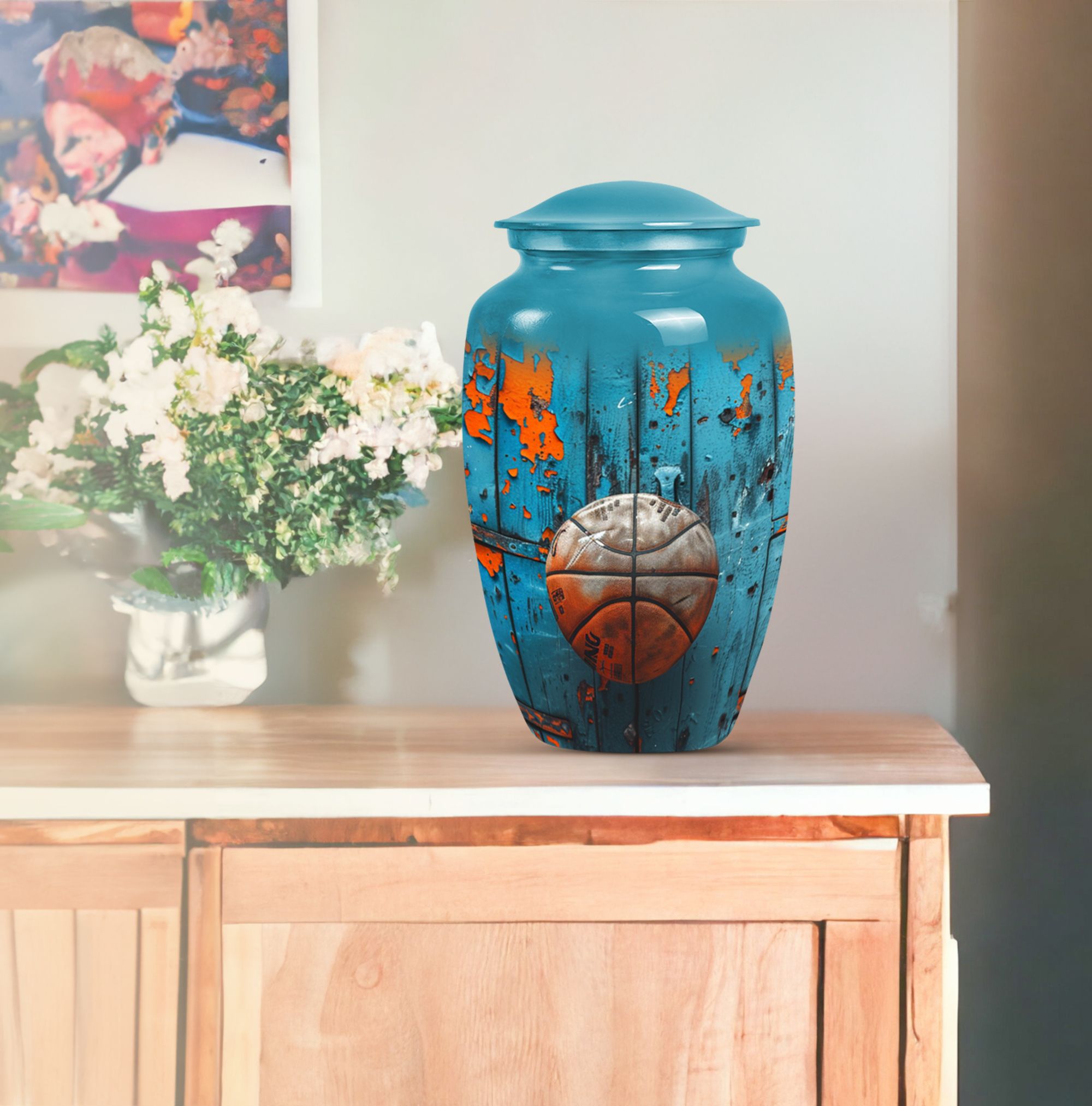 Find solace during trying times through our 10-inch Basketball Urn. It's designed as a poignant tribute to those with love for the sport, serving as an exquisite receptacle for their cherished remains. Crafted from high-quality, durable aluminium, the urn weighs 3.3 pounds and can hold up to 200 cubic inches of ashes. To facilitate a smooth personal remembrance process, the urn comes with a velvet pouch for containment of ashes, offering a comforting touch. Enhanced further with an enchanting butterfly theme, this large urn carries a depth of sentiment that's palpable. Complimentary personalization is also available - you can etch names into this classic urn. This unique keepsake serves well in funeral burial ceremonies and memorial observances. Our basketball urn is more than a vessel, it's a testament to a life cherished and remembered. Key search terms include 'basketball urn', 'funeral burial urns', 'memorial urns', 'Large Urns', 'Memorial large urns for human ashes', 'urn human ash urn ash', 'urn', and 'adult cremation urns'.