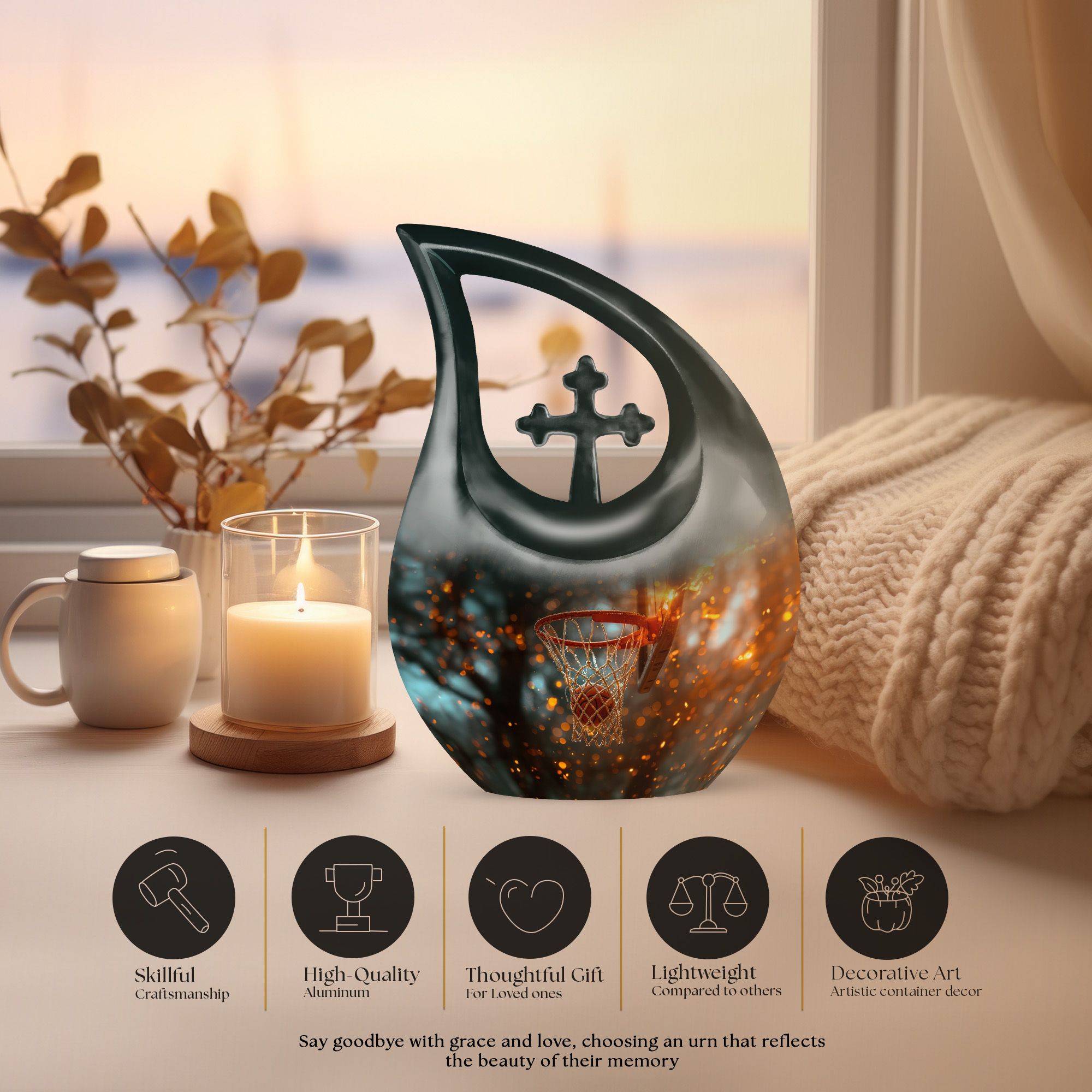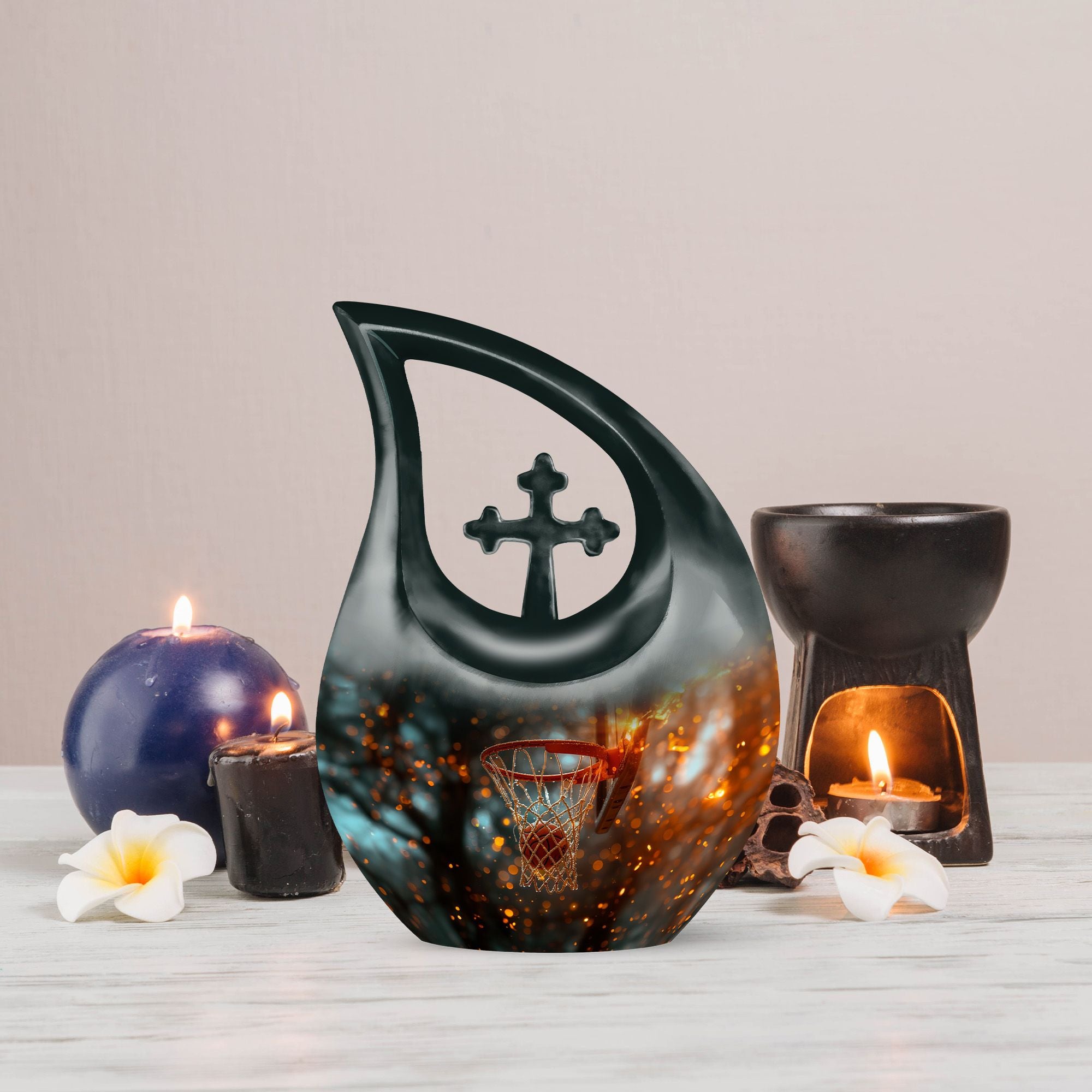 Our Basketball Urn is a perfect resting place for basketball enthusiasts, with a distinct Cross Drop design. This not-so-ordinary Large Urn measures 10 inches in height and weighs a solid 3.3 pounds. Encased in durable aluminium, the urn provides ample space with a capacity of 200 cubic inches. This premium quality item also comes with a velvet pouch for containment of ashes ensuring proper preservation. To make this more personal, we offer customization features where you can personalize it with engraved names. As our target customers often search for keywords like 'Customized Urns For Ashes For Adults', 'Unique Urns For Dad', 'Memorial Urns For Human Ashes', and 'Cremation Monuments', our urn caters to those needs filling the gap in the memorial urns market that craves for the blend of sentiment and personal touch. Please note, response to personalization requests may vary based on locale.